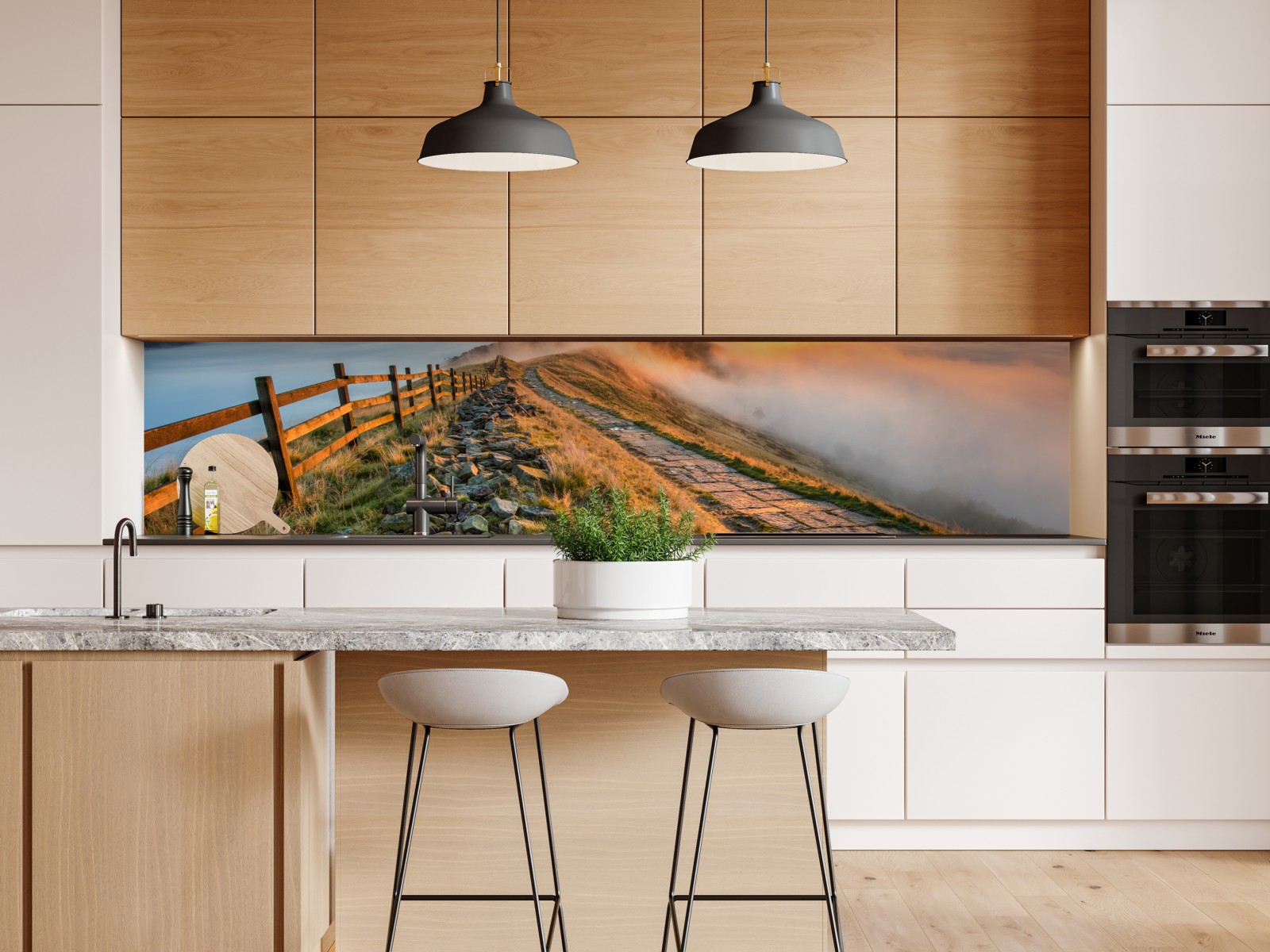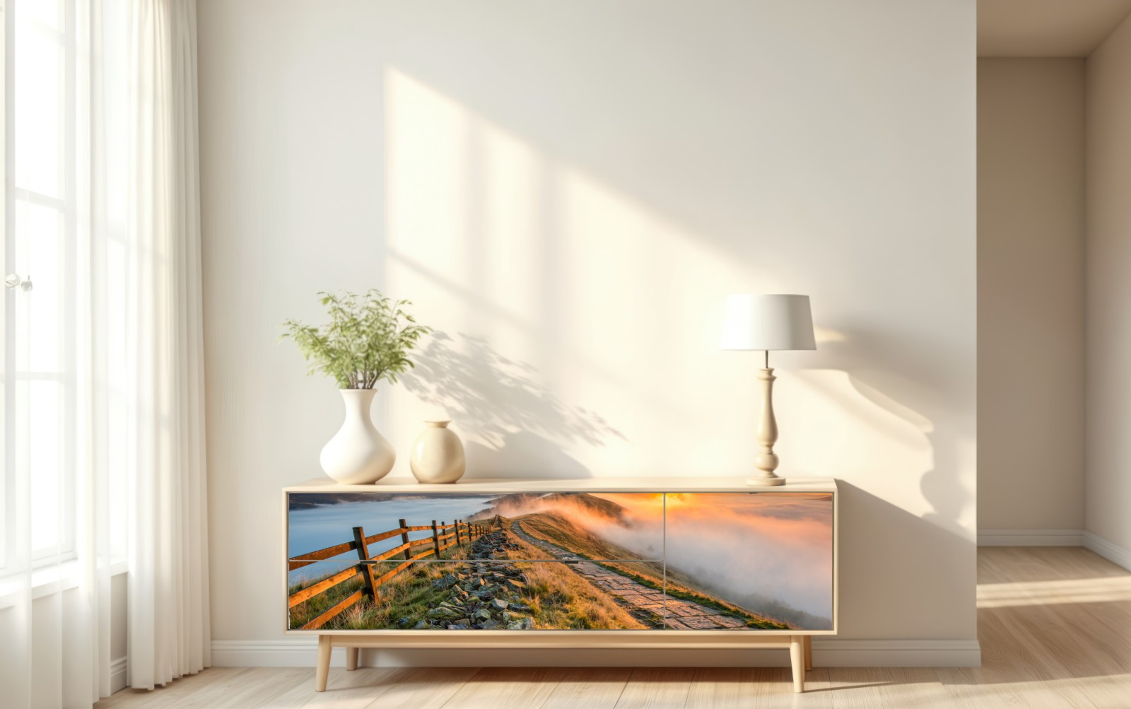 Ein atemberaubender Sonnenaufgang über nebelverhangenen Hügeln entlang eines geschwungenen Gratwegs, der ruhige natürliche Atmosphäre und warmes goldenes Licht in Ihren Raum bringt.