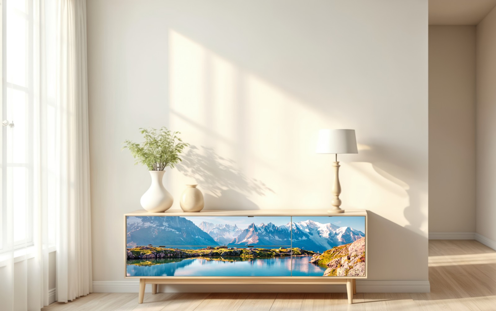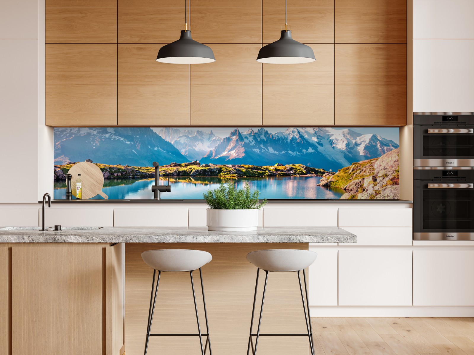 Atemberaubender Blick auf Lac Blanc mit der Spiegelung des Mont Blanc in kristallklaren Alpengewässern, der jedem Raum eine ruhige Bergatmosphäre verleiht.