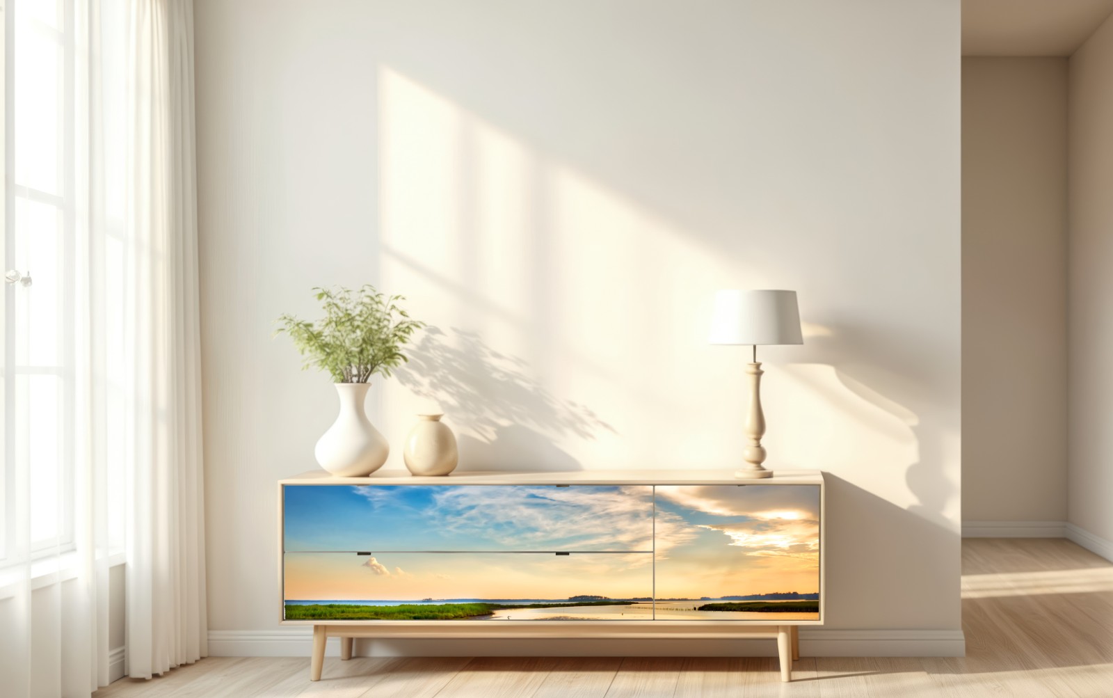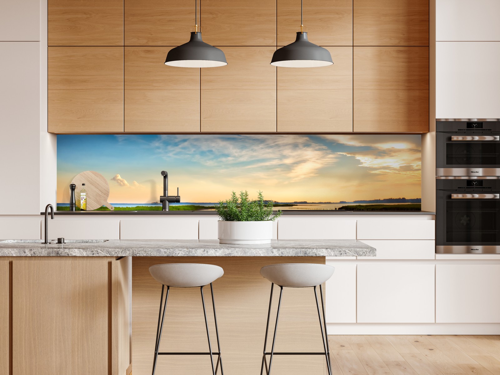Ein ruhiger Sonnenuntergang über der Chesapeake-Bucht mit einem einsamen Reiher auf einer Marschinsel, perfekt zur Gestaltung naturnaher Räume.