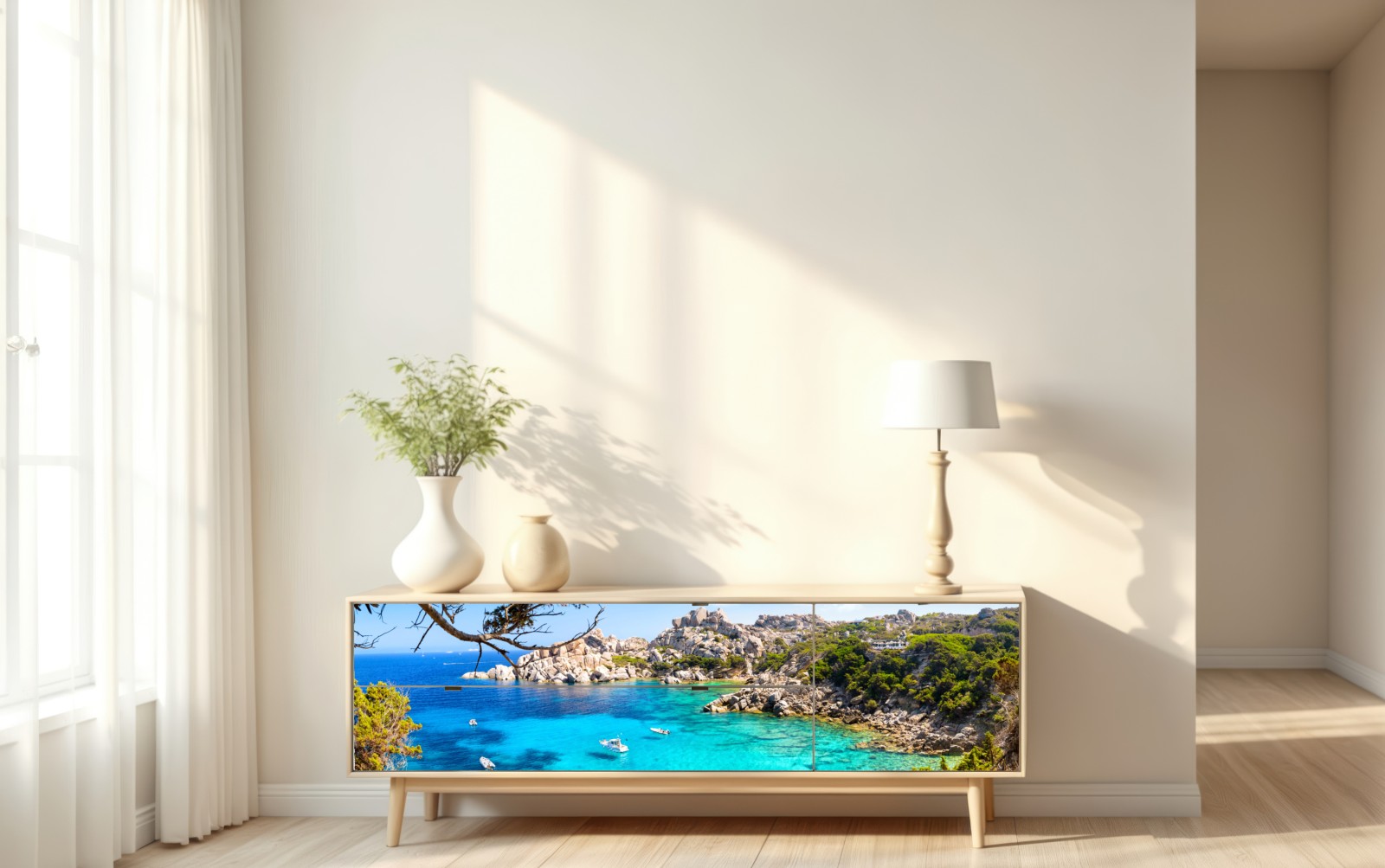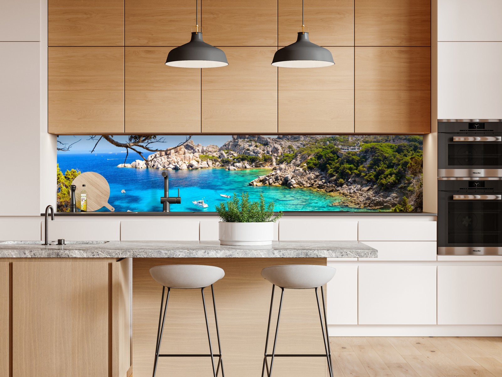 Atemberaubender Panoramablick auf eine türkisfarbene Bucht und felsige Küste, der jedem Raum eine beruhigende Meeresatmosphäre verleiht.