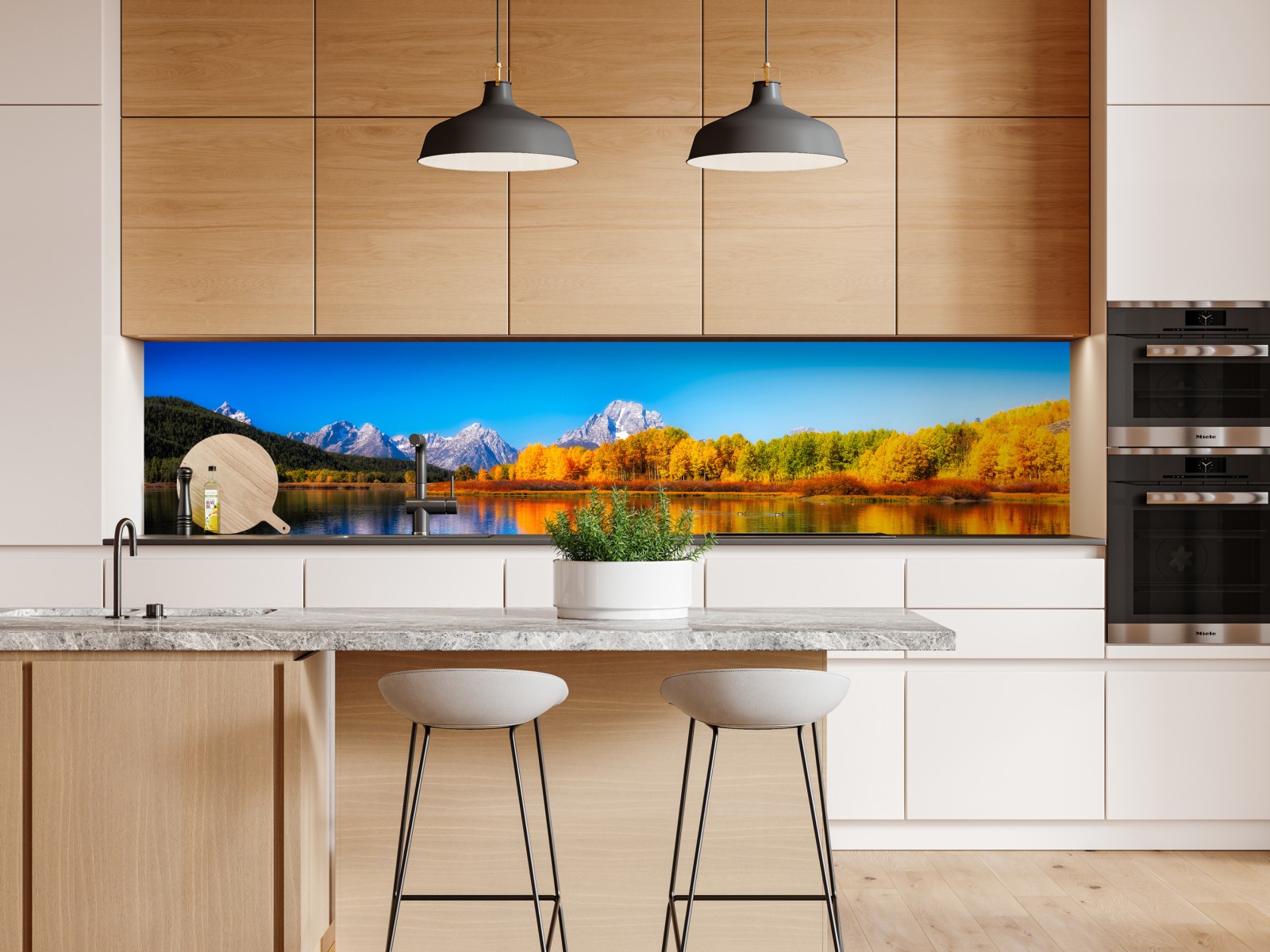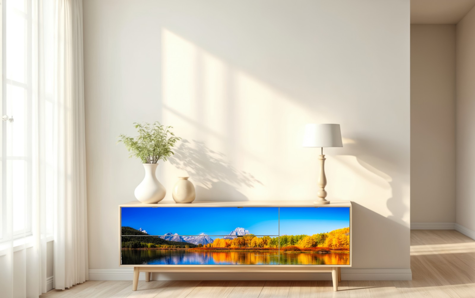Atemberaubendes herbstliches Panorama mit goldenen Bäumen, ruhigen Seenreflexionen und schneebedeckten Gipfeln, das Ruhe und natürliche Schönheit in jeden Raum bringt.