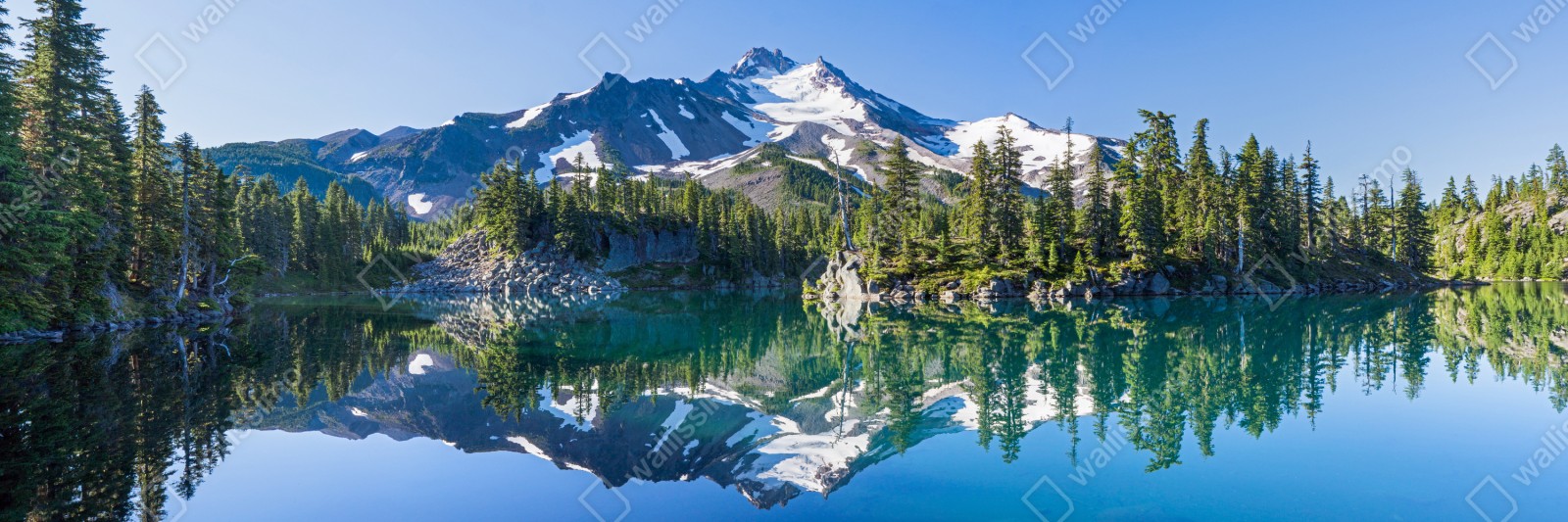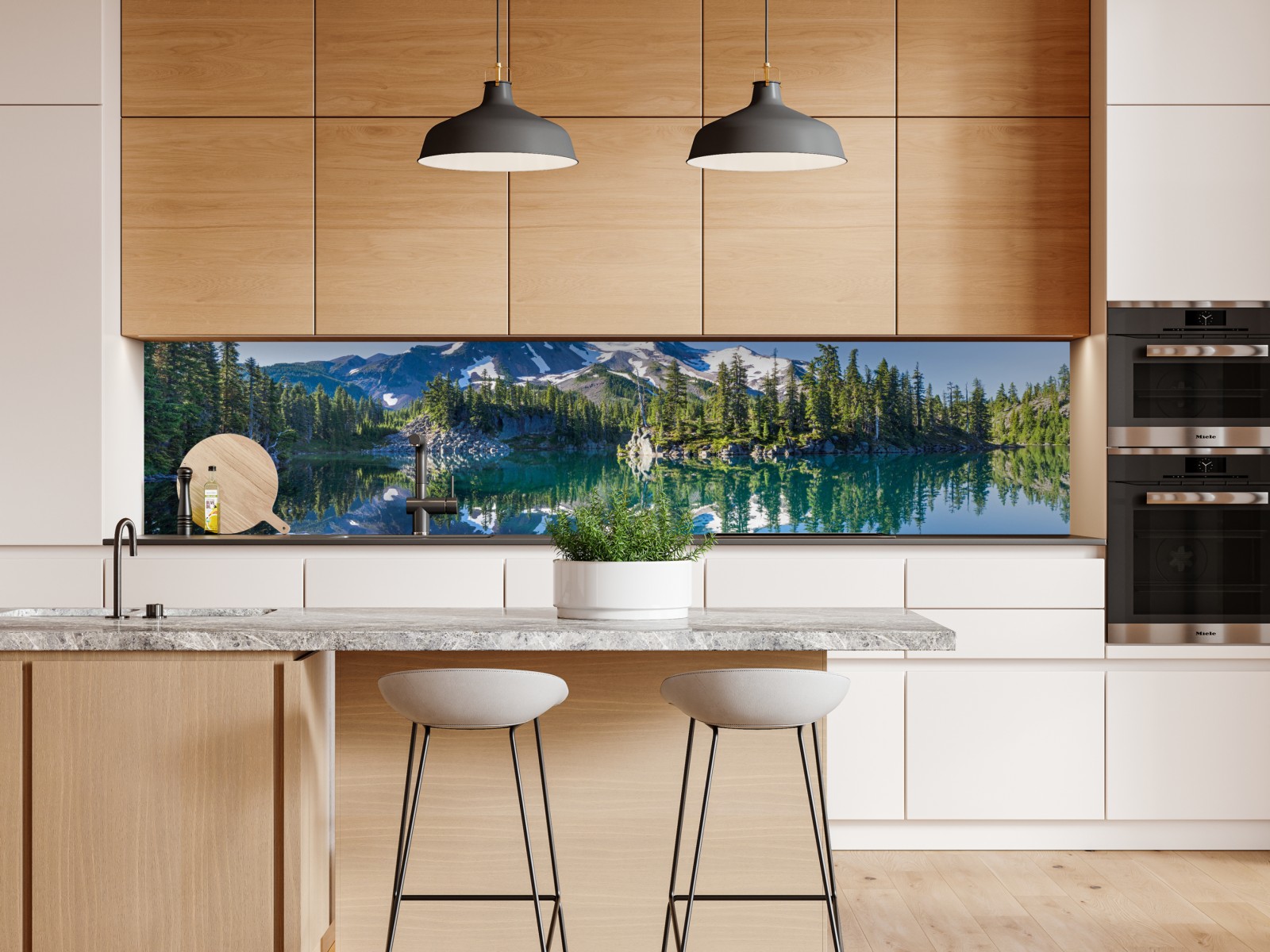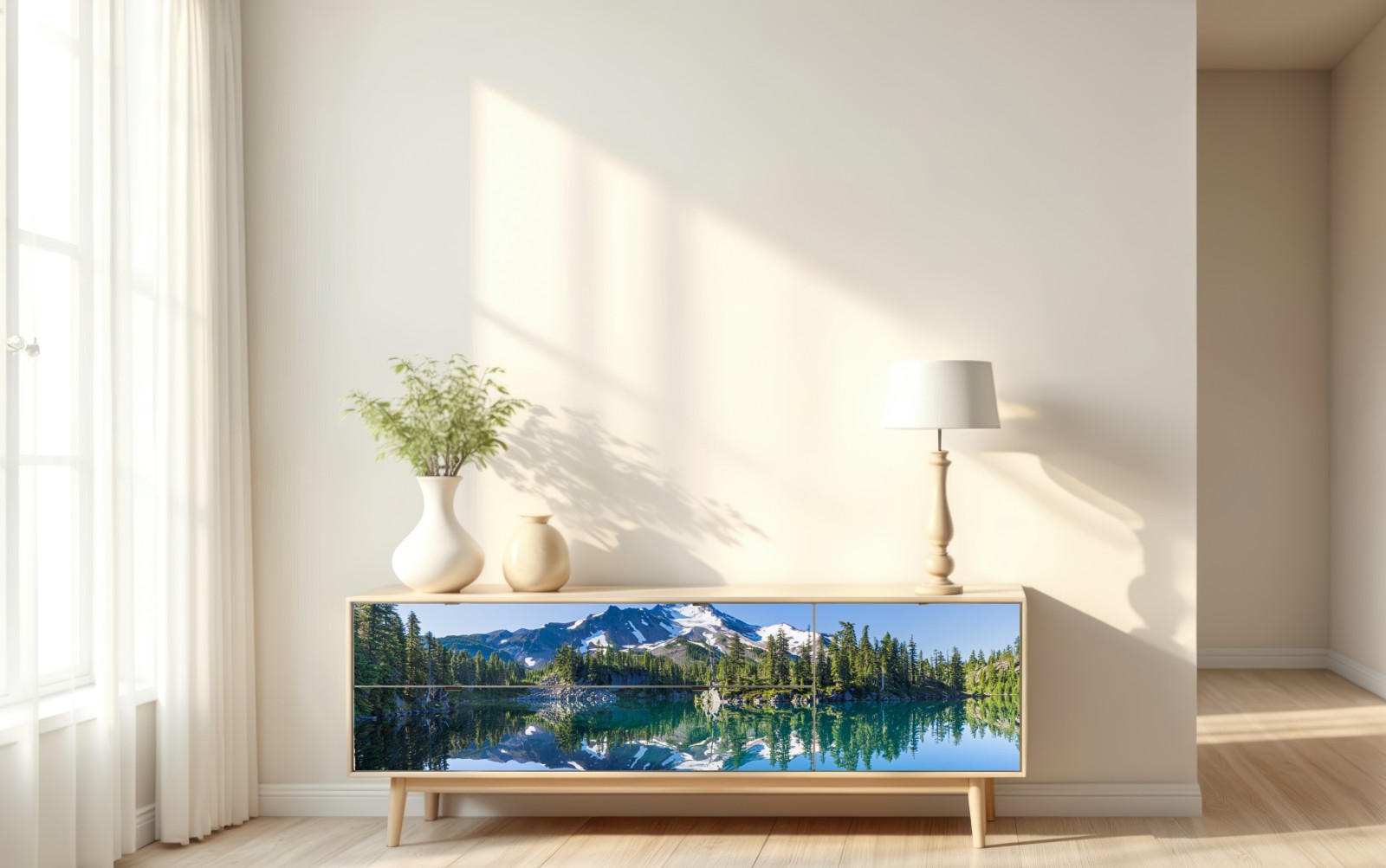 Ruhige Panoramaansicht eines Alpensees mit schneebedeckten Gipfeln, die sich in klarem Wasser spiegeln, perfekt für Räume mit naturverbundenem Ambiente.