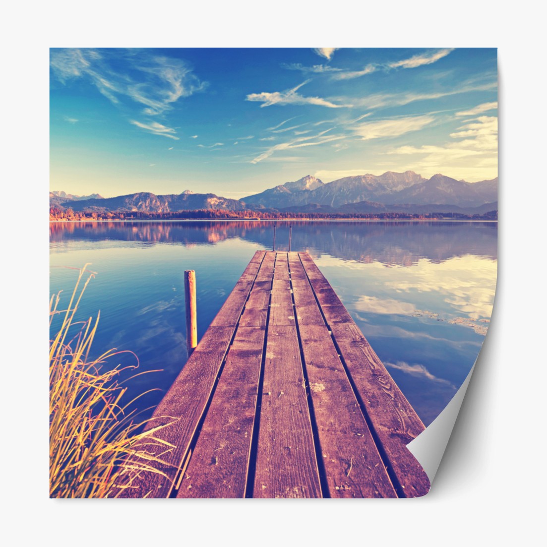 Repositionierbarer Aufkleber Holzsteg am bergsee bei sonnenaufgang