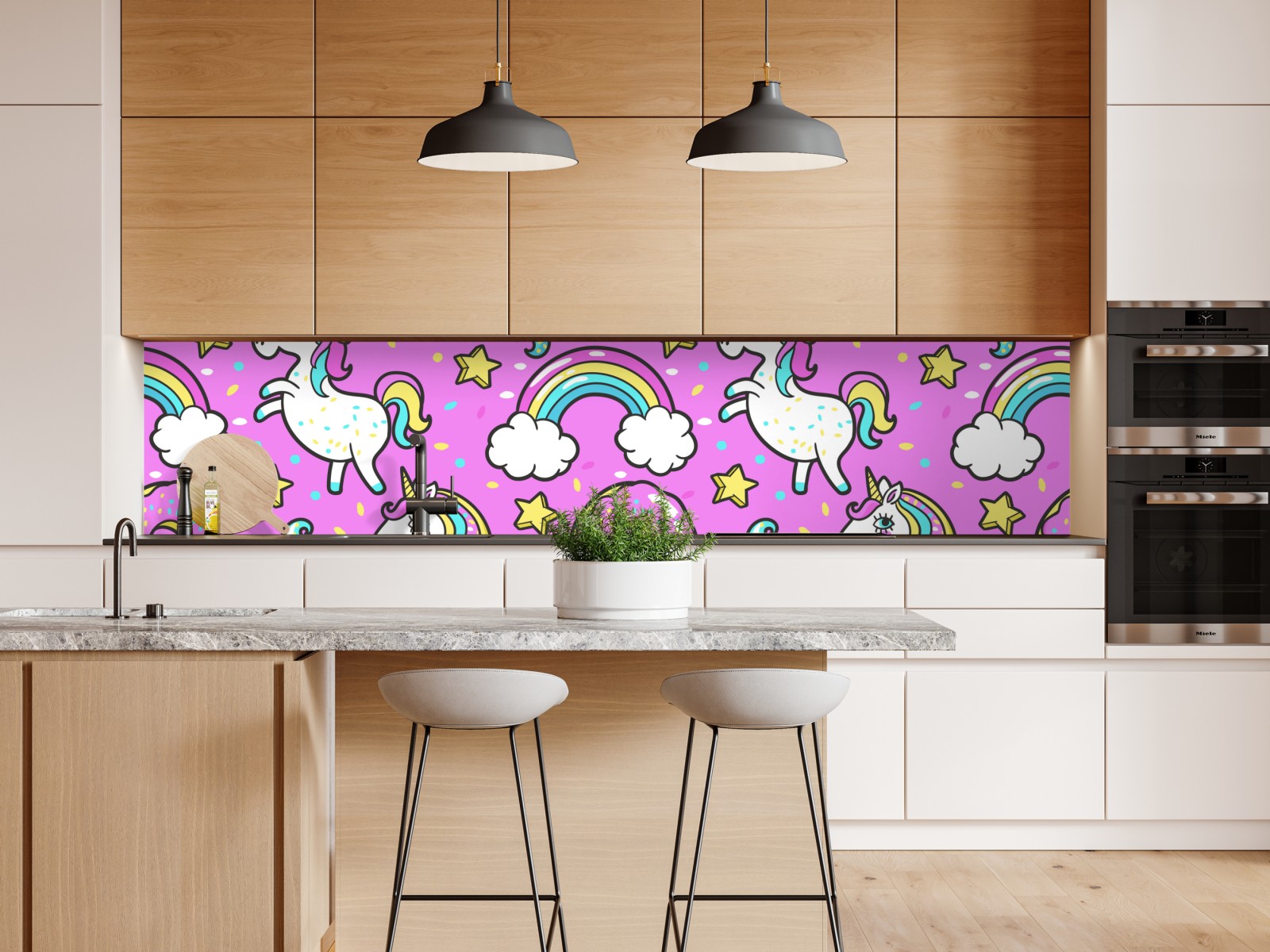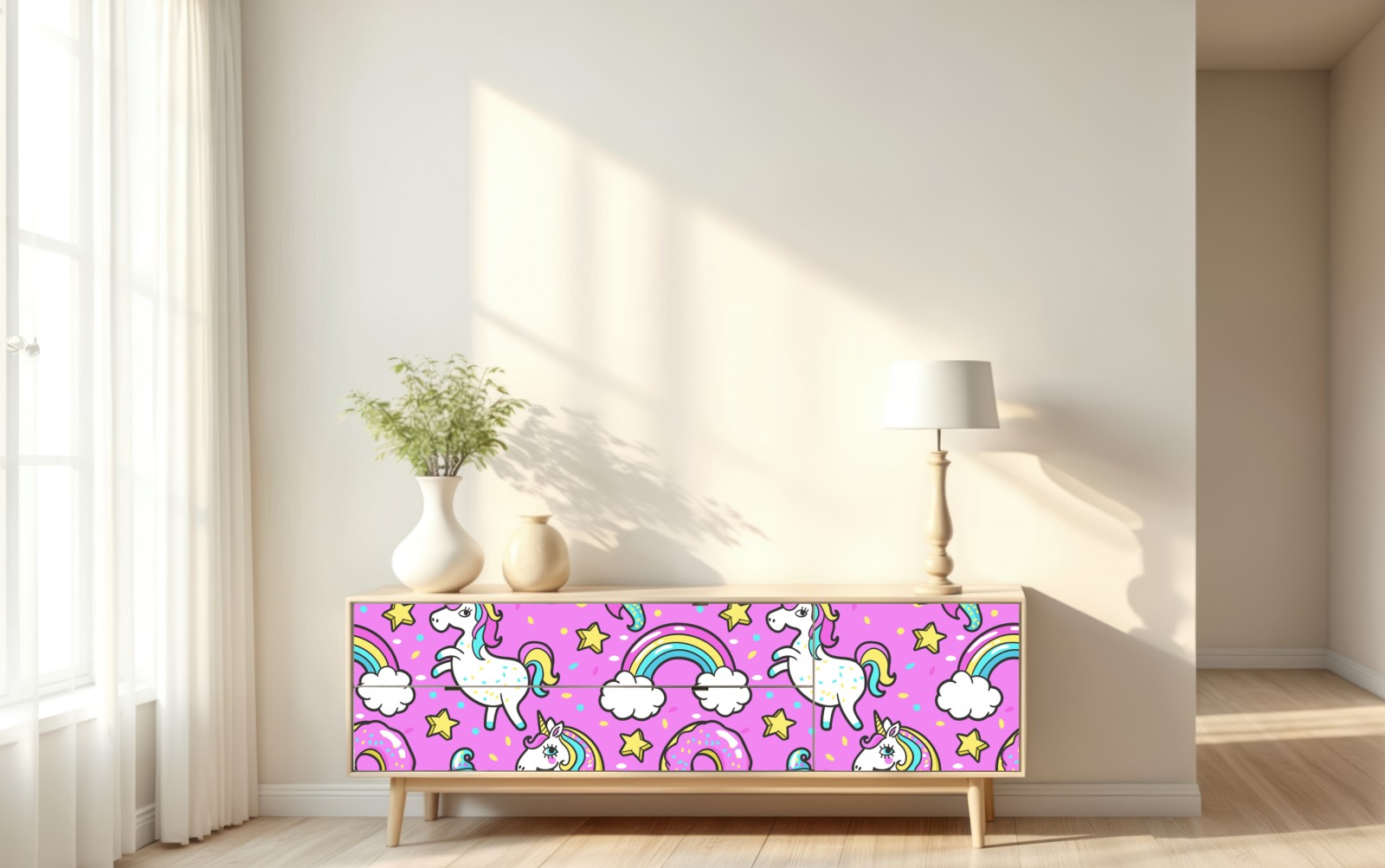 verspieltes pastellmuster mit einhörnern, regenbögen und süßigkeiten, das das kinderzimmer aufhellt.