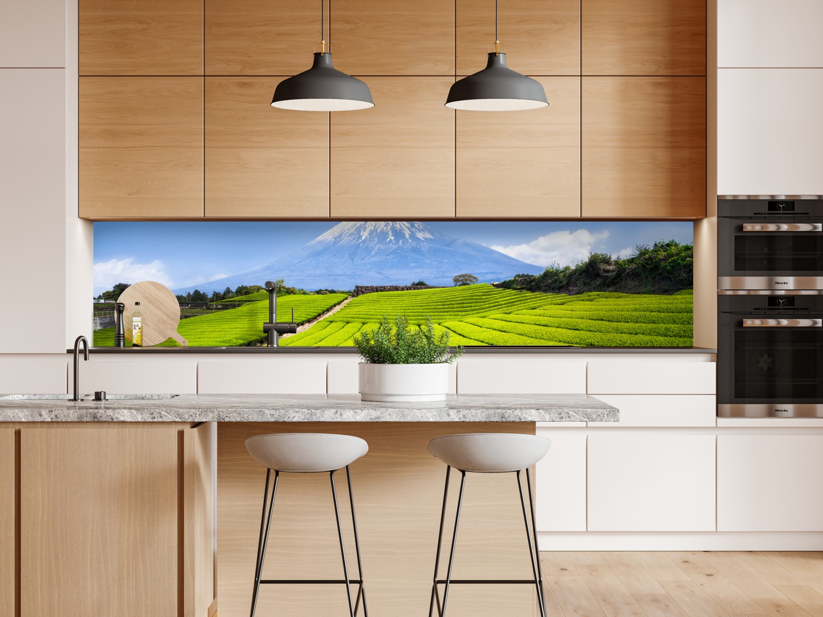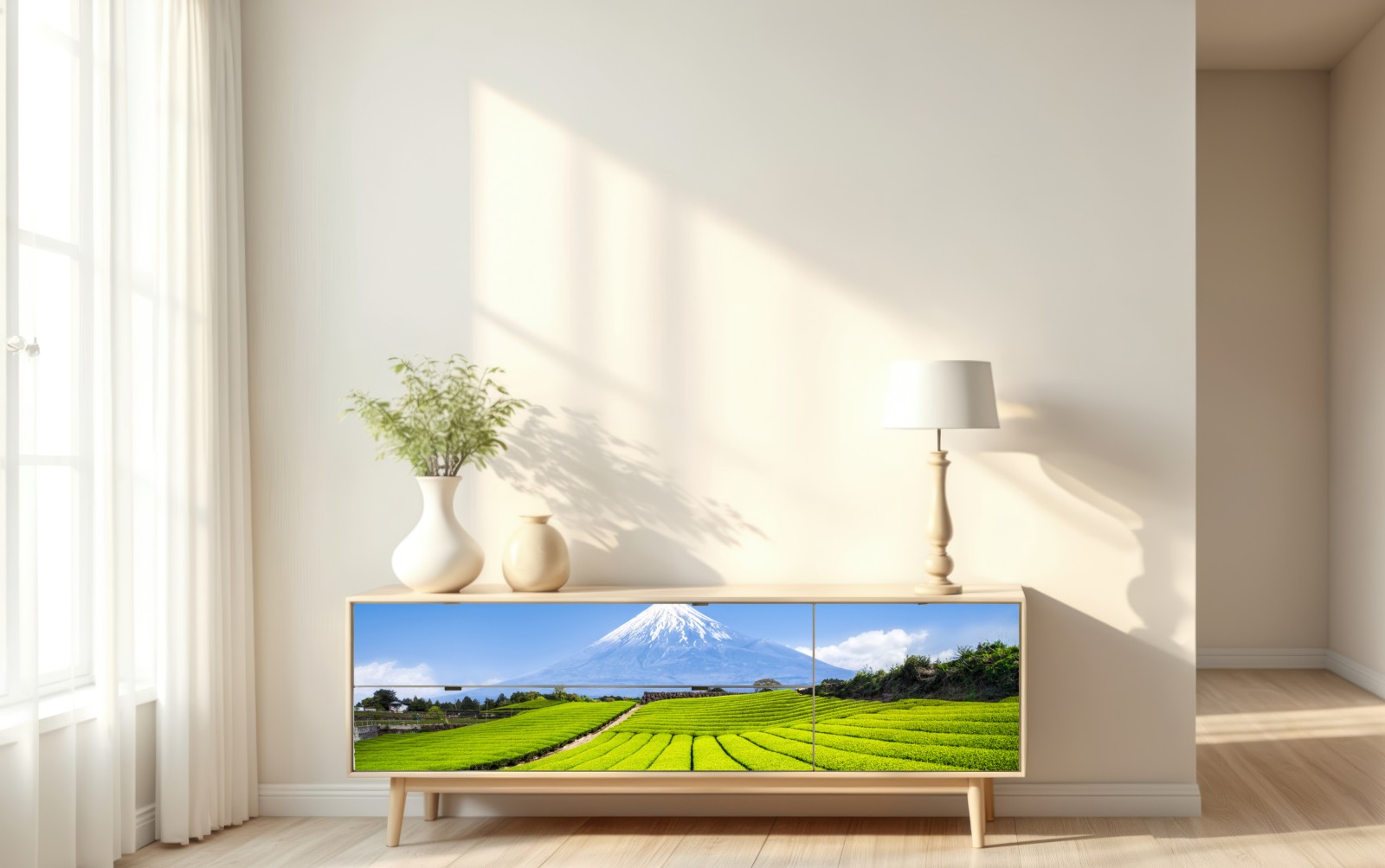 Ein ruhiger Panoramablick auf leuchtend grüne Teefelder, die sich zur majestätischen Mount Fuji erstrecken, unter klarem blauem Himmel – perfekt, um jedem Raum natürliche Gelassenheit zu verleihen.