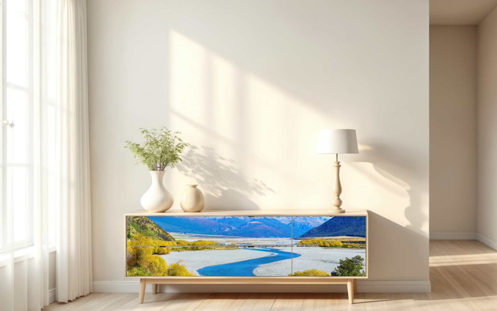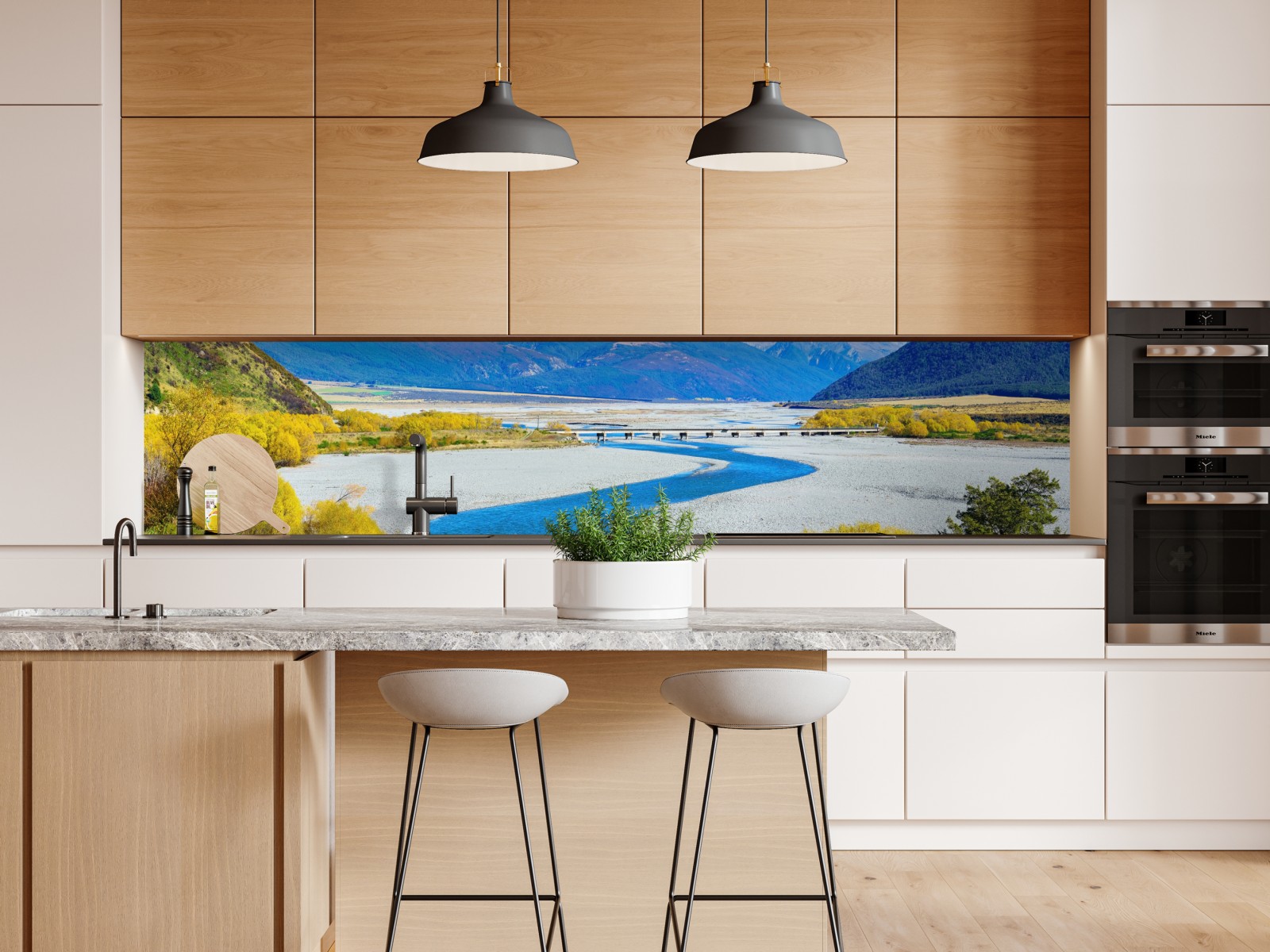 Erleben Sie die wilde Schönheit von Arthur's Pass in diesem herbstlichen Panoramabild mit einem gewundenen blauen Fluss, goldenen Bäumen und majestätischen Bergen.