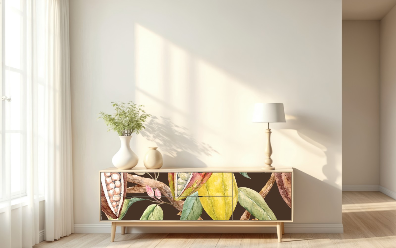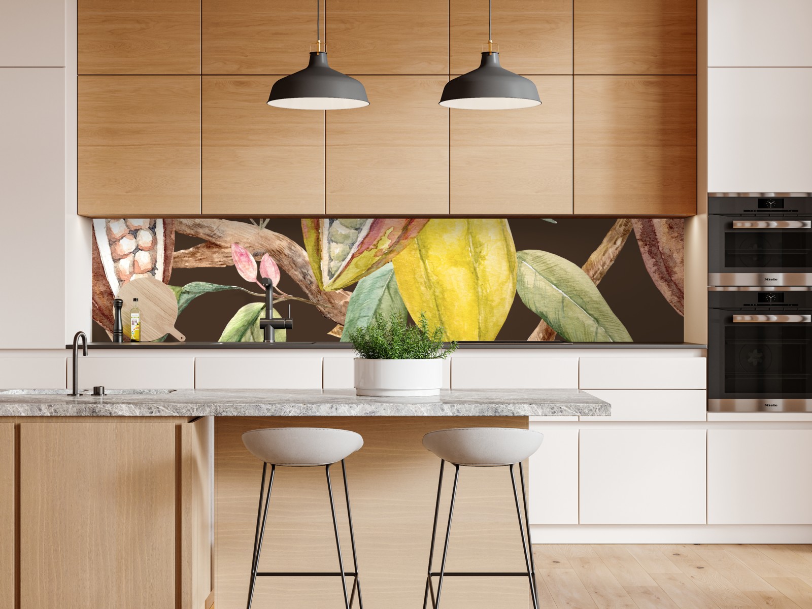 Handgezeichnete Aquarell-Kakaofrüchte und üppige Blätter schaffen ein warmes tropisches Muster, das jedem Raum natürliche Ausstrahlung verleiht.