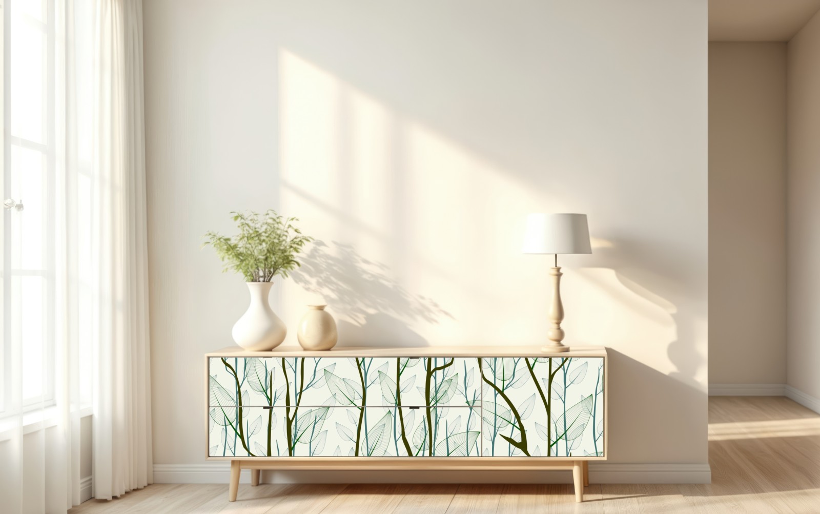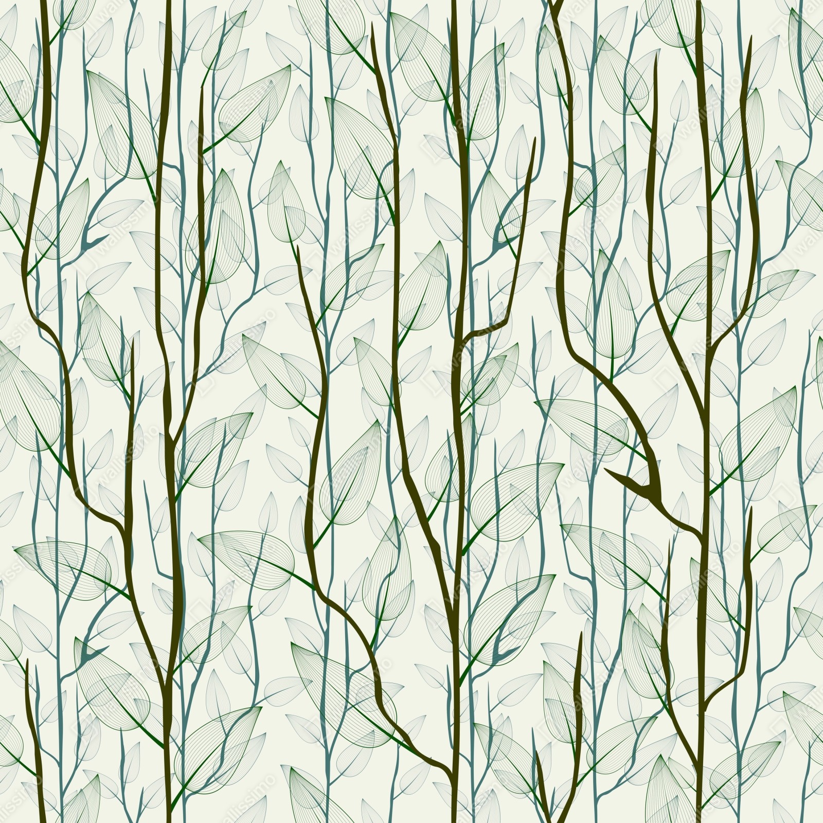 Beruhigendes botanisches Muster mit zarten grünen Zweigen und transparenten Blättern, ideal für eine naturinspirierte Einrichtung.