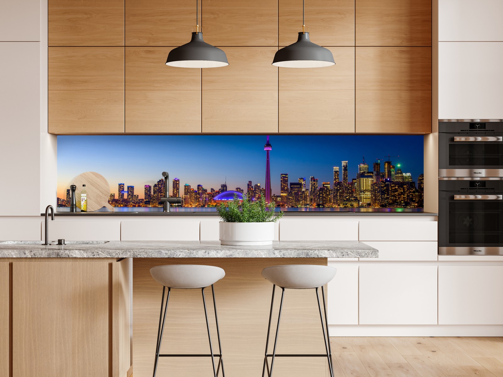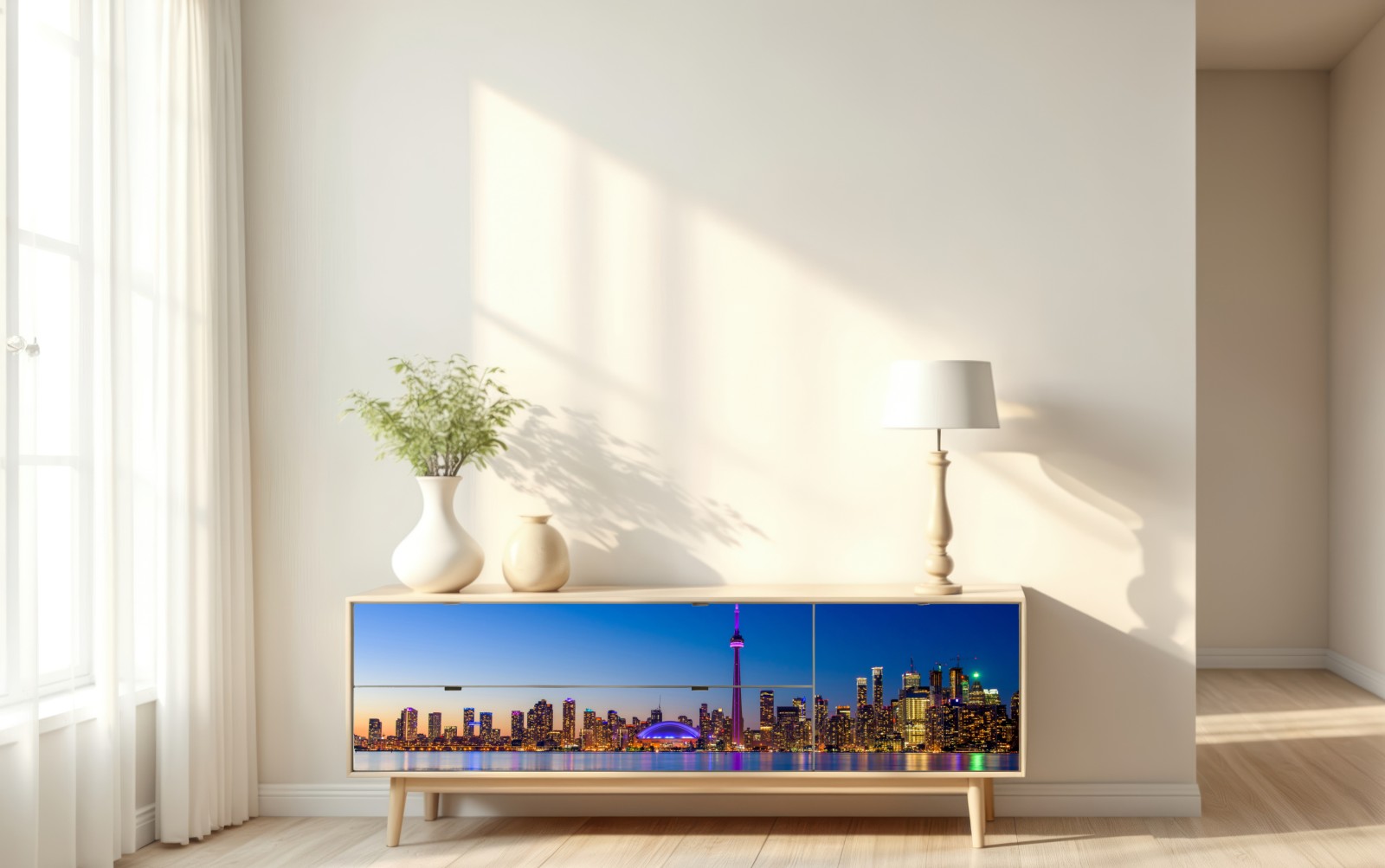 Atemberaubende panoramaansicht der beleuchteten skyline von Toronto bei dämmerung mit reflexionen im ruhigen wasser, ideal für moderne innenräume und urbane dekoration.