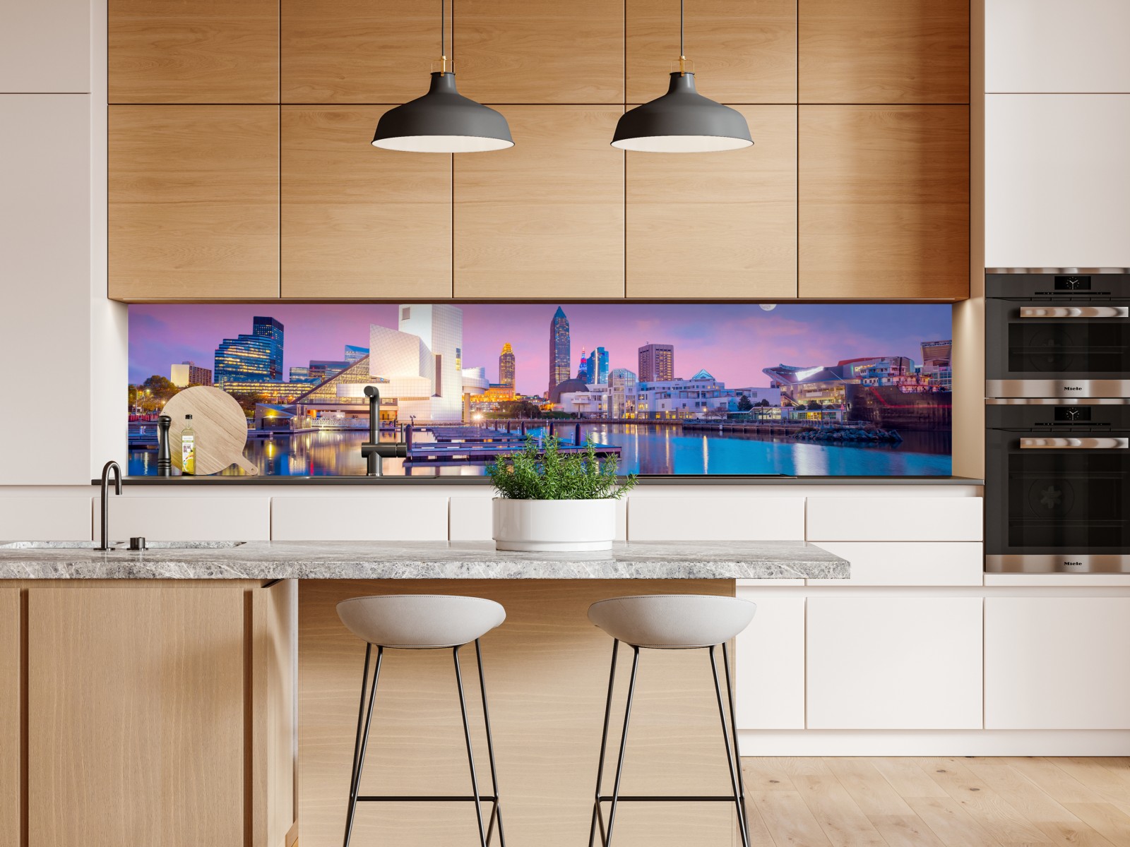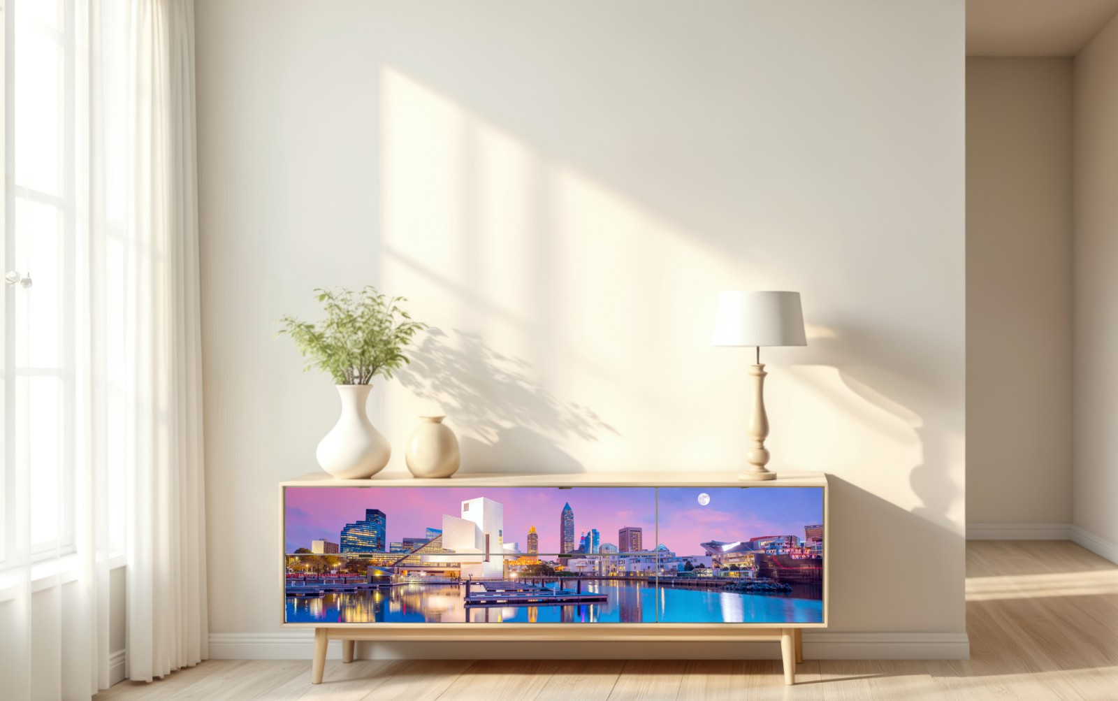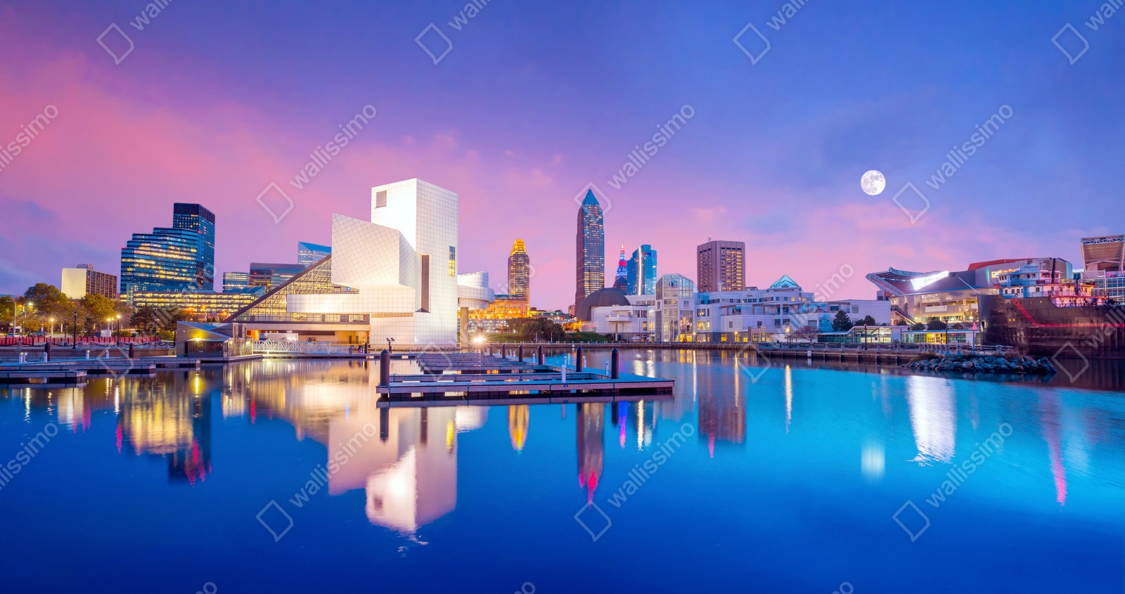 Ruhige Hafenansicht von Cleveland in der Dämmerung, ideal um modernen urbanen Flair und beruhigende blaue Töne in Ihr Interieur zu bringen.