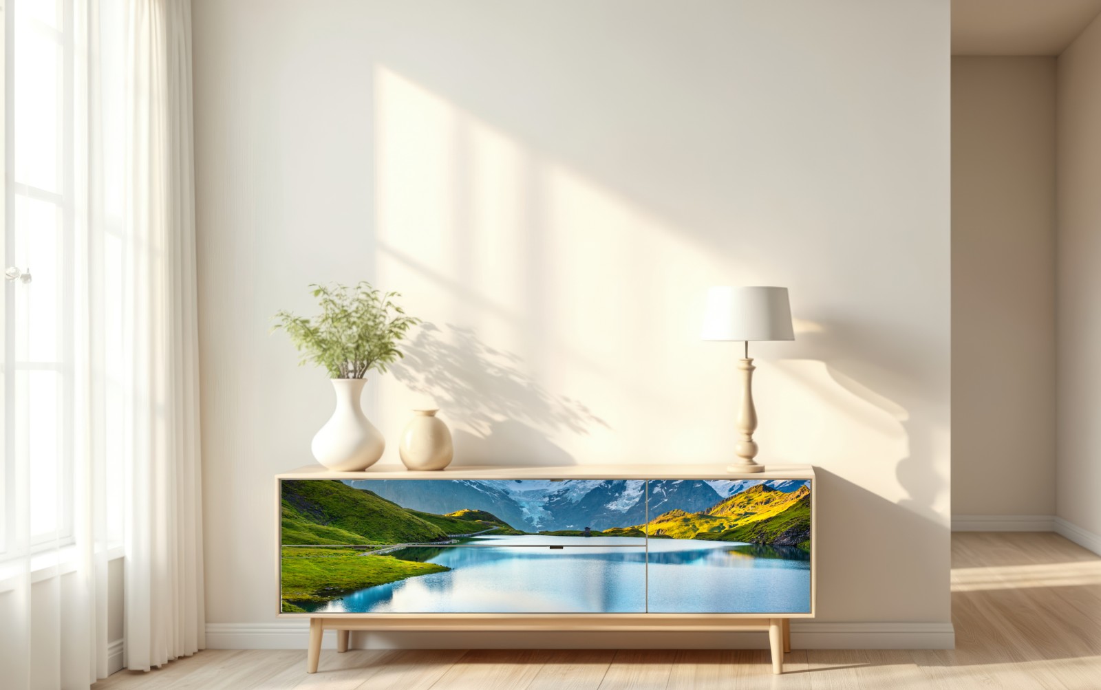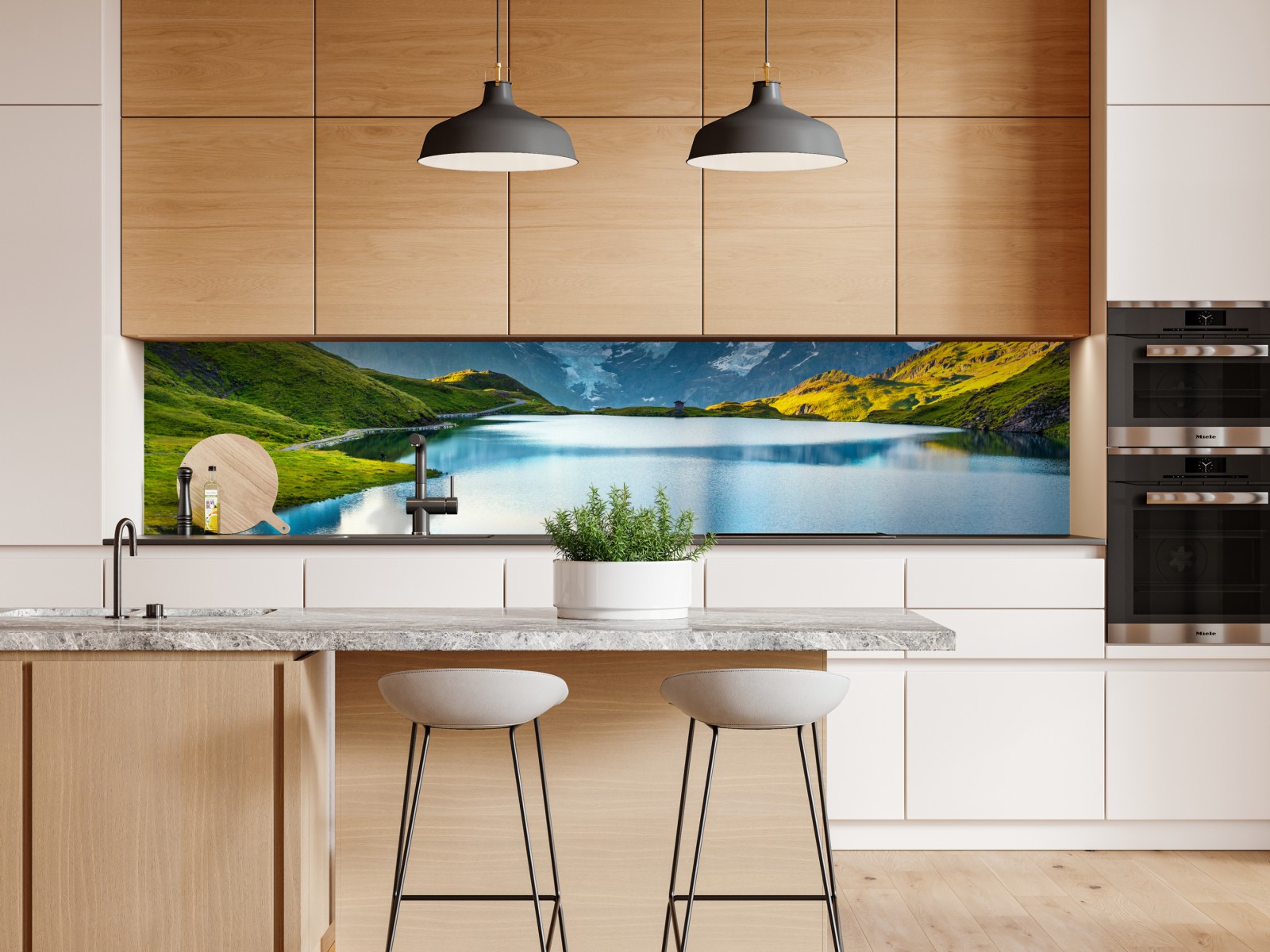 Bringen Sie Ruhe und natürliche Schönheit in Ihren Raum mit diesem lebendigen Foto eines alpinen Sees, der majestätische Berggipfel in der Schweiz reflektiert.