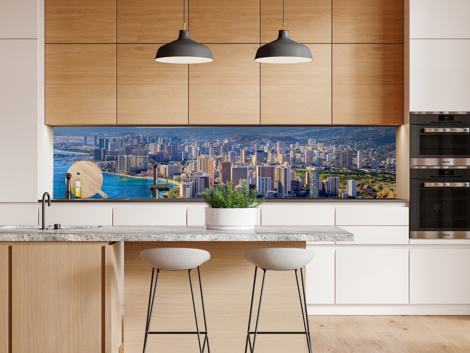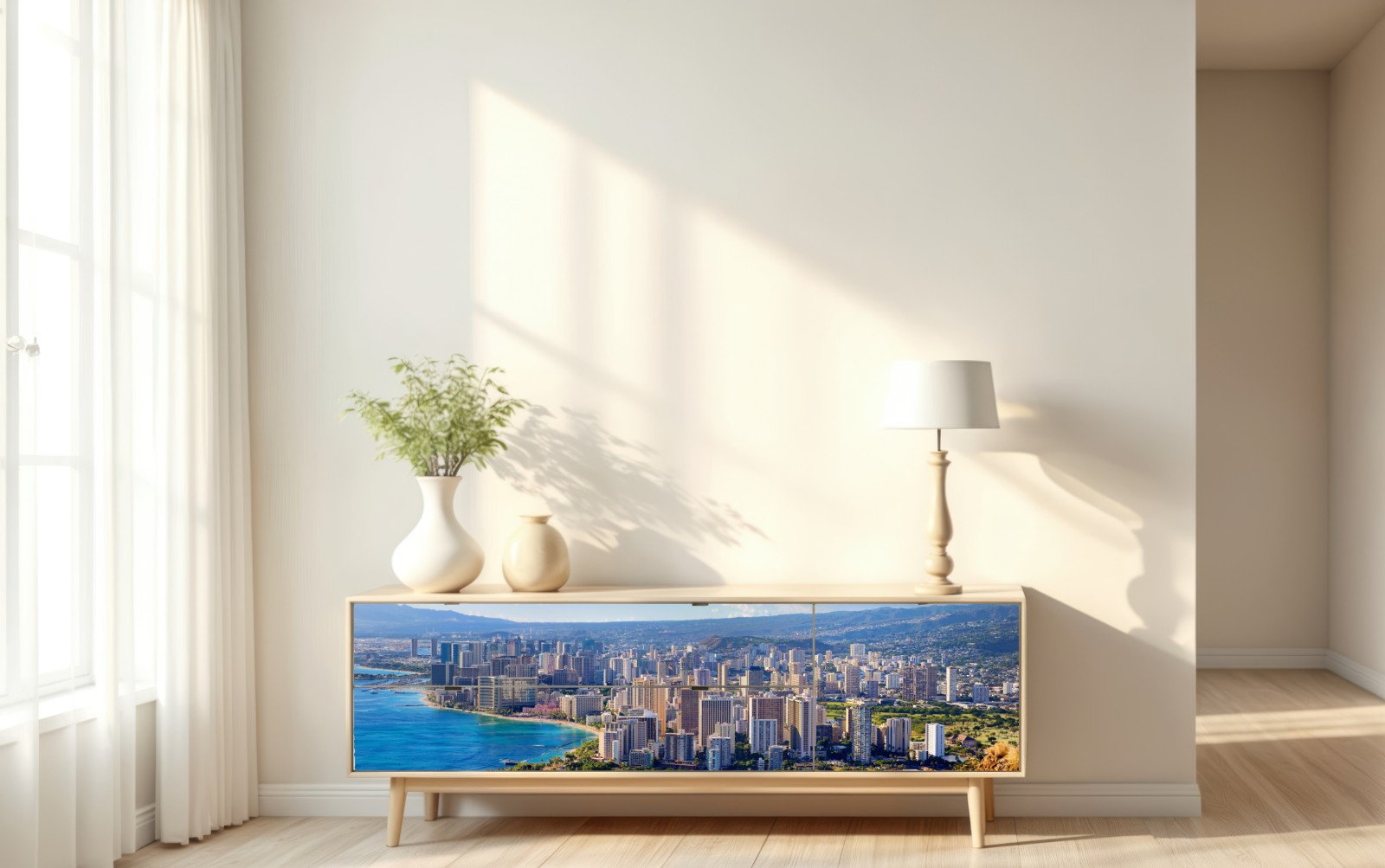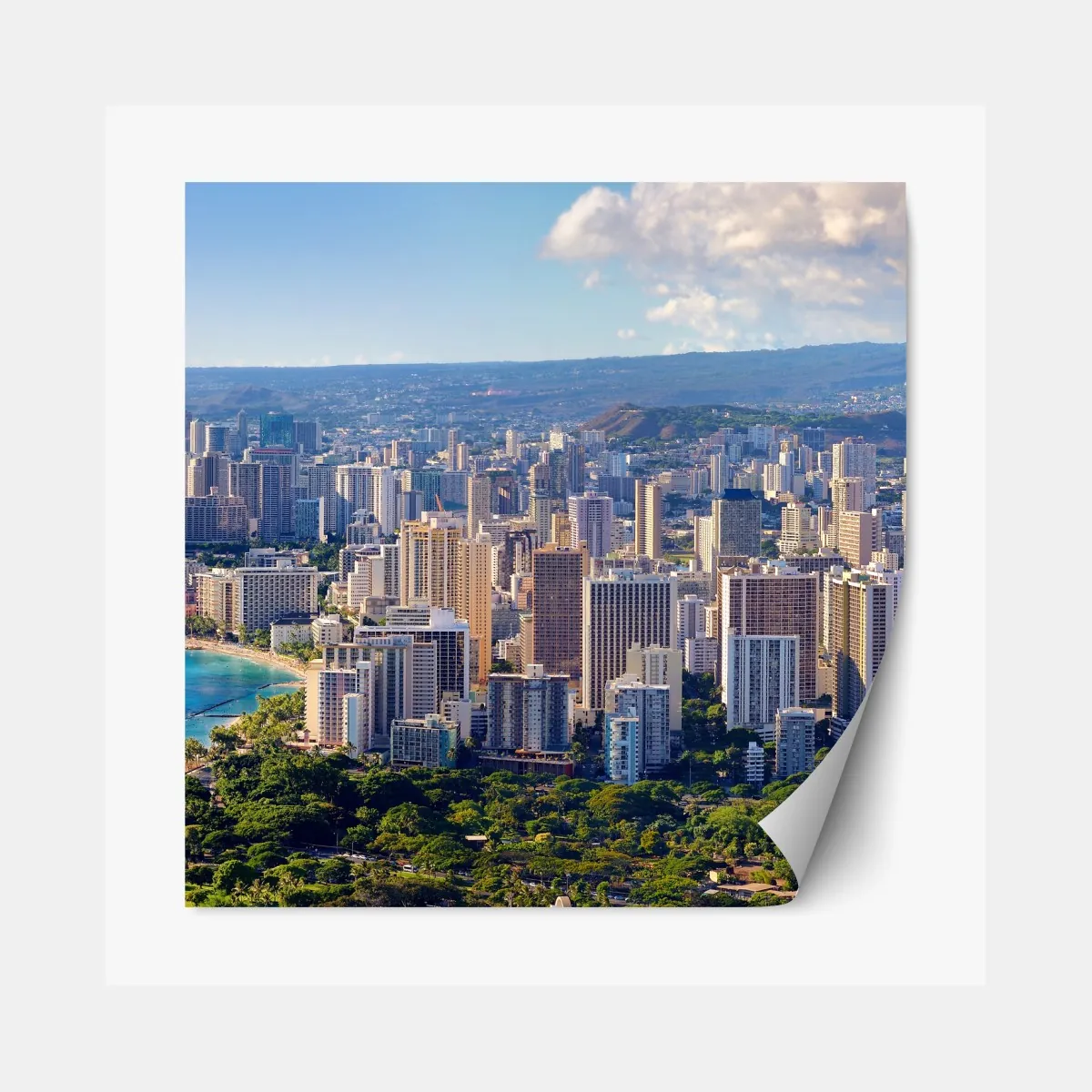 Lebendiger Panoramablick auf eine tropische Küstenstadt mit türkisblauem Wasser, Sandstränden und hohen Wolkenkratzern – perfekt, um Räumen urbanes Flair zu verleihen.