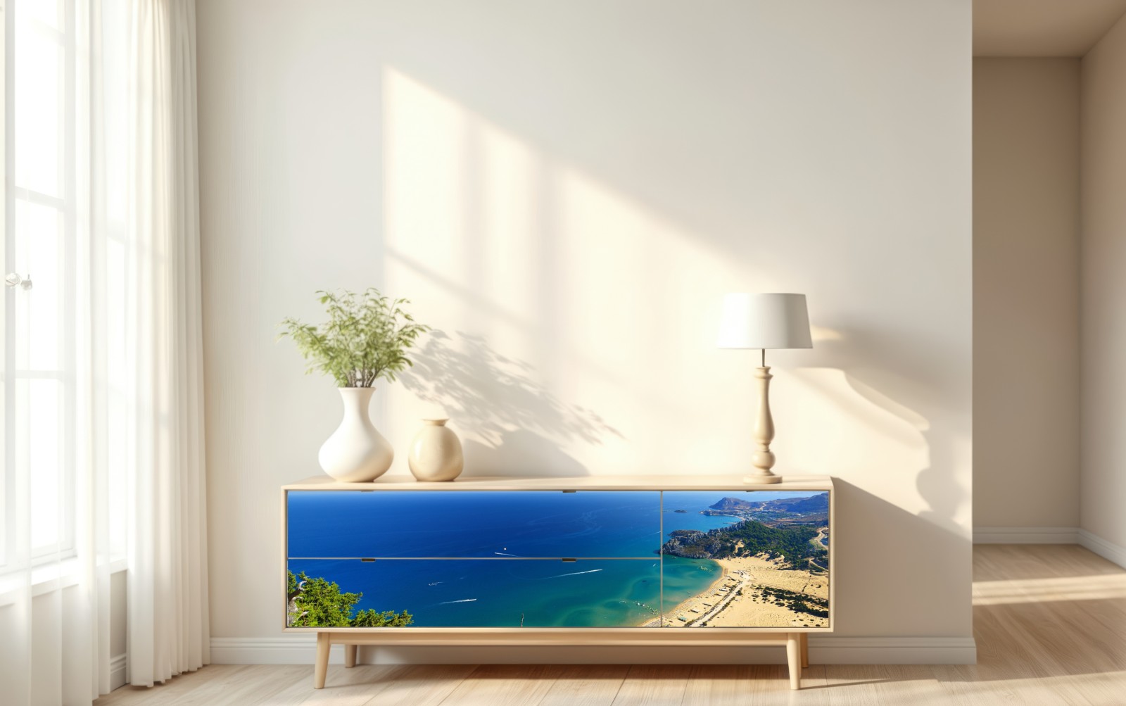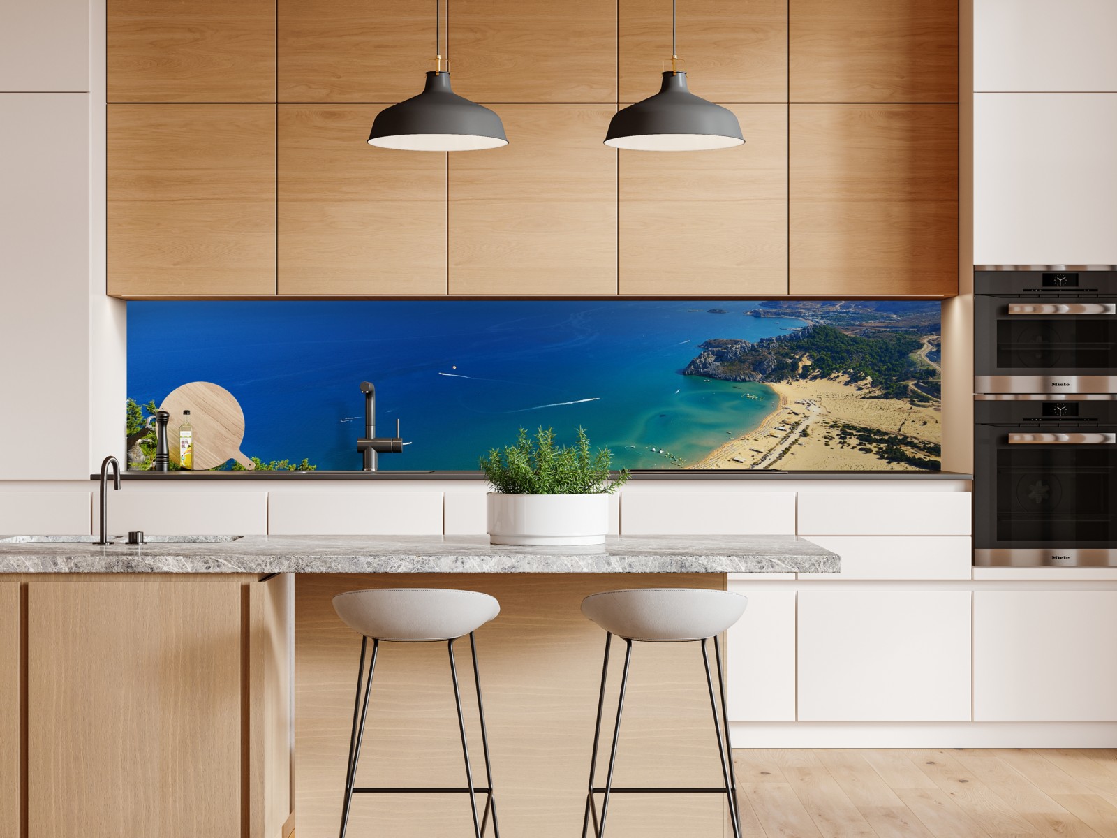 Bringen Sie Meeresruhe ins Zuhause mit diesem lebendigen Panorama, das ozeanblaue Farben und sonnenverwöhnte Strände zeigt.