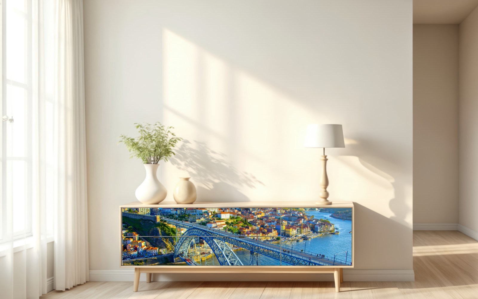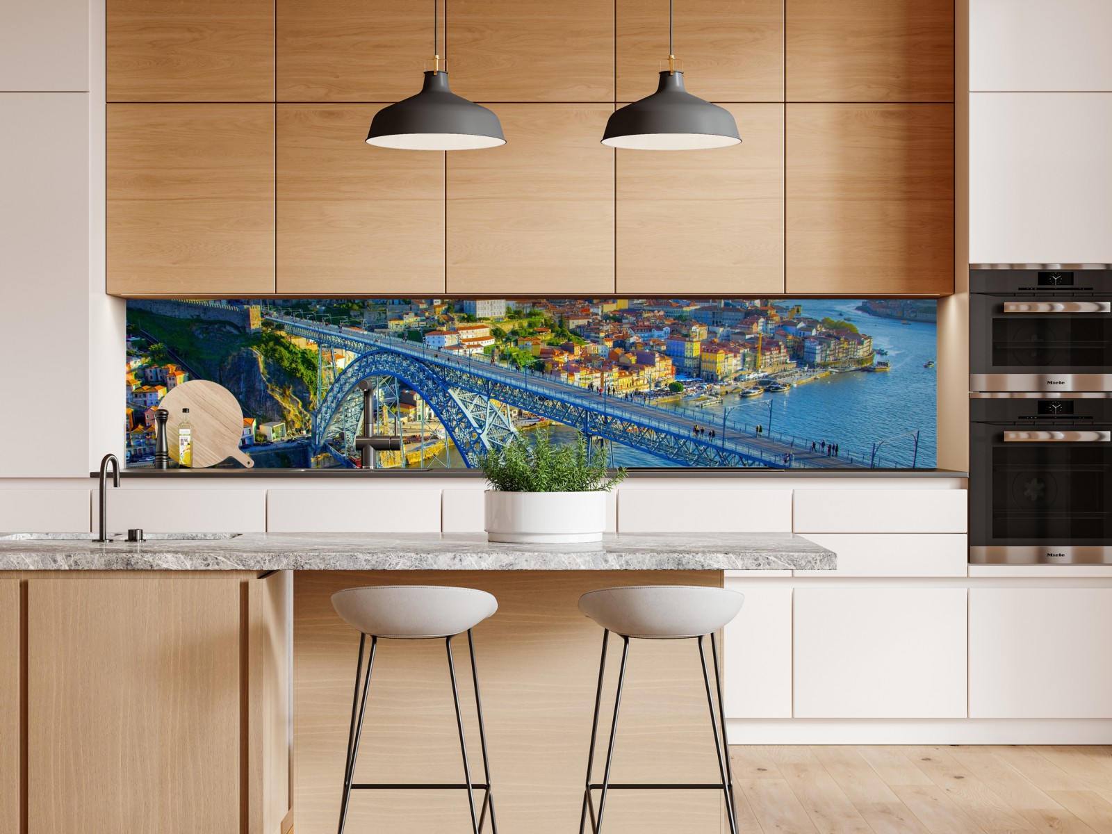 lebendige panoramaaufnahme von Porto und der brücke bei goldenem licht verleiht räumen eine warme, urbane atmosphäre.