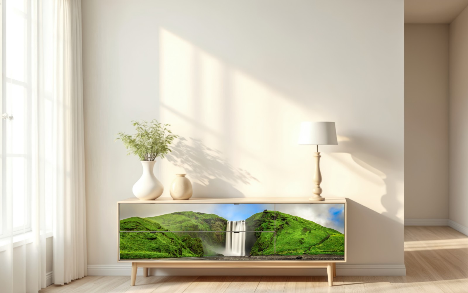 Atemberaubende Panoramaaufnahme des Wasserfalls Skogafoss in Island mit samtigem Wasser durch Langzeitbelichtung und intensiven grünen Hügeln, perfekt für Wohnräume.