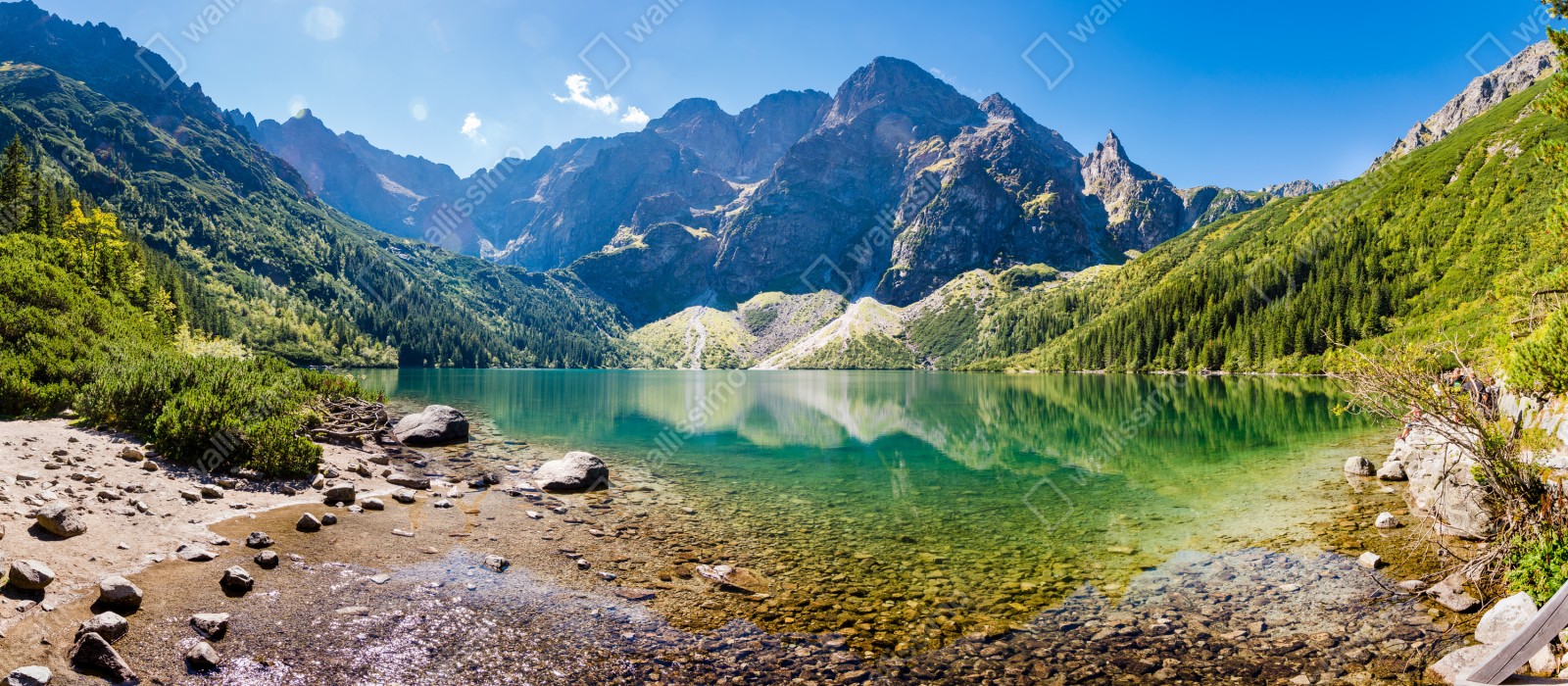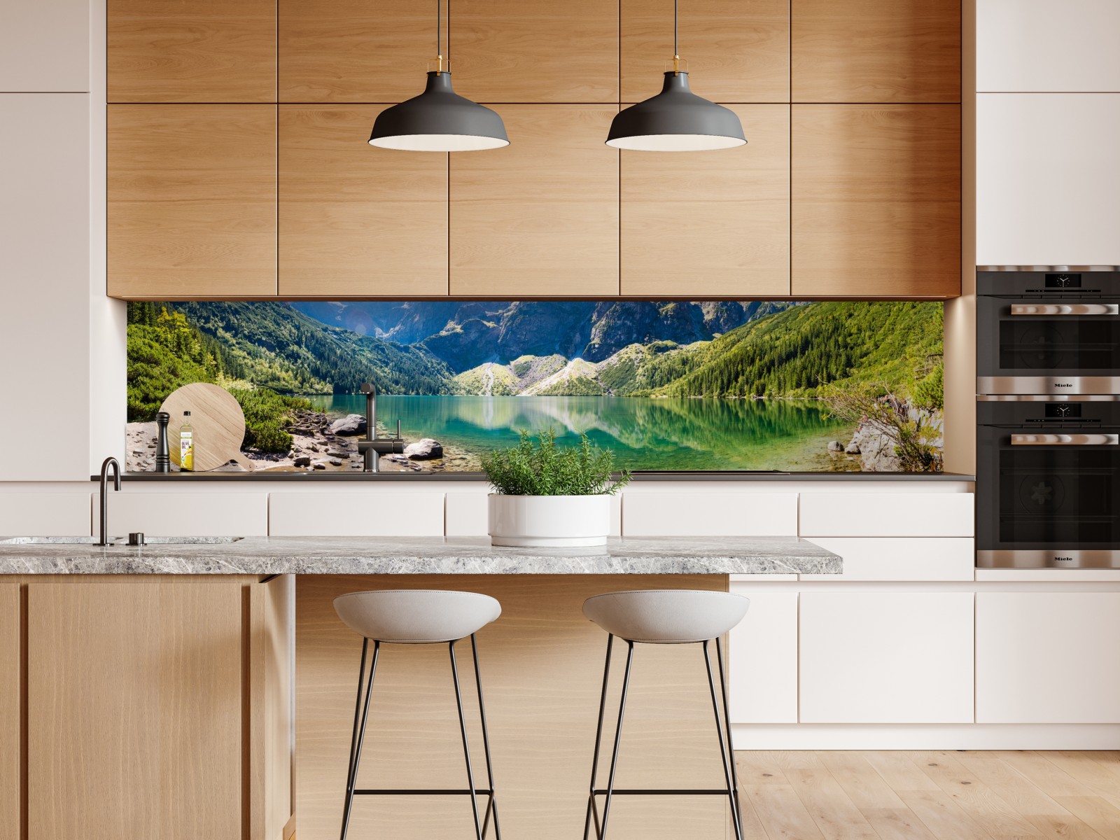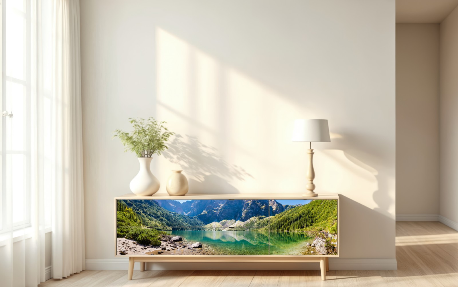 Ein ruhiger Panoramaausblick auf einen alpinen See mit kristallklarem türkisfarbenem Wasser und steilen Bergen, perfekt um Natur und Ruhe ins Zuhause zu bringen.