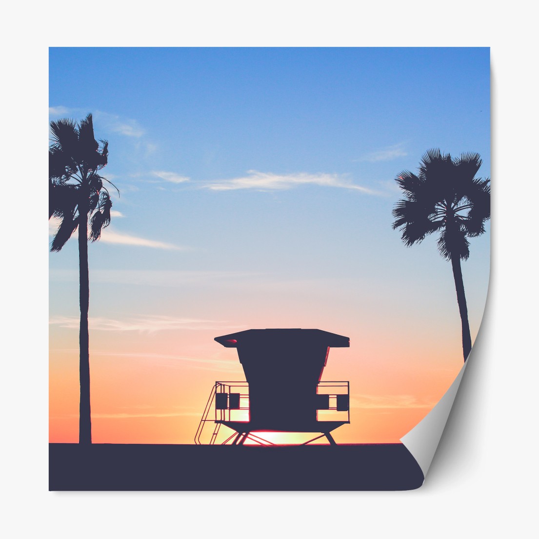 Repositionierbarer Aufkleber Sonnenuntergang am strand mit palmen und rettungsturm