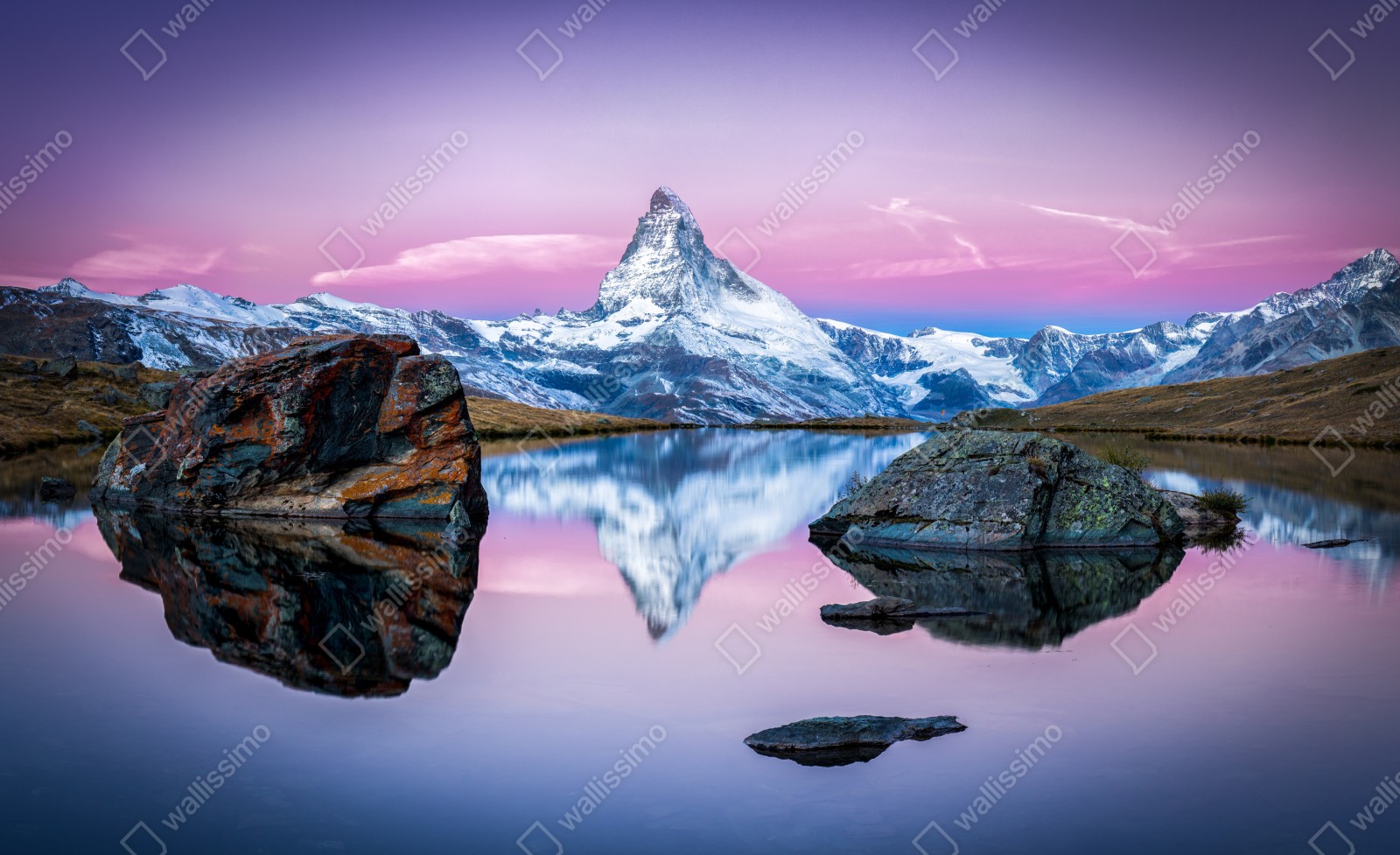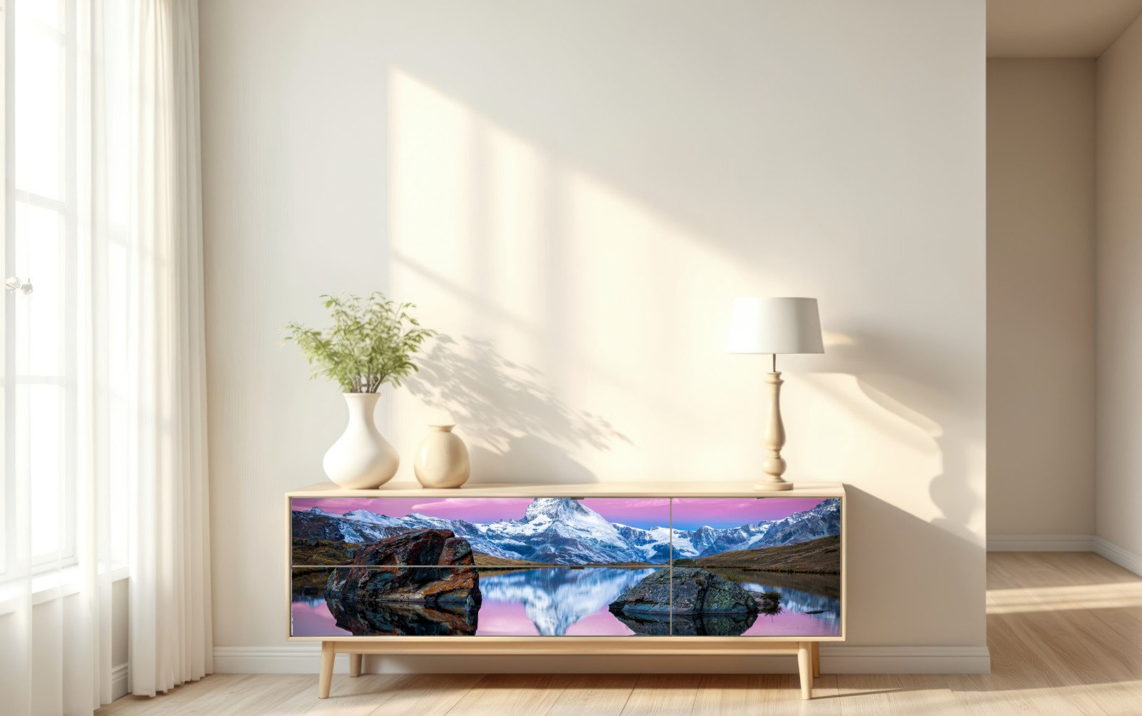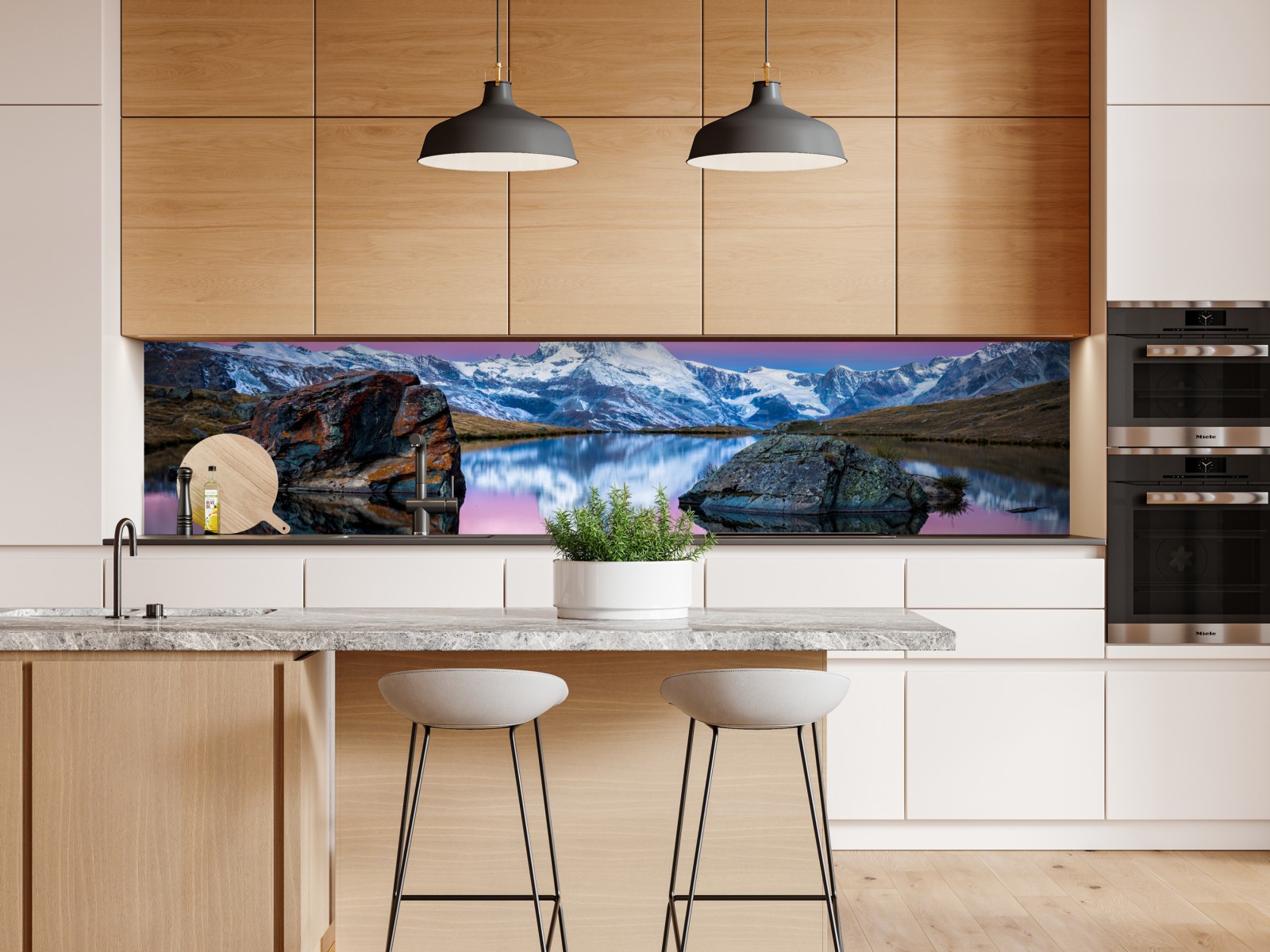 Bringen Sie Ruhe und natürliche Schönheit in Ihren Raum mit dieser lebendigen Ansicht eines Alpenbergs, der bei Sonnenuntergang im ruhigen See gespiegelt wird.