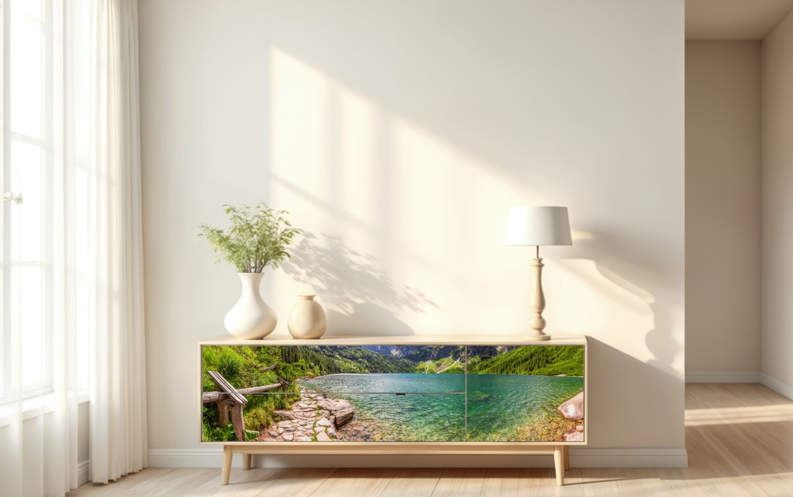 Bringen Sie alpine Ruhe in Ihr Zuhause mit diesem Panorama von See und Bergen, ideal für Wohnzimmer oder Büro.