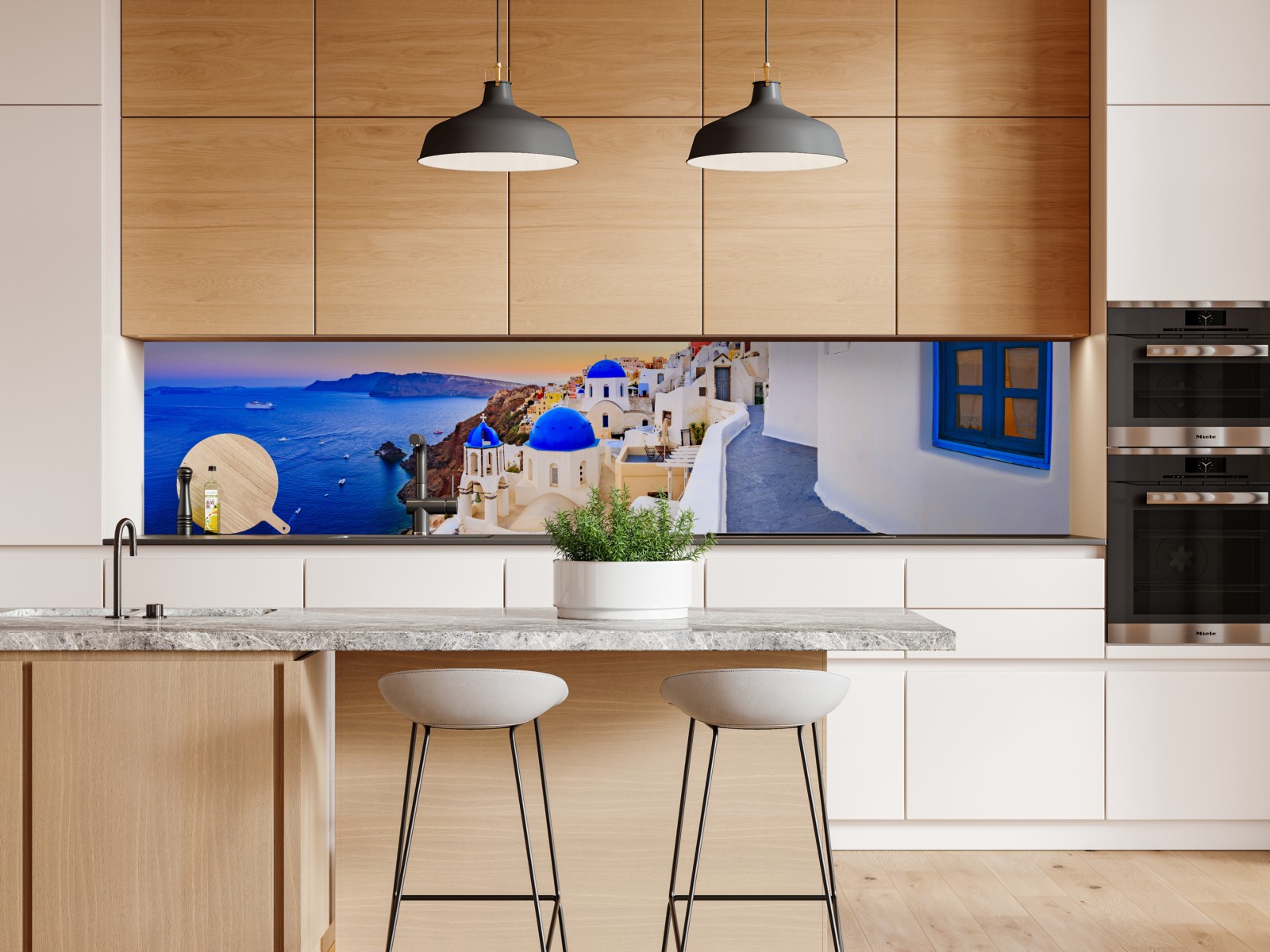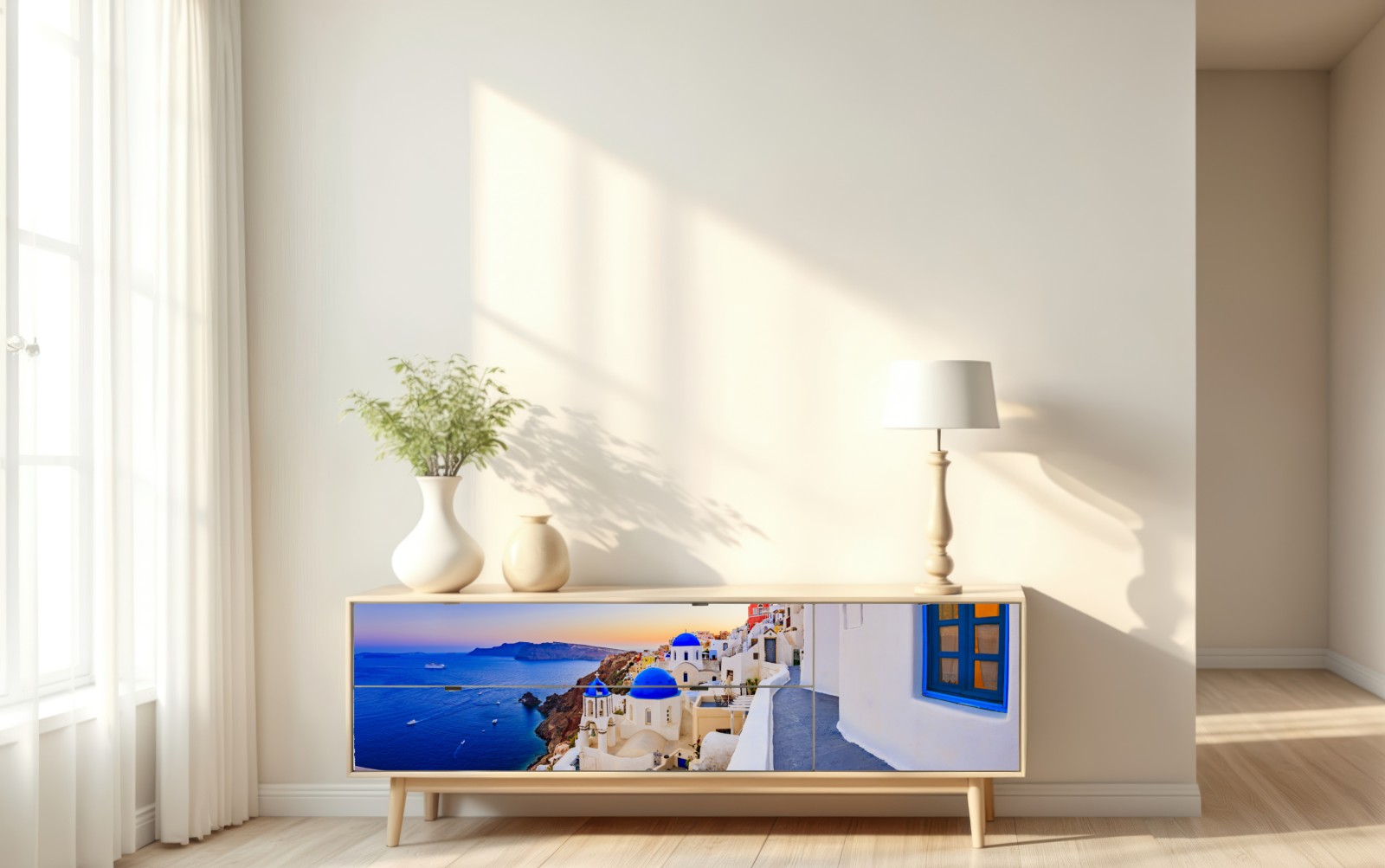 Bringen Sie mediterrane Ruhe ins Zuhause mit einer Panoramaansicht weiß getünchter Häuser und den typischen blauen Kuppeln bei Sonnenuntergang.