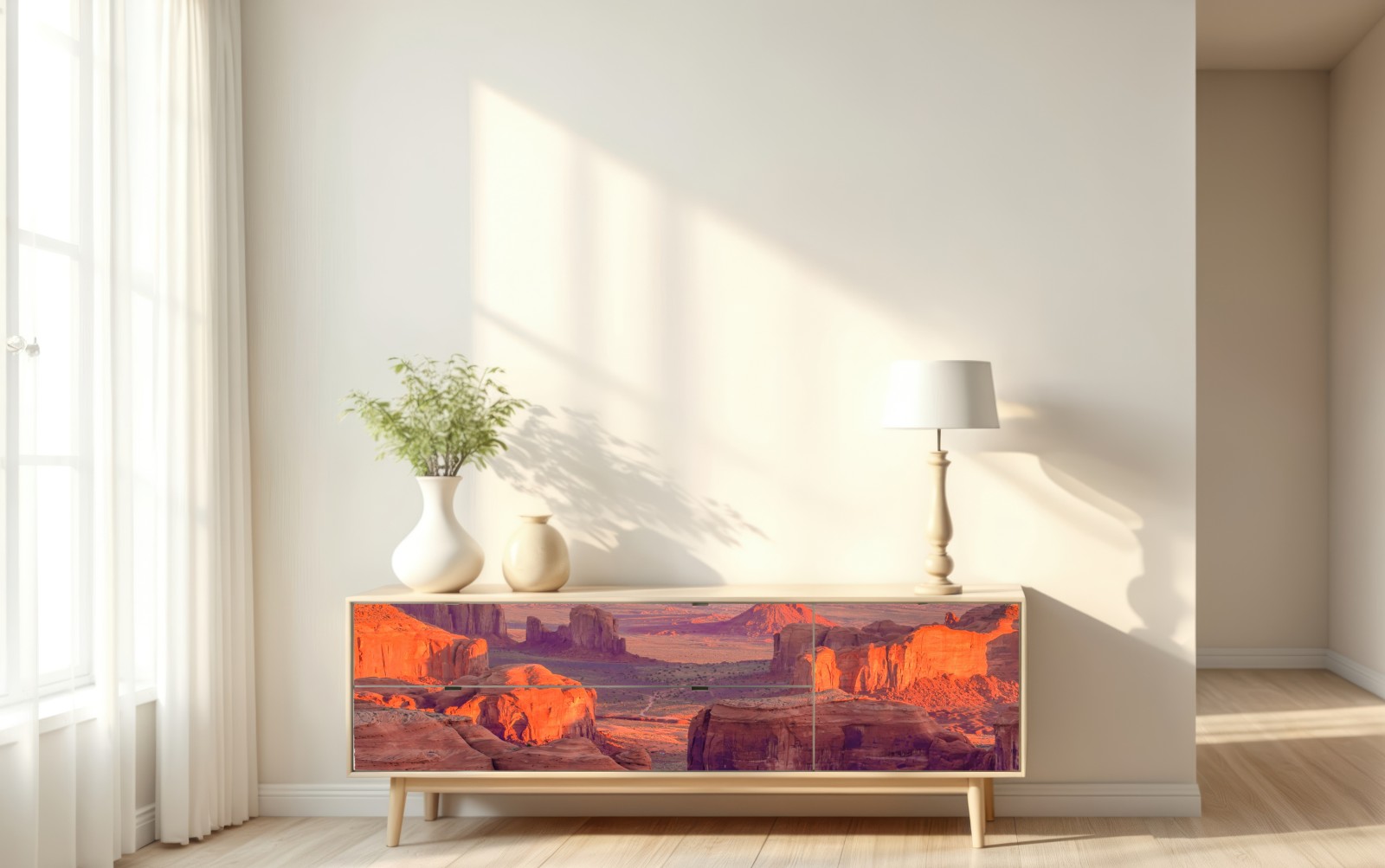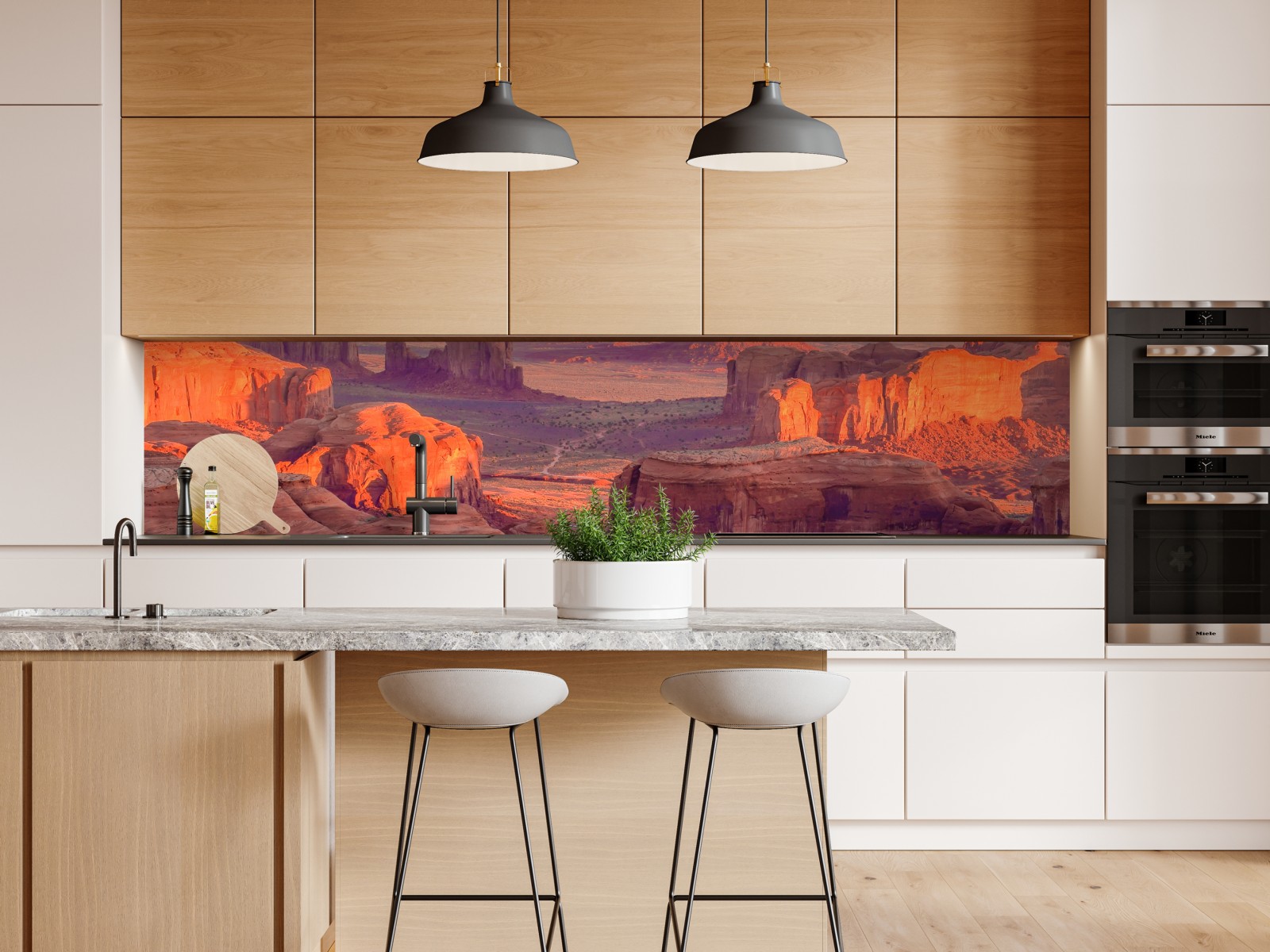 Atemberaubende Panoramaansicht des Monument Valley zur goldenen Stunde, bringt warme Wüstenfarben und dramatische Felsformationen in Ihren Raum.