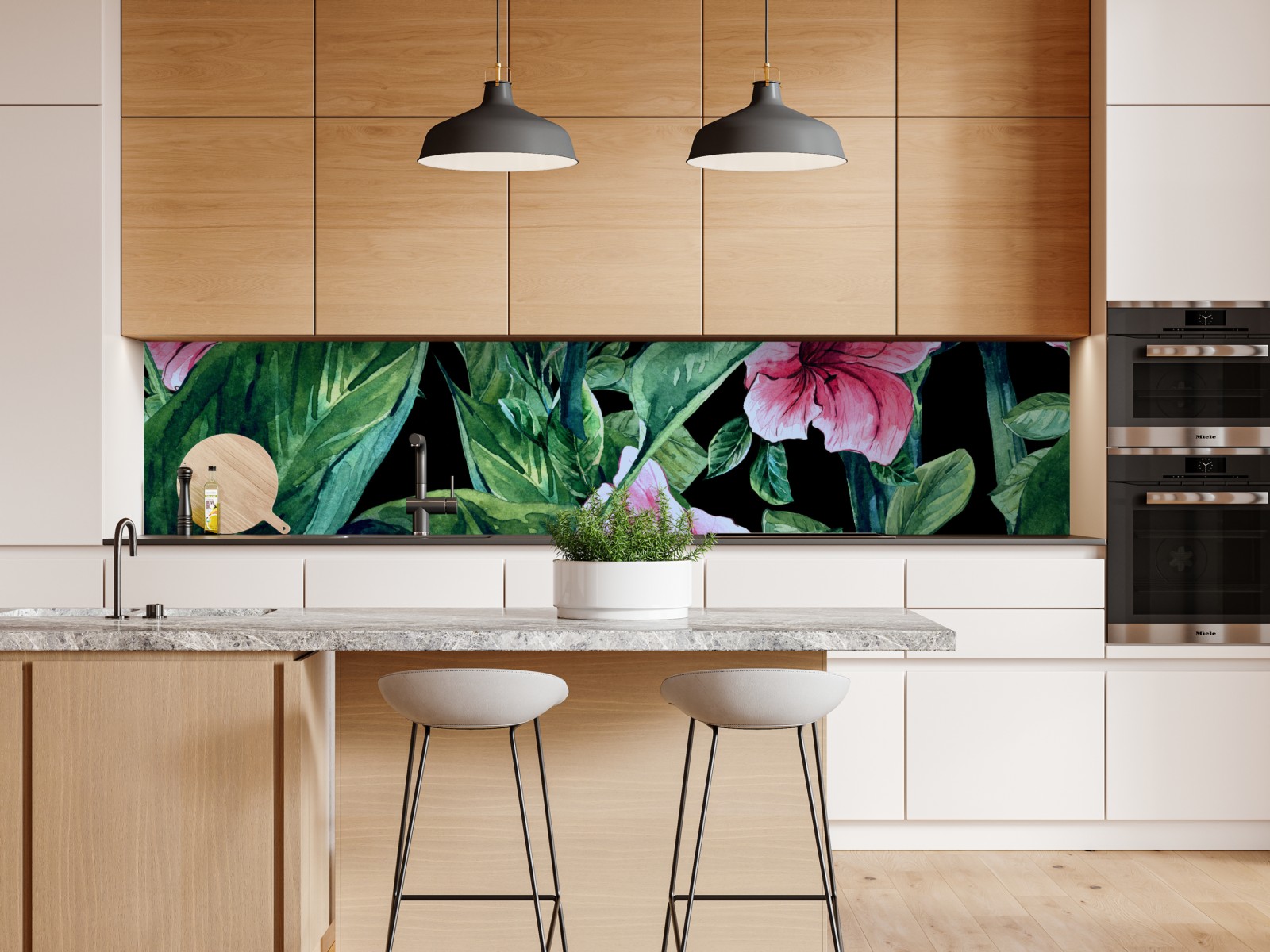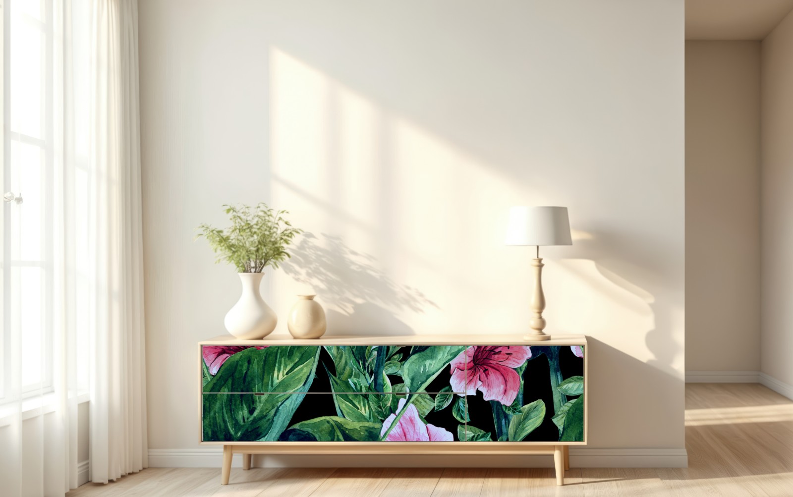 leuchtende rosa aquarellblumen und üppige grüne blätter schaffen ein kräftiges botanisches design auf tiefschwarzem hintergrund und verleihen jedem interieur natürliche eleganz und dramatischen kontrast.