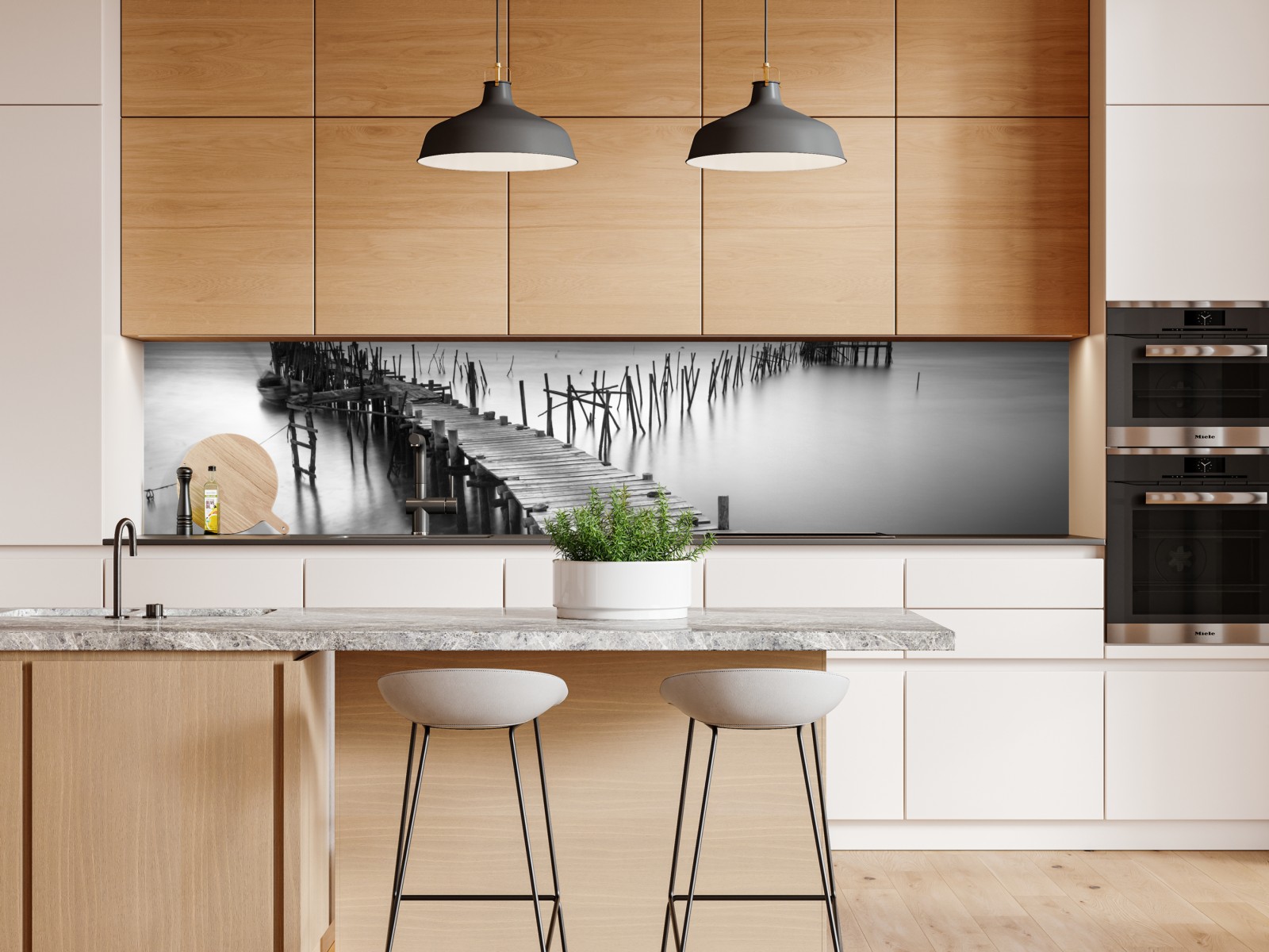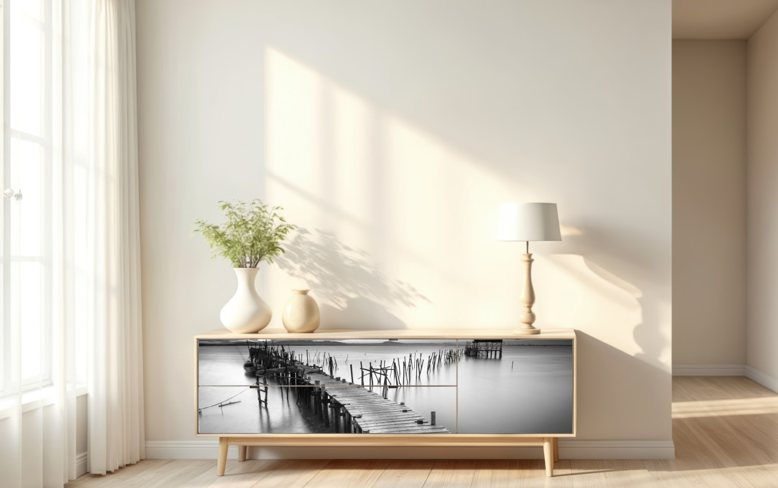 Minimalistische monochrome landschaft mit einem hölzernen steg über ruhigem wasser, die einen eleganten und reduzierten akzent im interieur setzt.