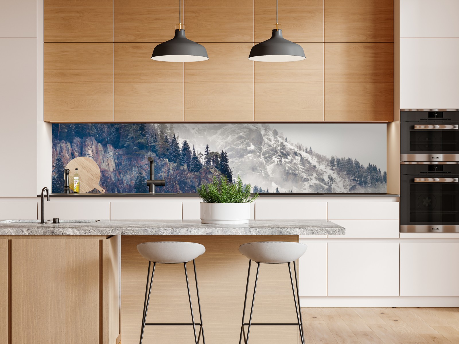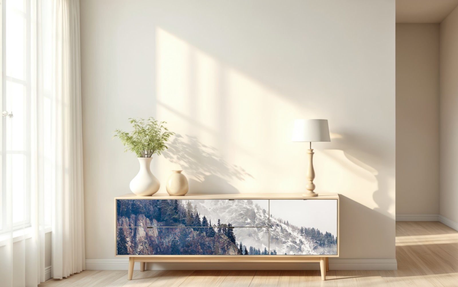 Eine ruhige Panoramaansicht eines nebligen Berges und schneebedeckter Gipfel, perfekt um Ihrem Raum natürliche Gelassenheit zu verleihen.
