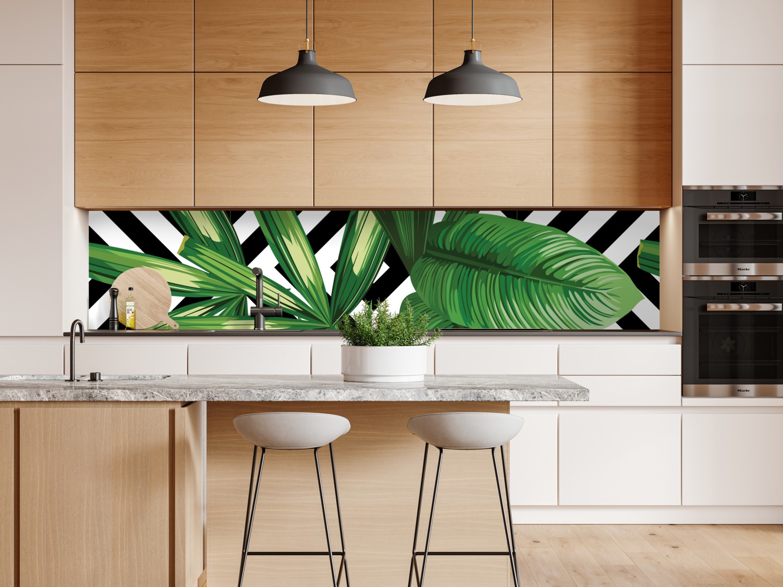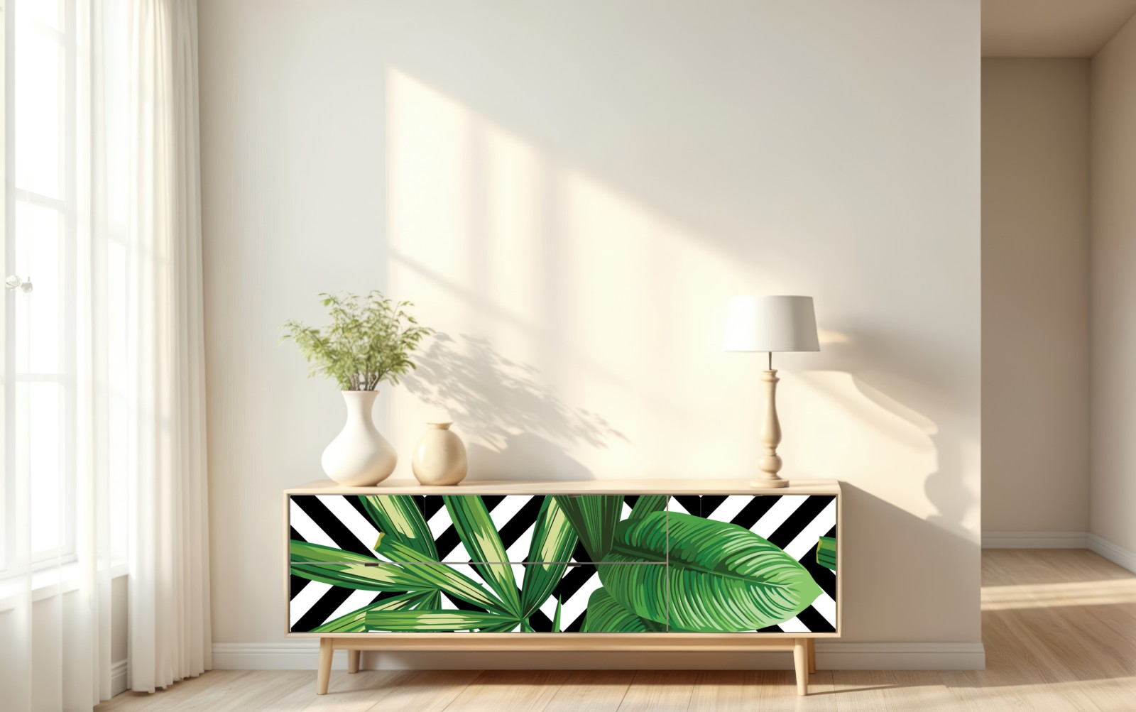 Lebhafte tropische Blätter auf kontrastierendem Schwarz-Weiß-Hintergrund bringen frische, moderne Atmosphäre in jeden Raum.