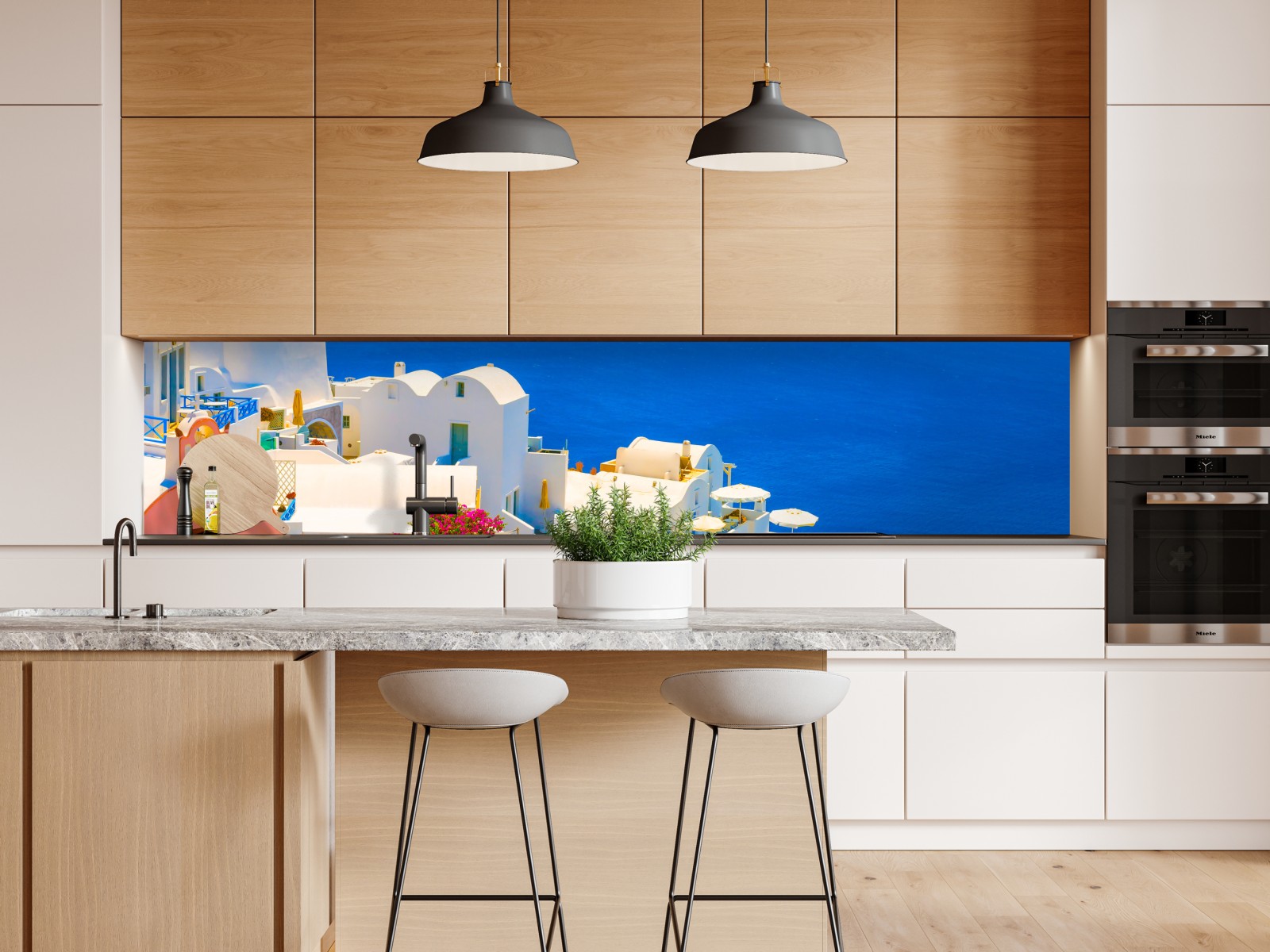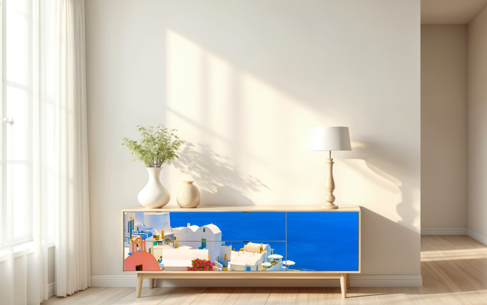 Helles Santorini-Motiv mit charakteristischen weißen Häusern und tiefblauem Meer, bringt mediterranes Flair in jedes Zuhause.