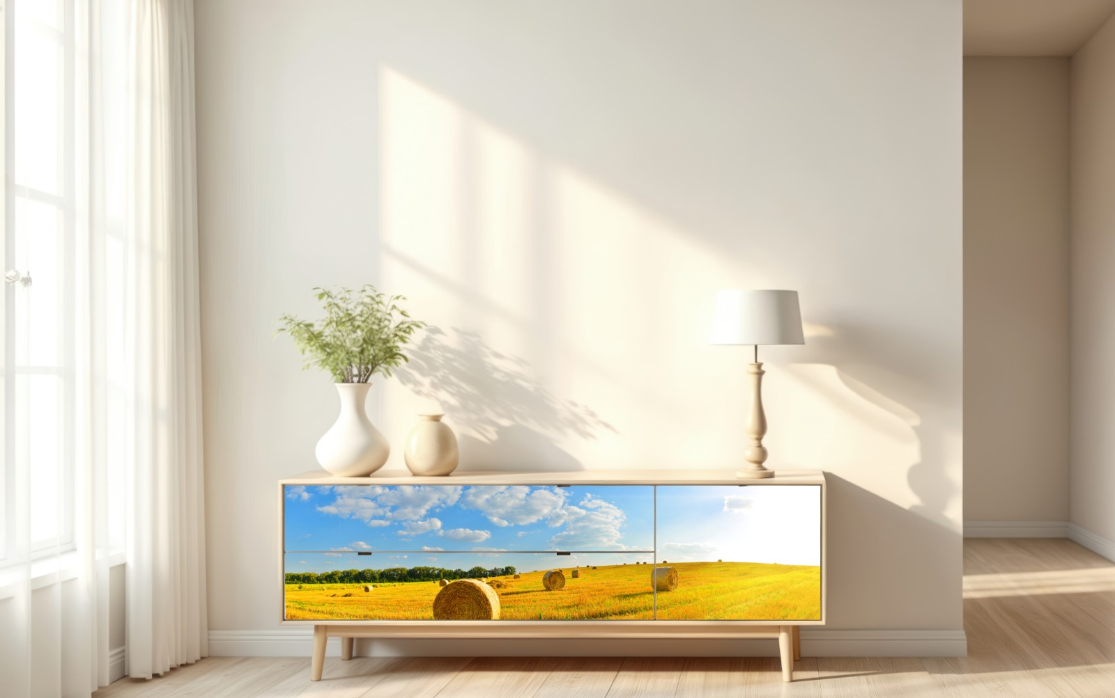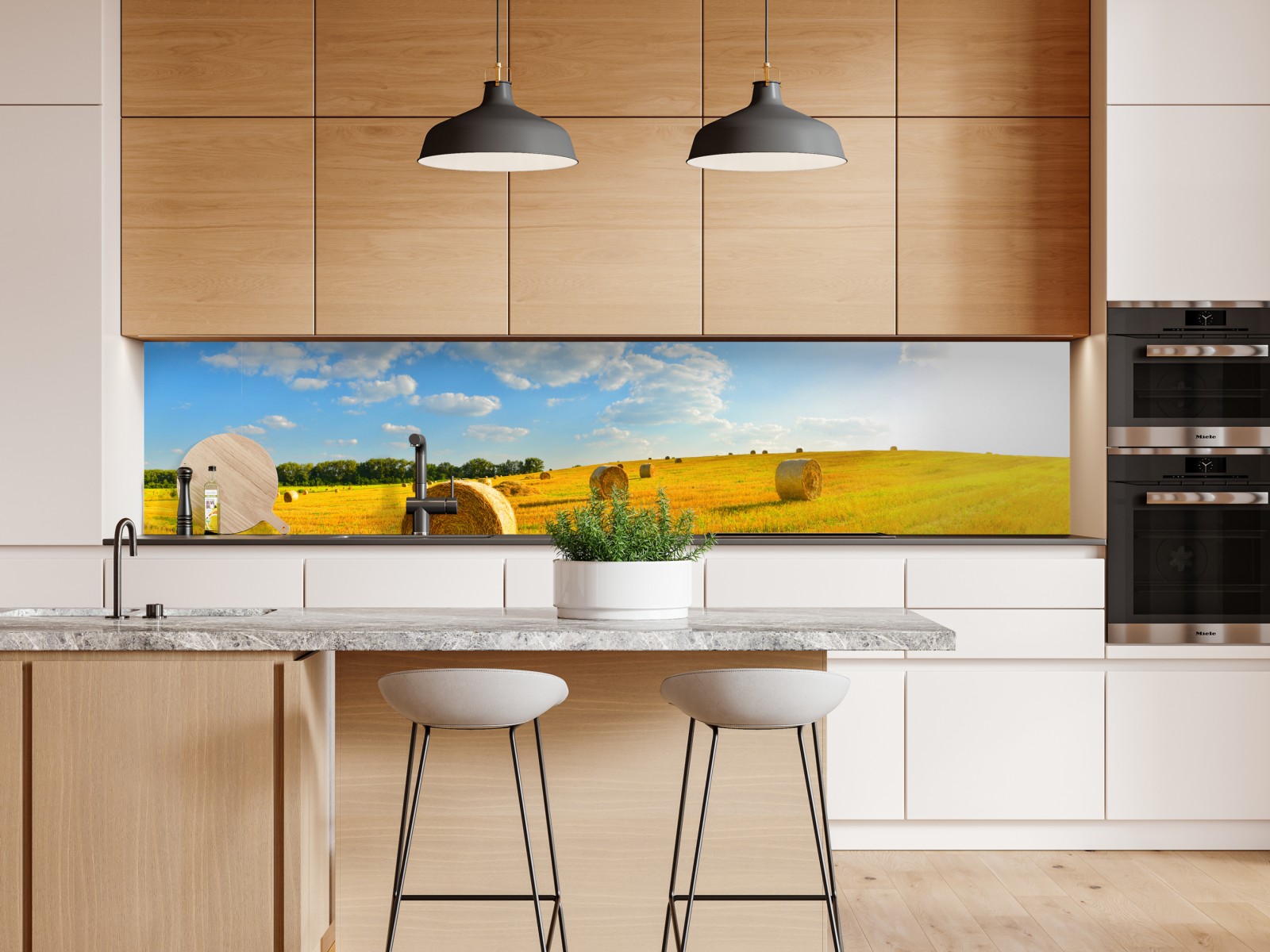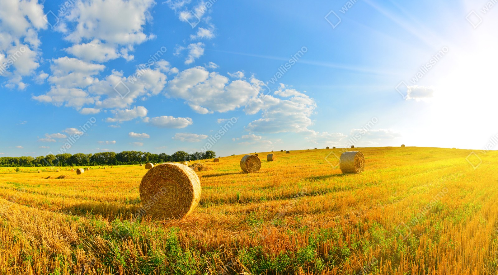 Bringen Sie ländlichen Charme in Ihr Zuhause mit einer sonnenverwöhnten Panoramaaufnahme von Heuballen auf einem goldenen Feld.
