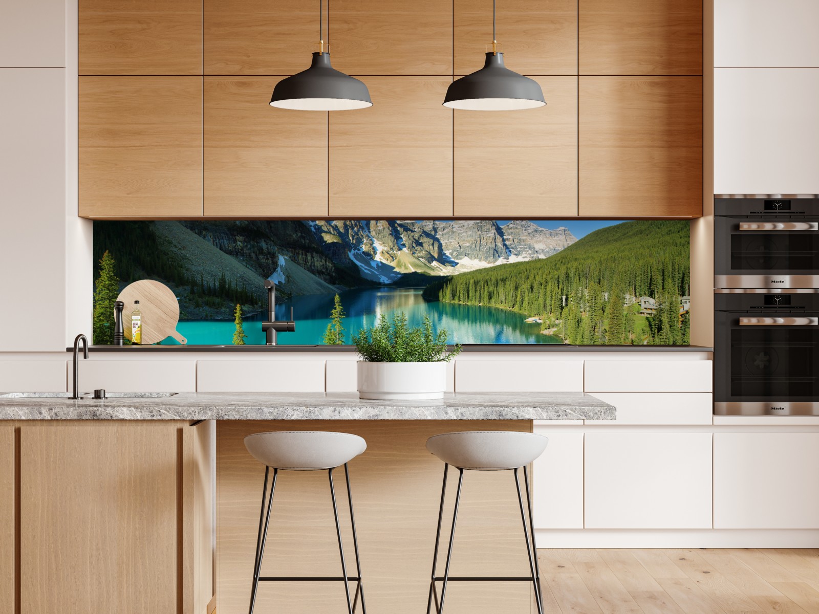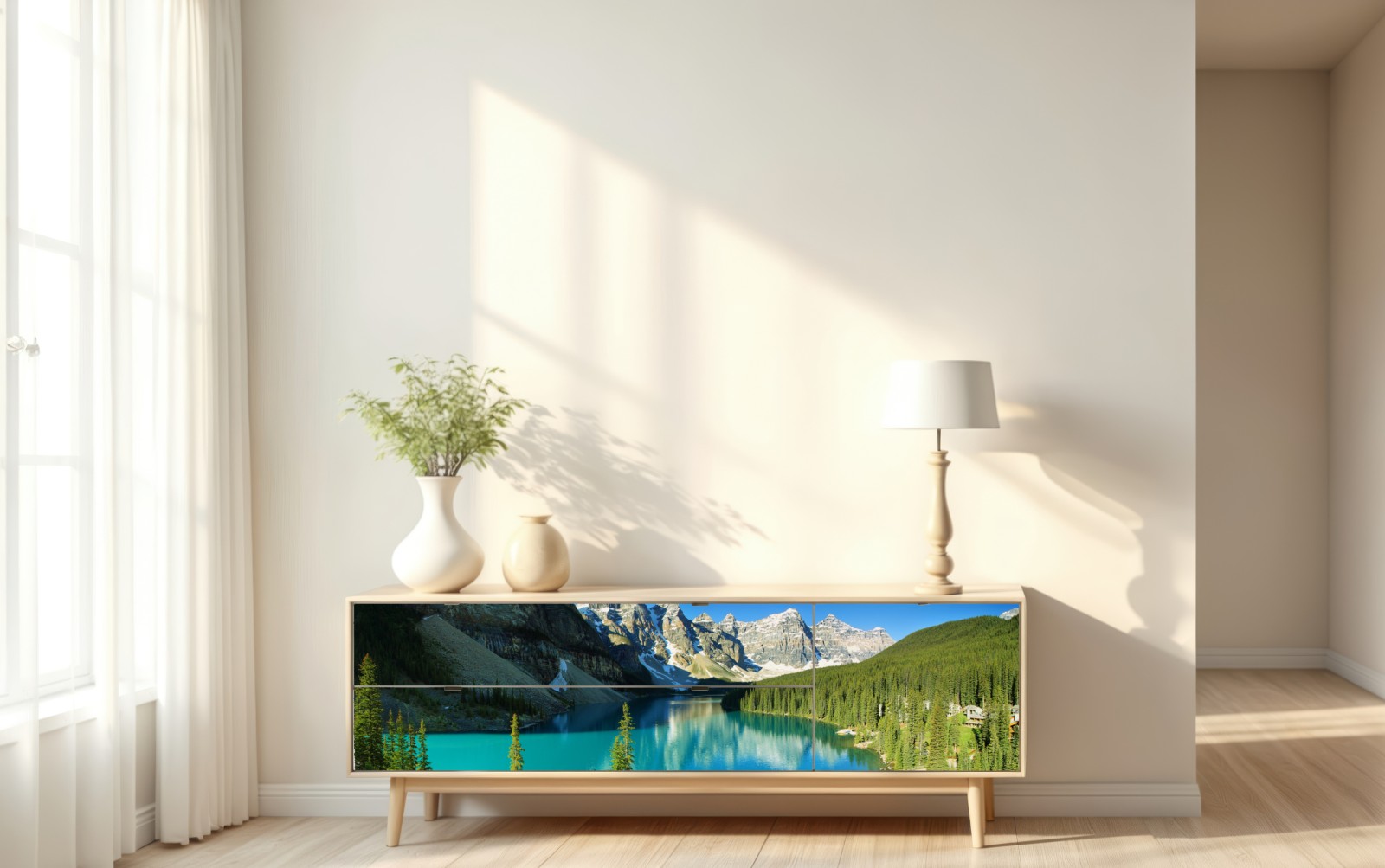 Atemberaubende Panoramaansicht eines türkisen Bergsees mit spiegelglatter Oberfläche und alpinem Wald, ideal um natürliche Ruhe und lebendige Farben in jeden Raum zu bringen.