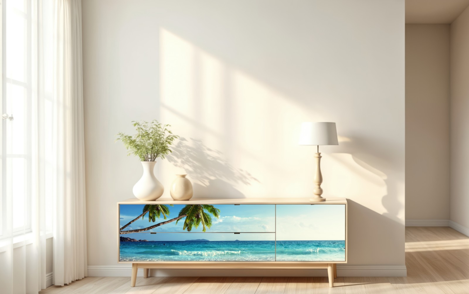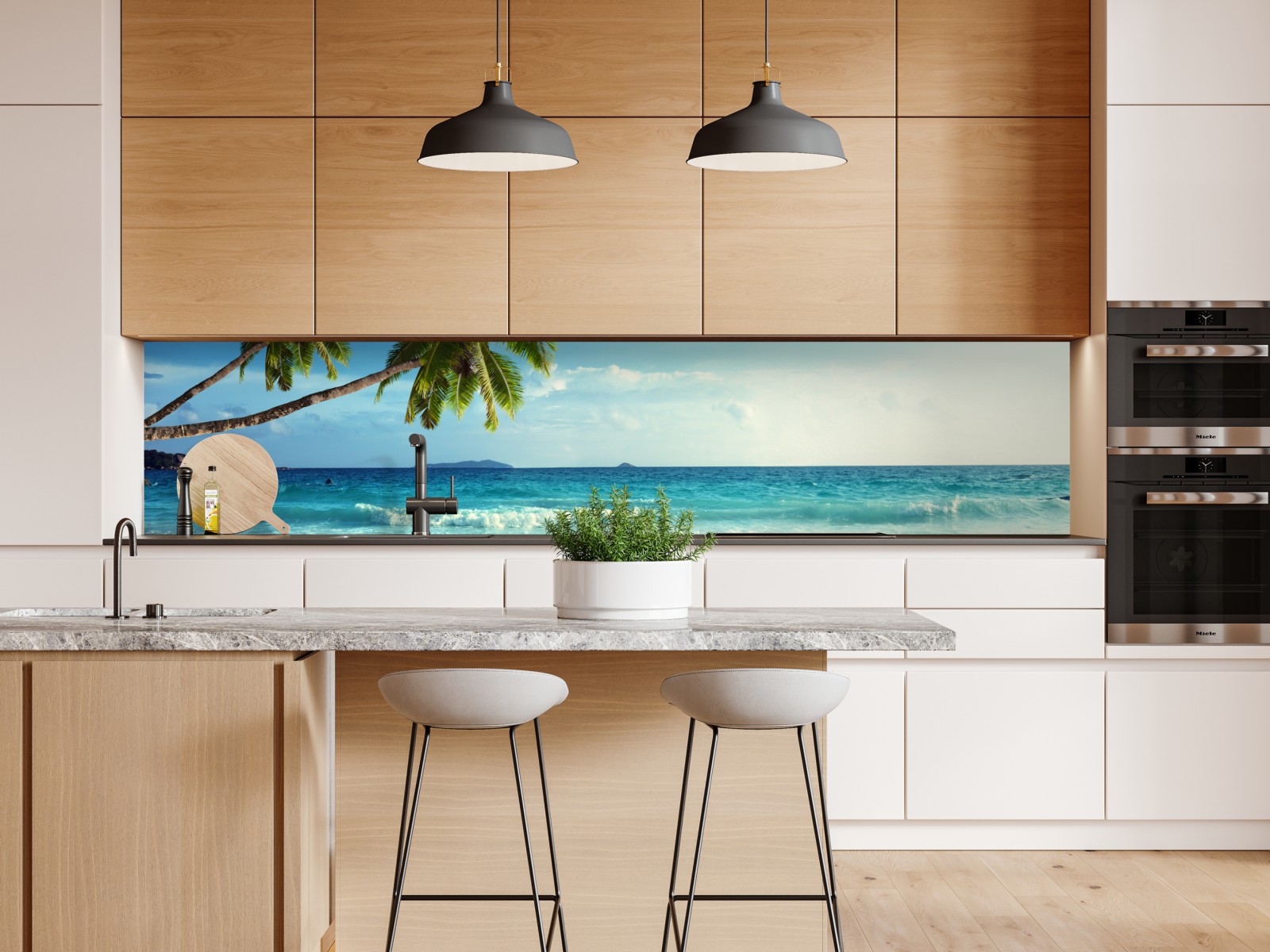Bringen Sie die ruhige Schönheit eines tropischen Karibikstrandes mit türkisfarbenem Wasser, wiegenden Palmen und feinem Sand in Ihr Zuhause.