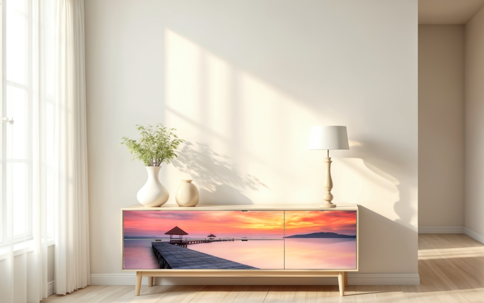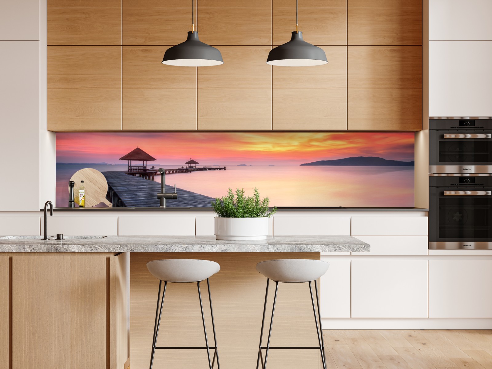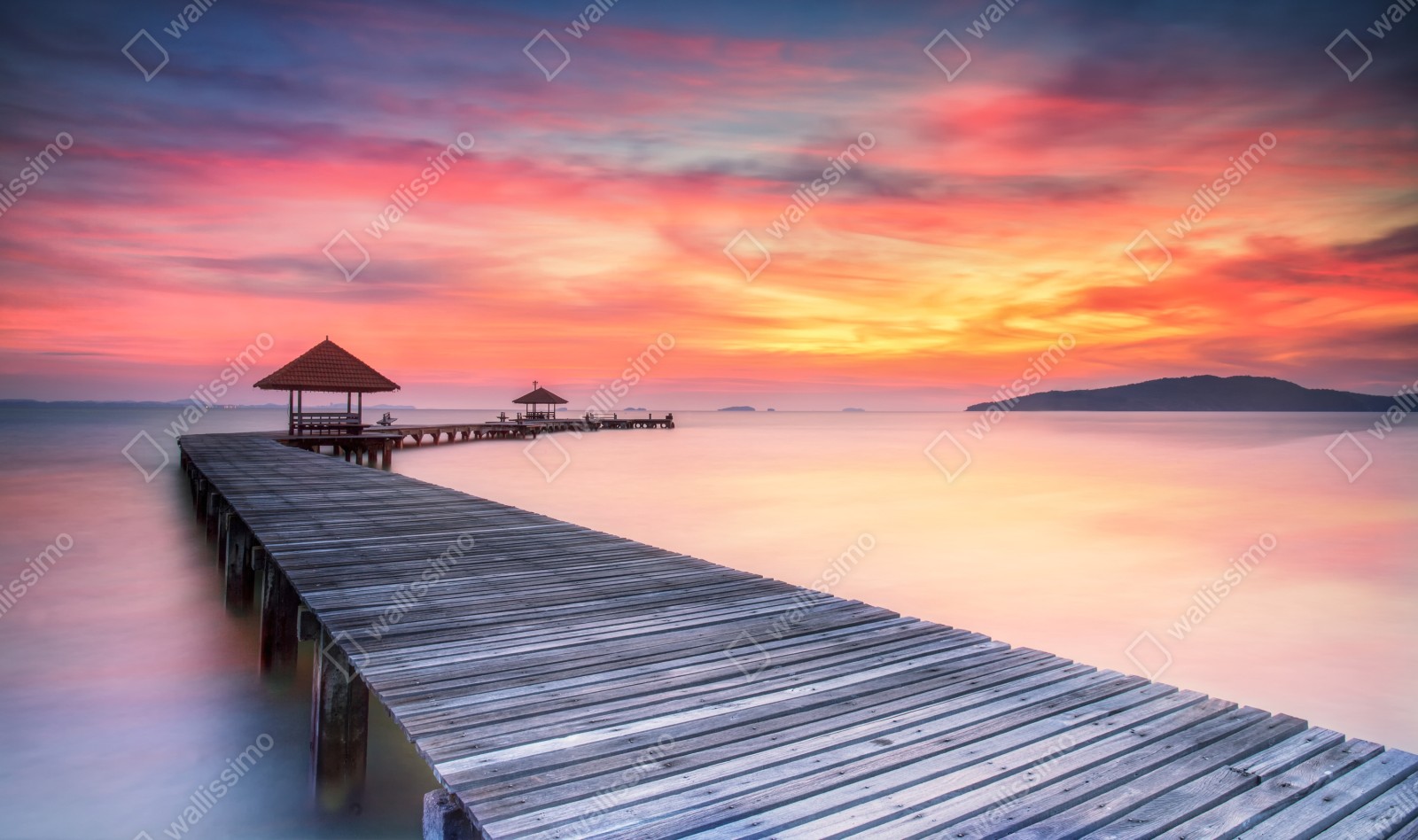 Ein ruhiger Sonnenaufgang über einem hölzernen Steg bringt warme Farben und Gelassenheit in jeden Raum.