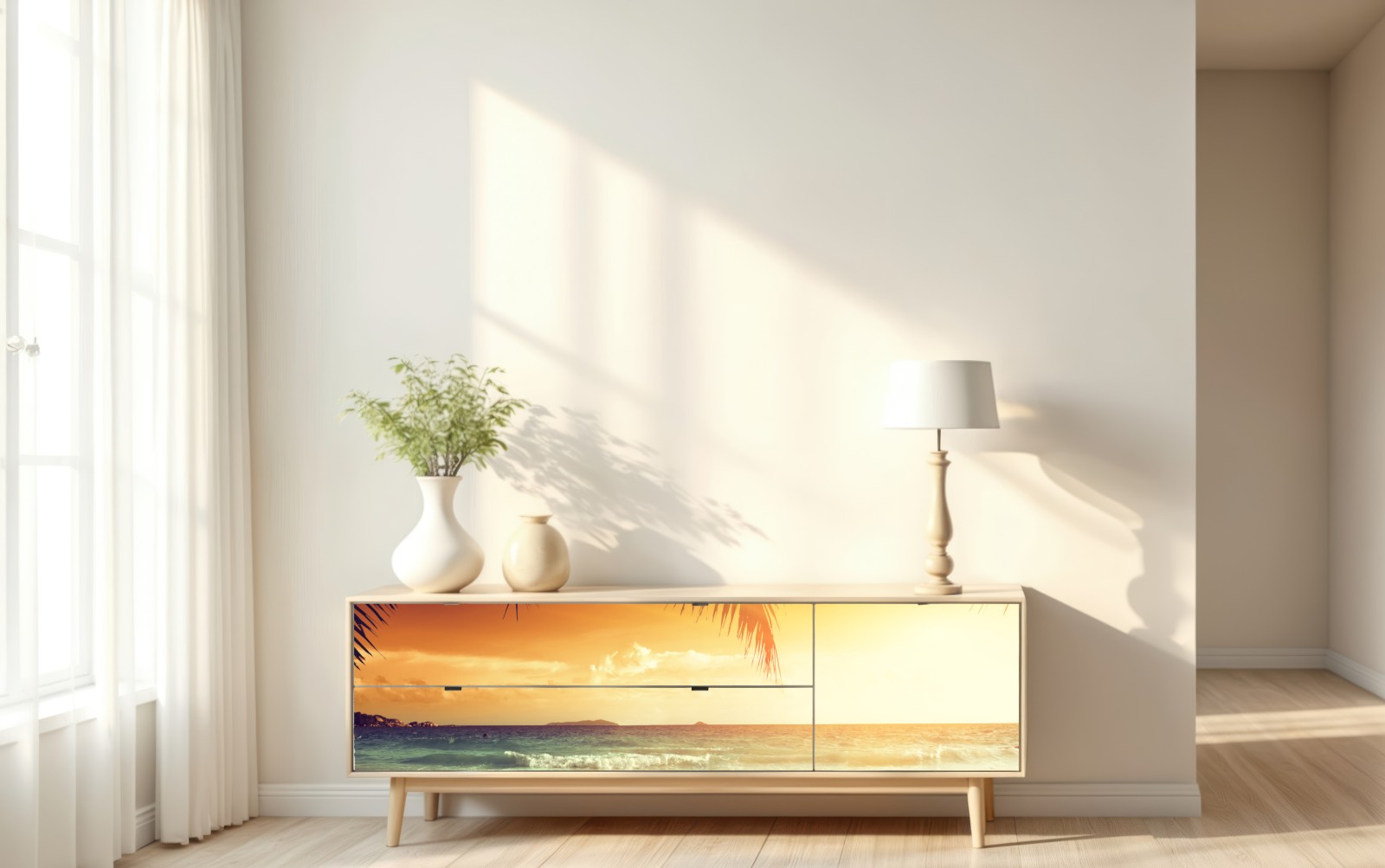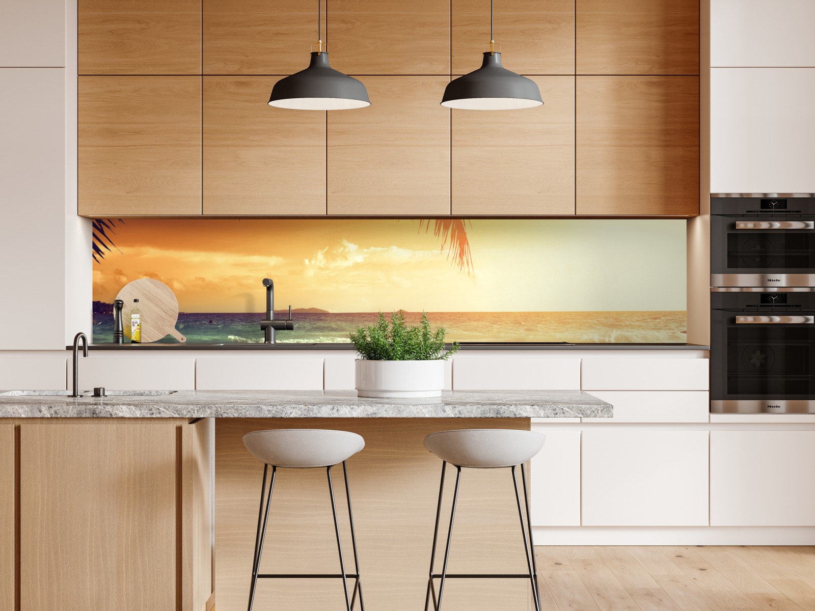 Warmer Sonnenuntergang über einem ruhigen Strand mit Palmen, bringt tropische Ruhe und Atmosphäre in jeden Raum.