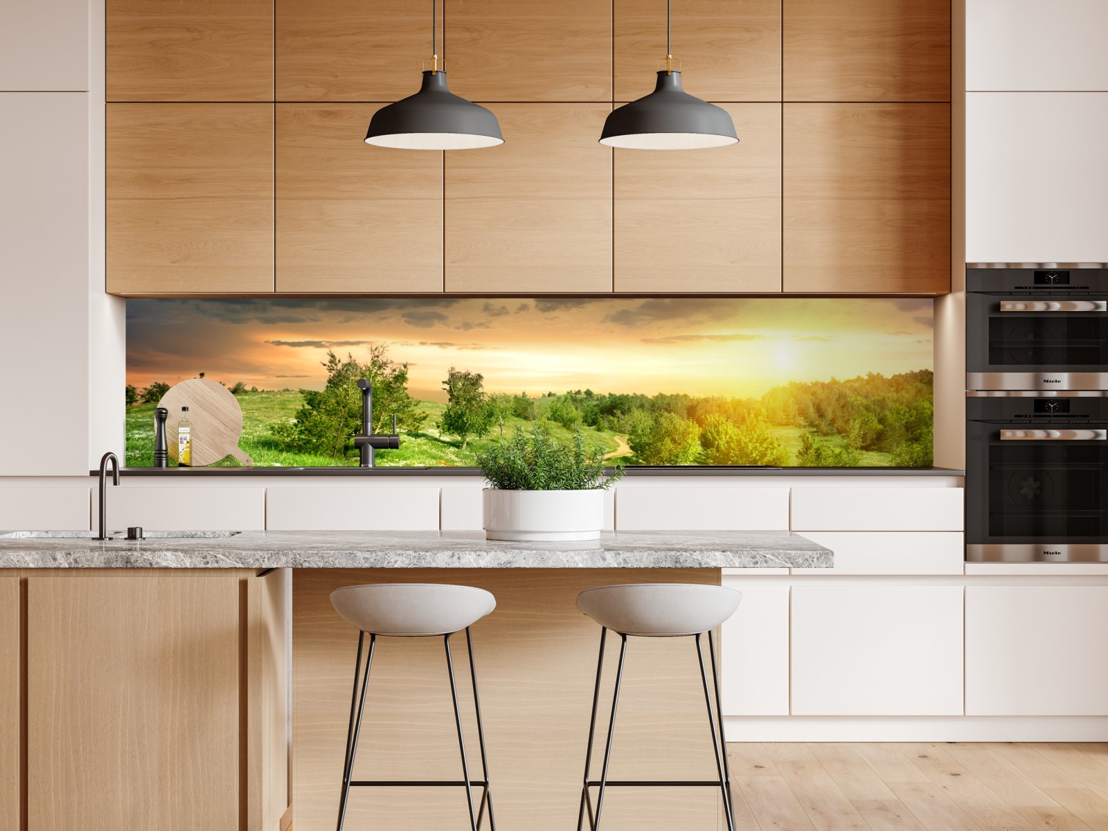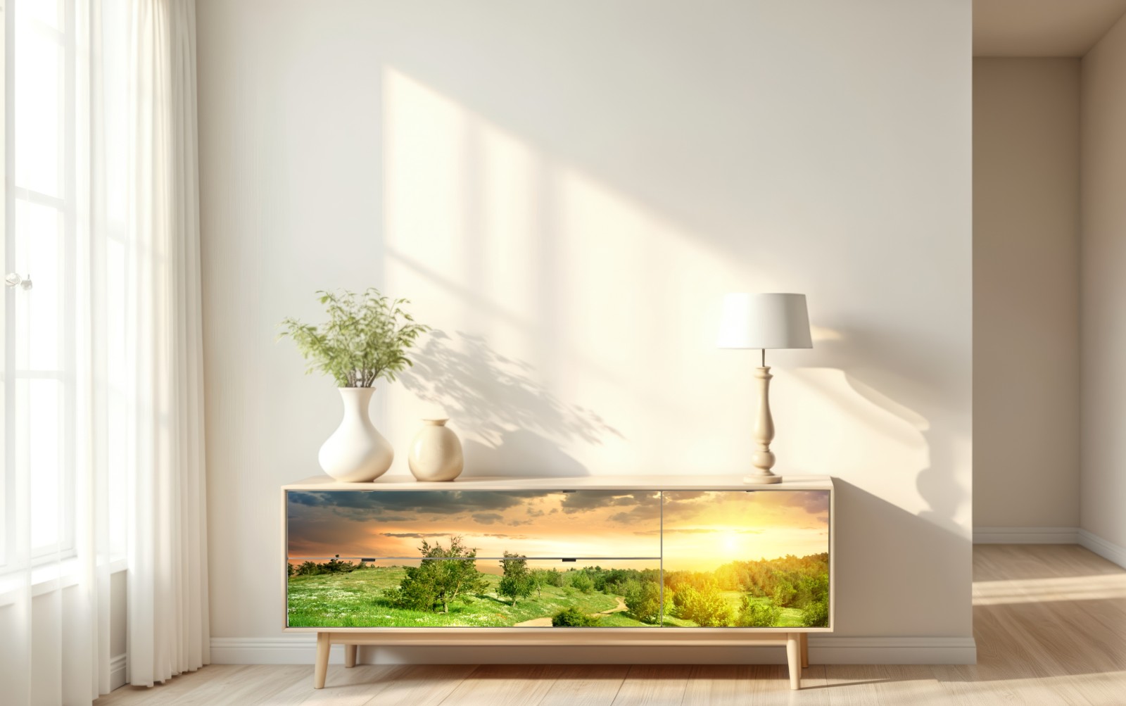 Ruhiger Sonnenuntergang über einem gewundenen Feldweg durch üppige Frühlingswiesen, perfekt um Natur ins Zuhause zu holen.
