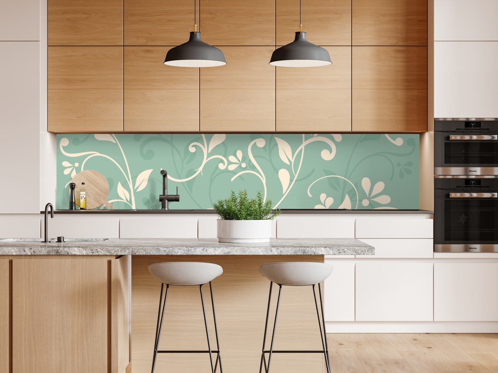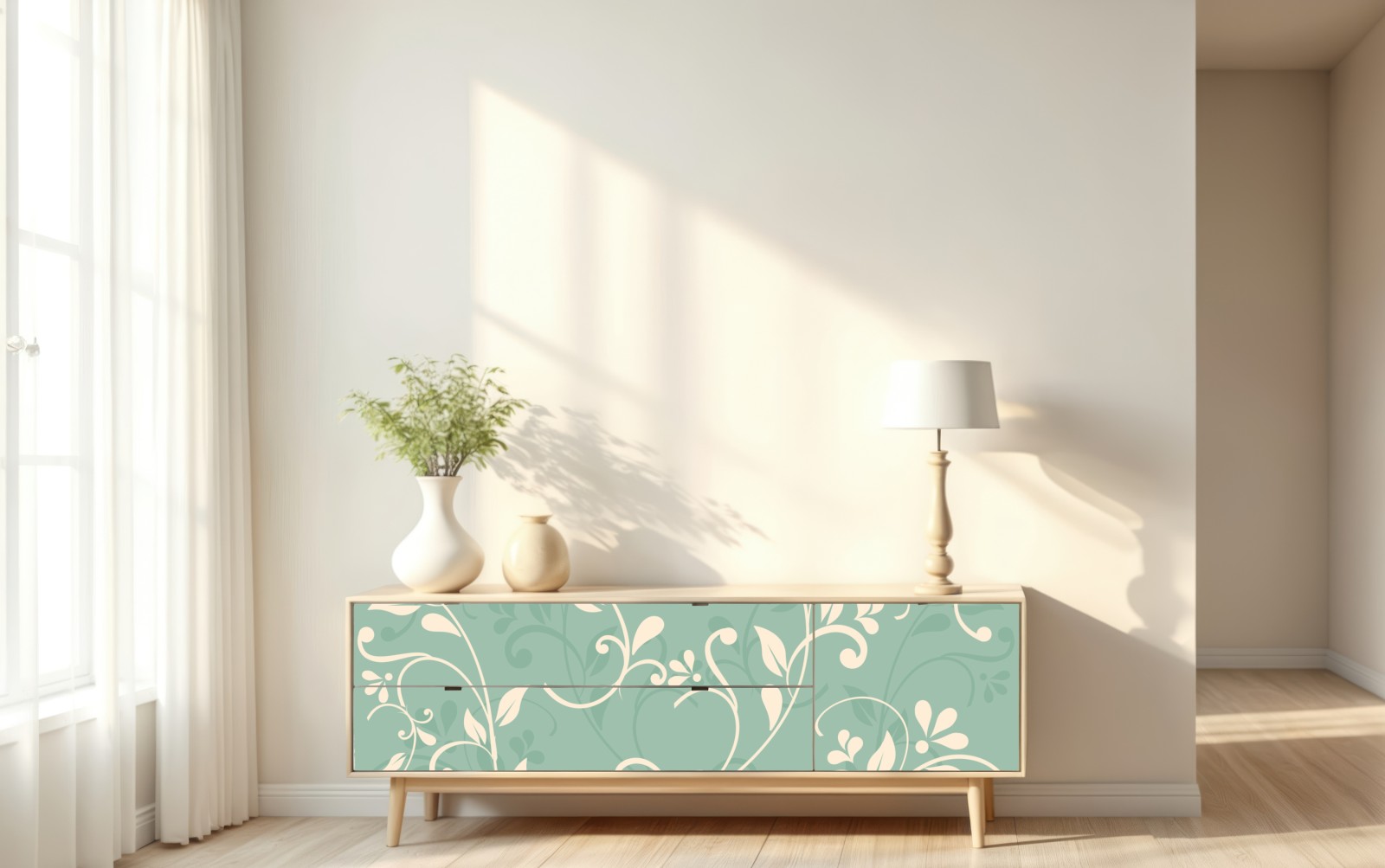 Sanftes mint- und cremefarbenes botanisches Muster mit filigranen Ranken und Blättern verleiht jedem Raum zeitlosen Vintage-Charme.