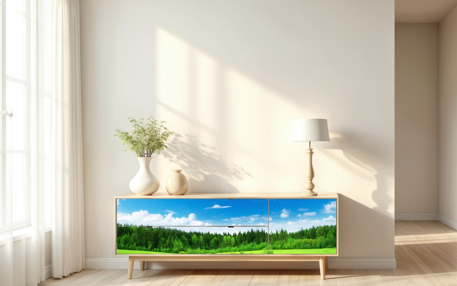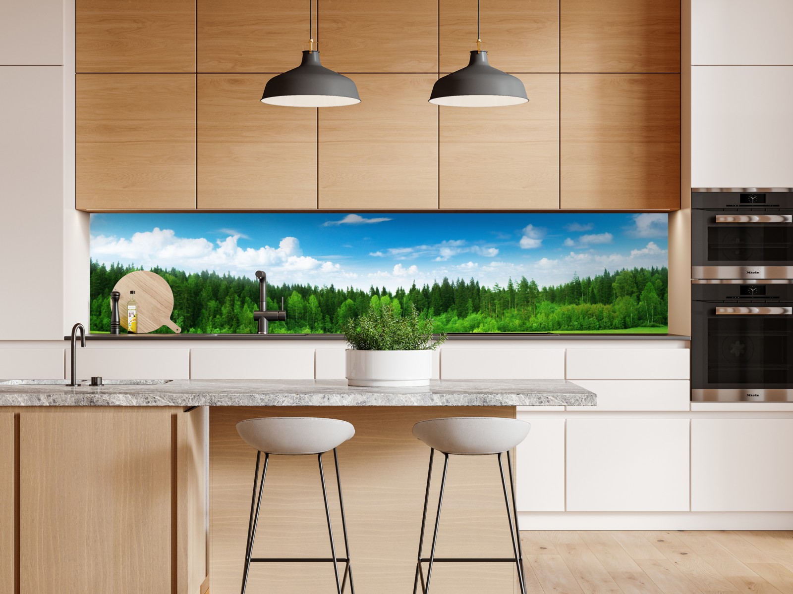 Bringen Sie die Ruhe einer Frühlingswiese in Ihr Zuhause mit diesem lebendigen Landschaftsbild aus saftigen Feldern, dichtem Wald und klarem Himmel.