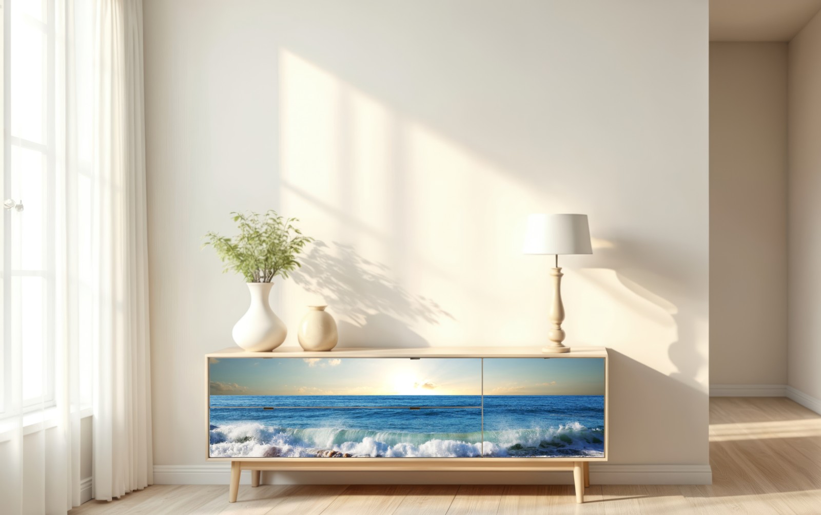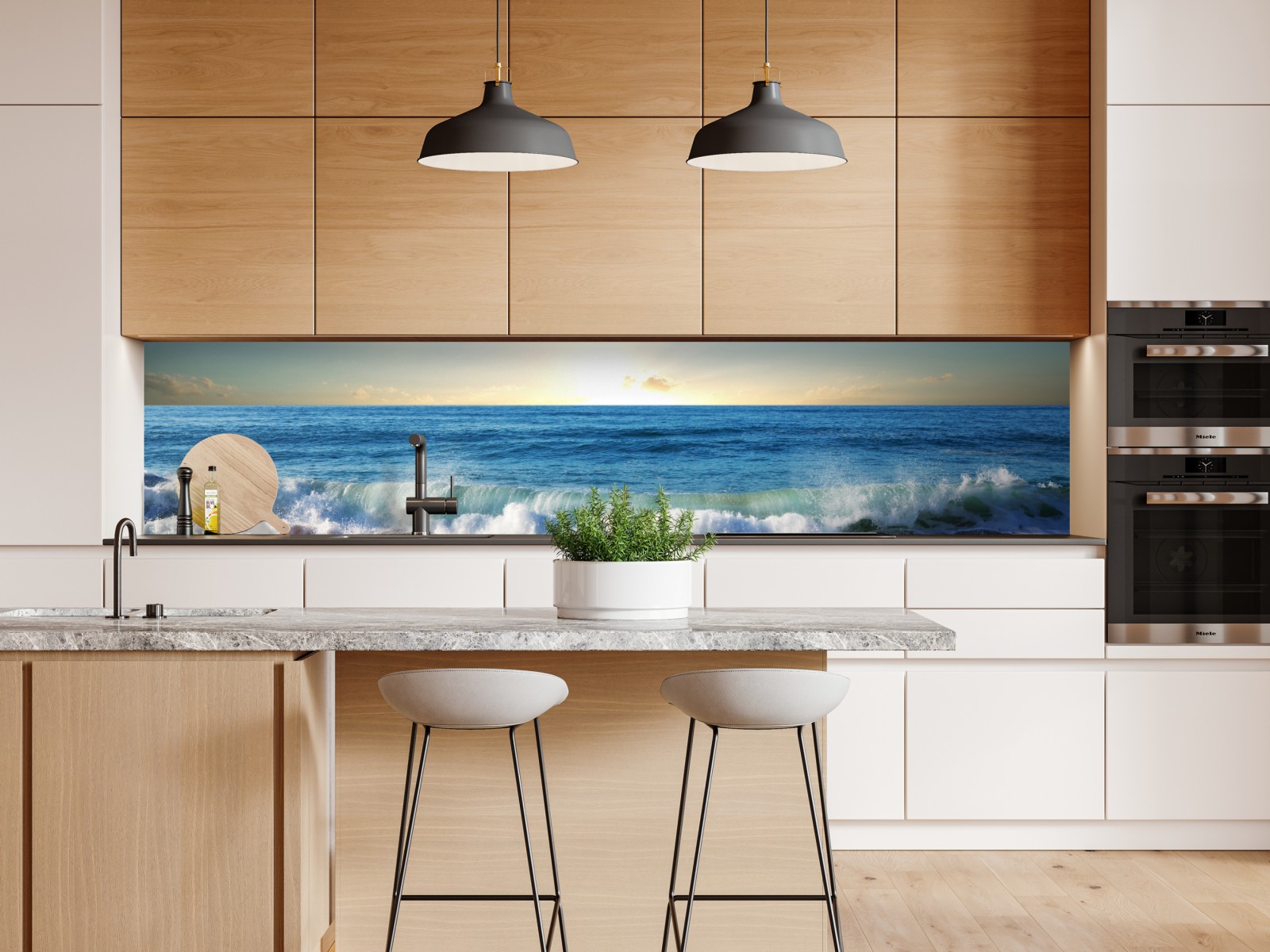 Bringen Sie maritimes Flair in Ihr Zuhause mit lebendigen Farben eines Sonnenuntergangs über Wellen und goldenem Sand.
