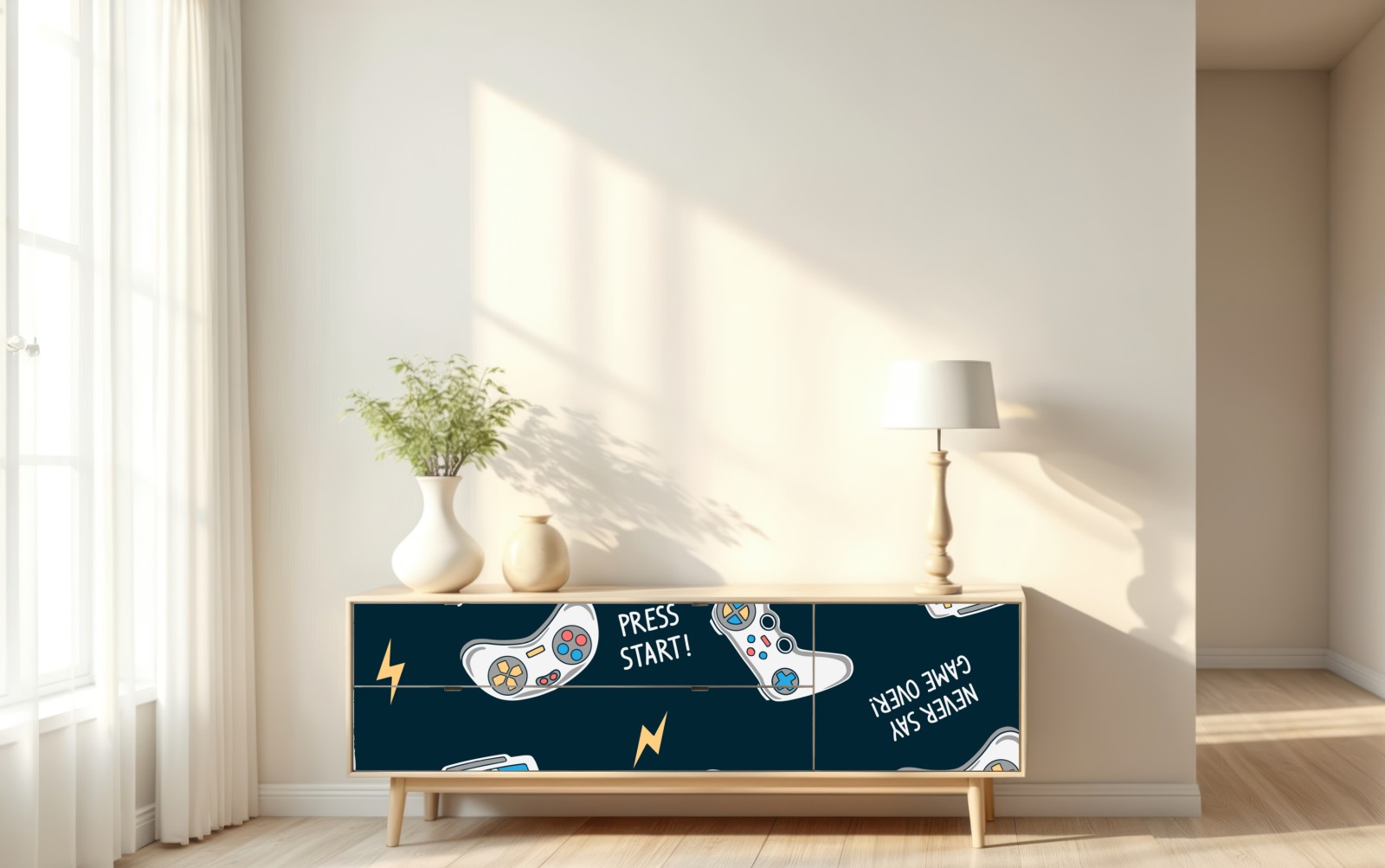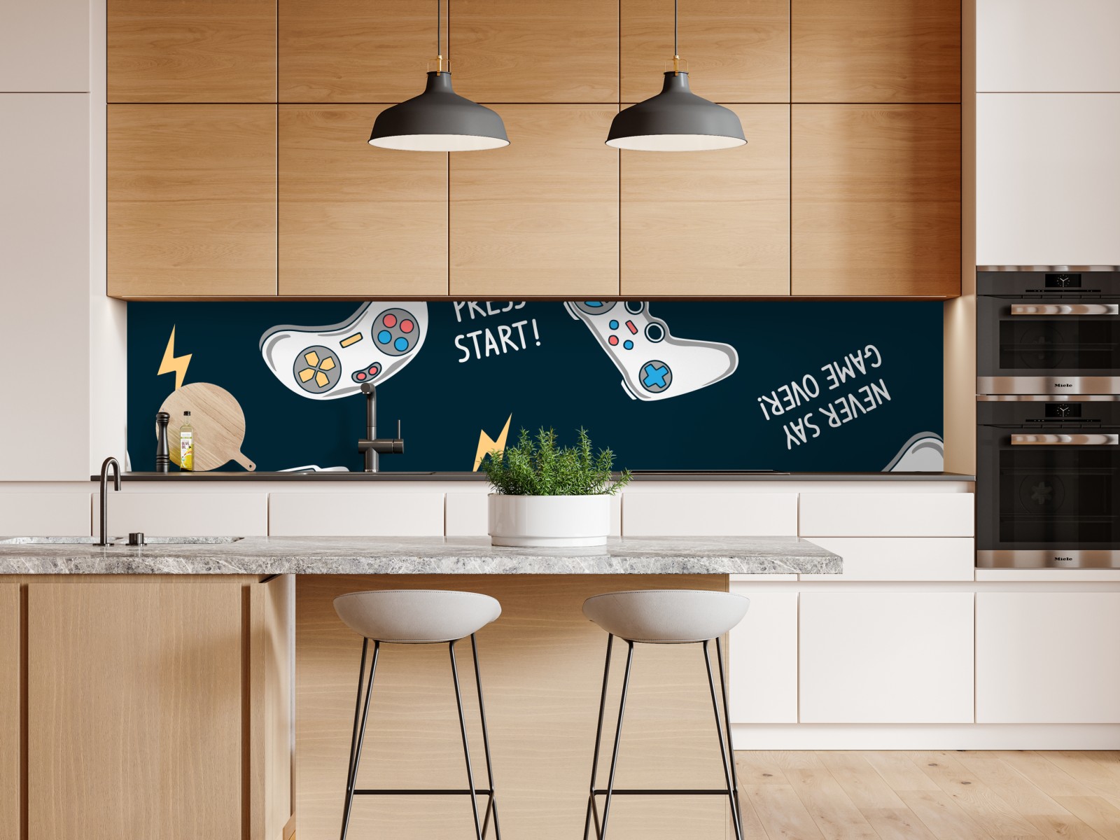 Verspieltes nahtloses Muster mit Controllern und Handkonsolen auf dunklem türkisfarbenem Hintergrund, ideal zur Dekoration von Kinderzimmern, Gaming-Bereichen oder kreativen Projekten.