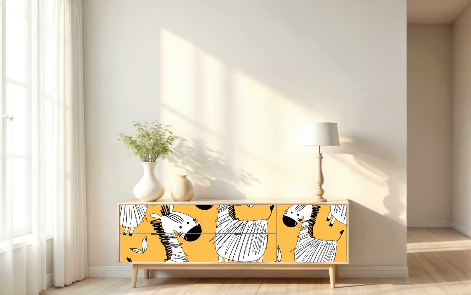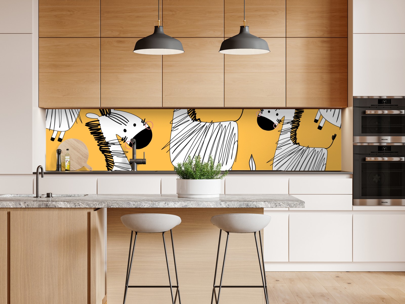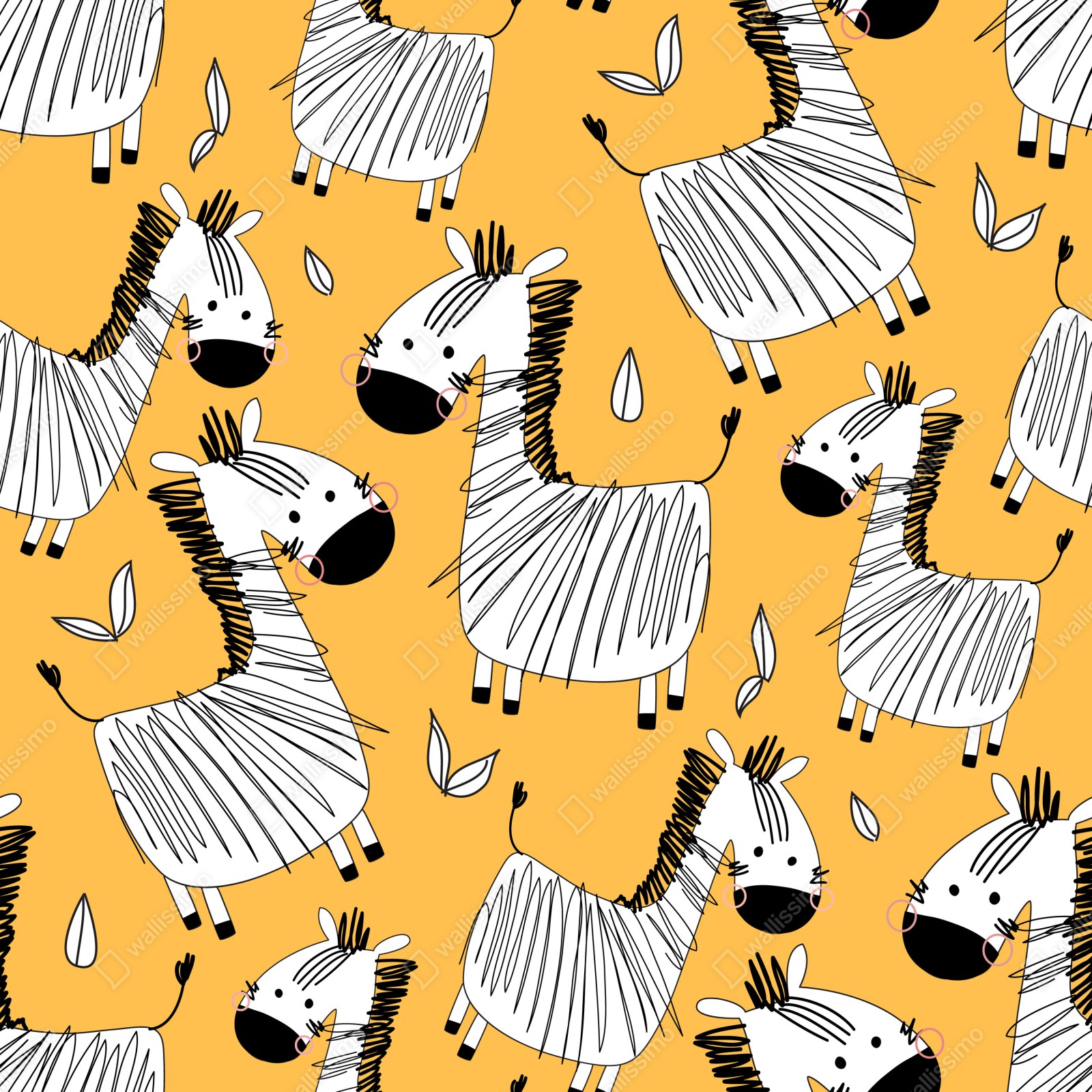 Fröhliches, sich wiederholendes Zebramuster auf warmem orangegelbem Hintergrund, das Kinderzimmer aufhellt und spielerischen Charme verleiht.
