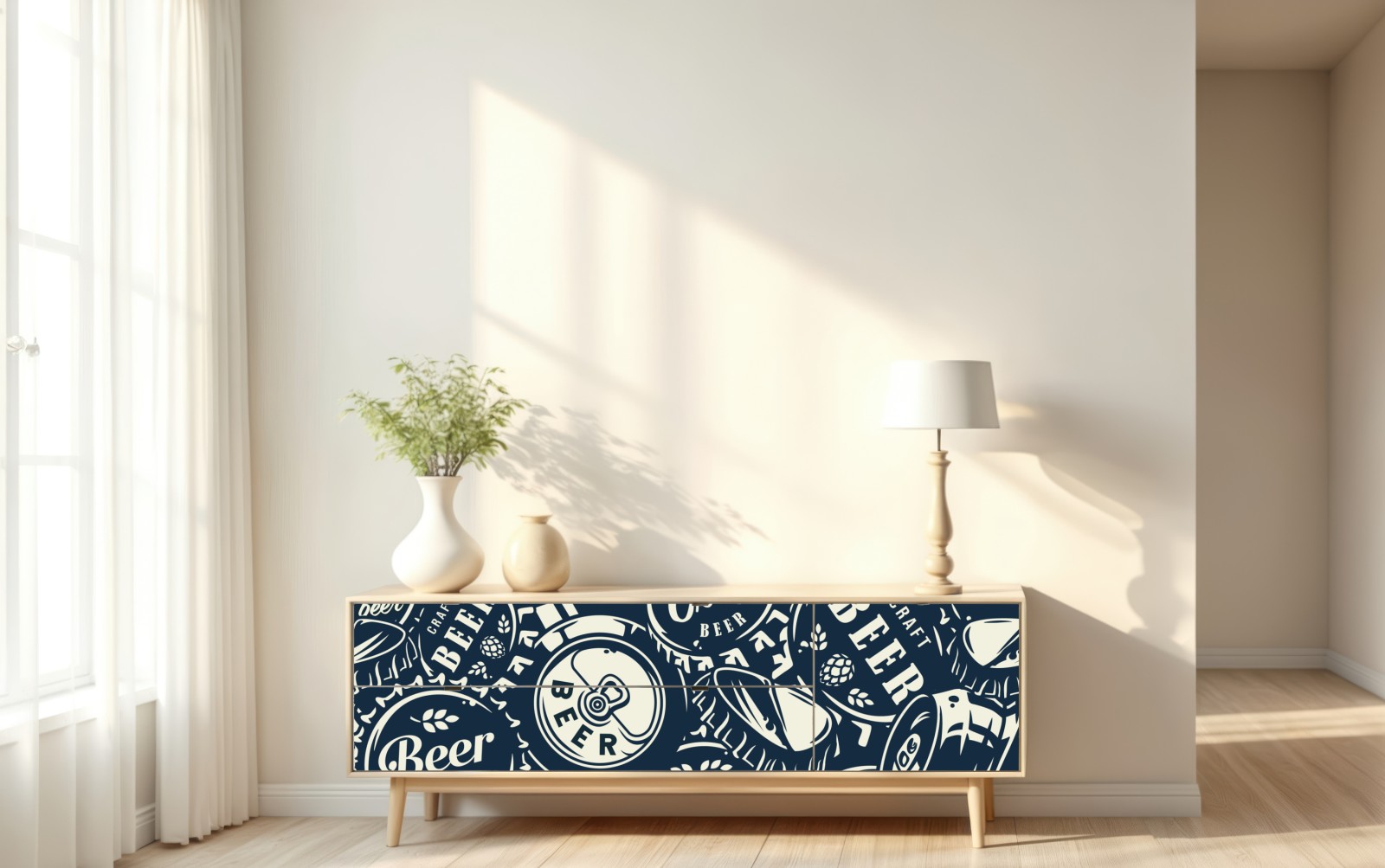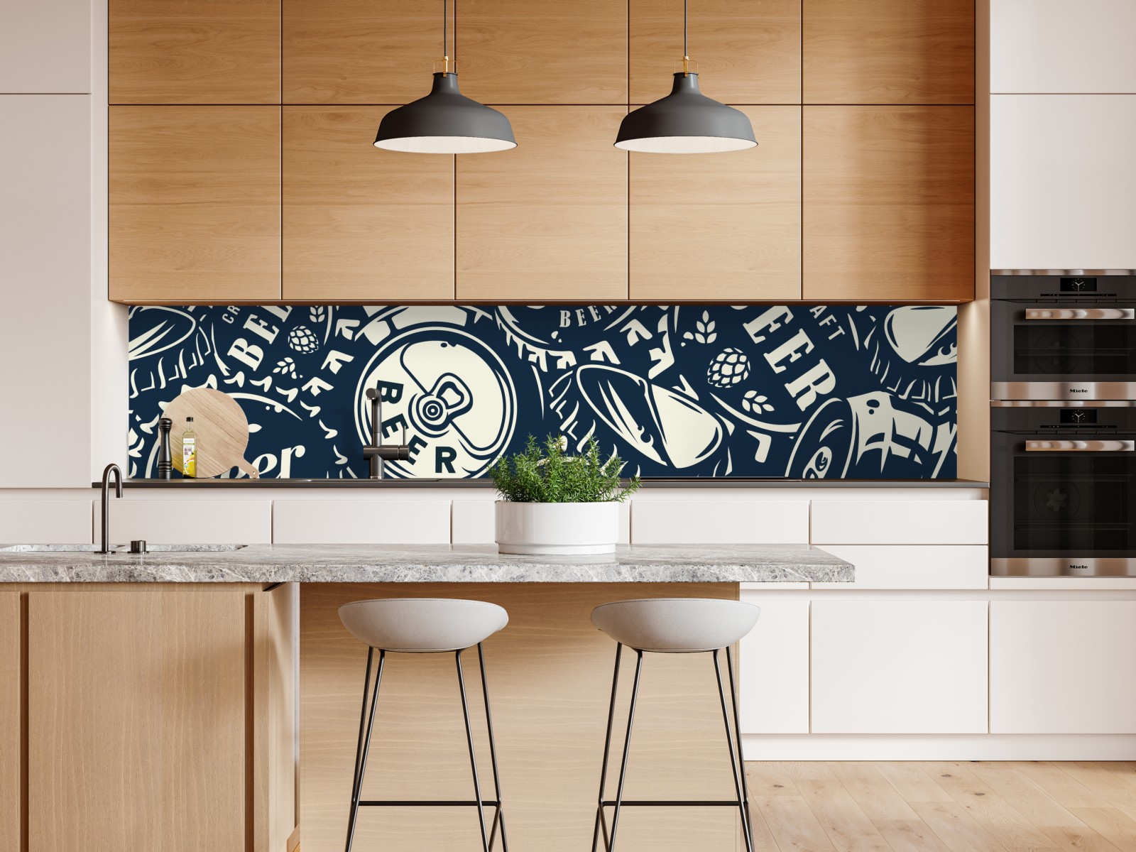 Markantes retro-inspiriertes Muster mit Kronkorken und Dosen, ideal für Bar, Küche oder Esszimmer, verleiht jedem Raum Charakter und Nostalgie.