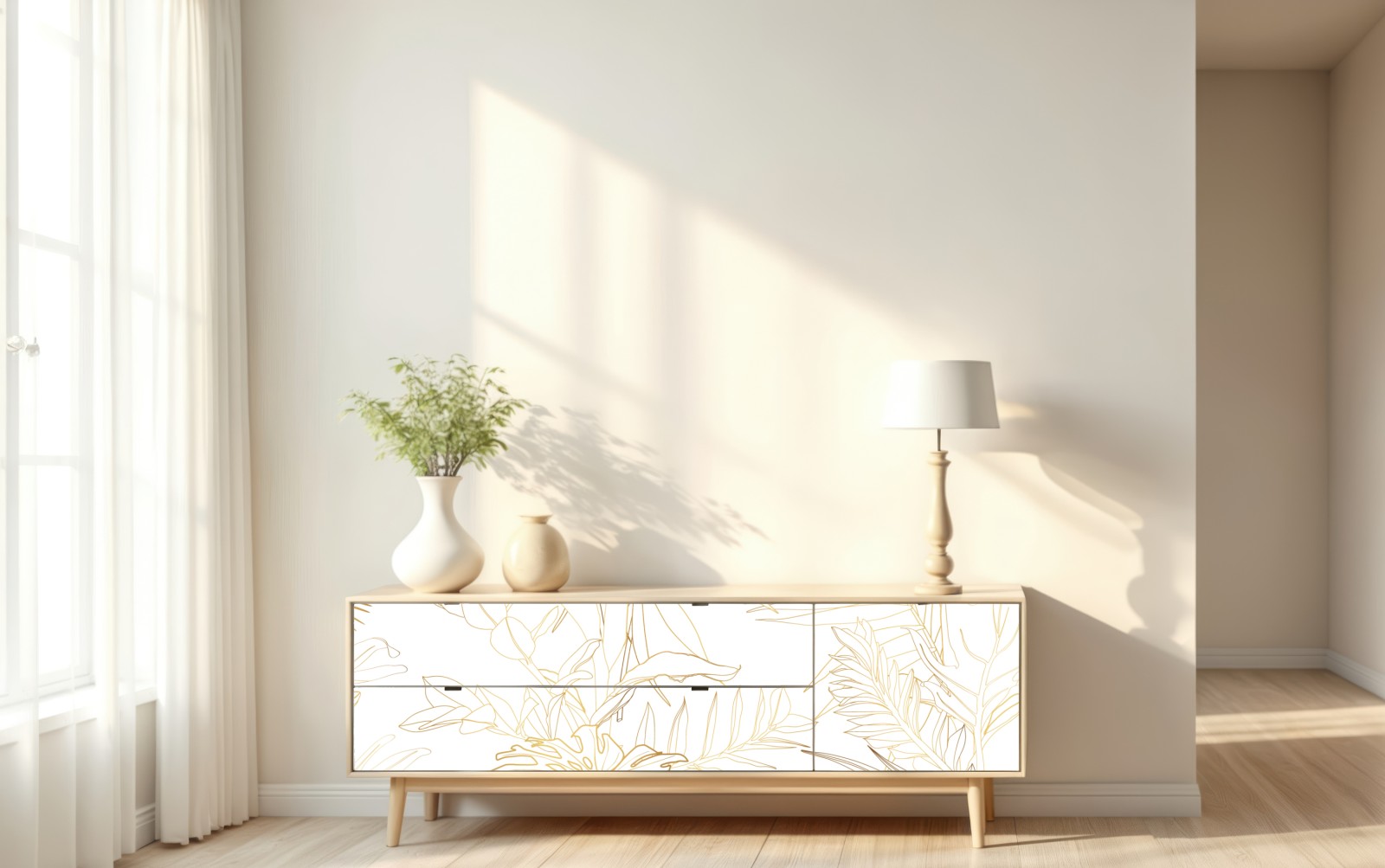 Elegante goldene Blattlinien auf weißem Hintergrund verleihen jedem Raum eine moderne, minimalistische Note.