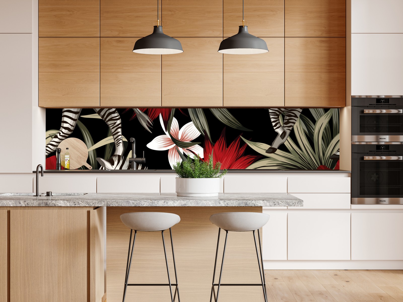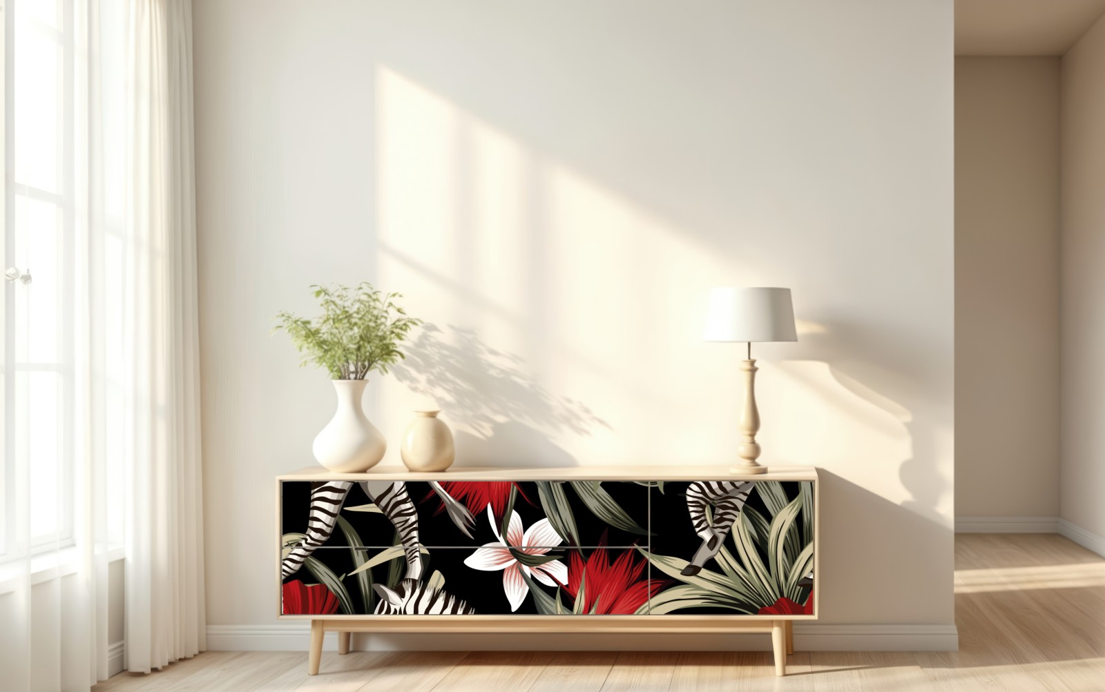 Kräftiges tropisches Muster mit Zebras, Hibiskusblüten und üppigen Blättern auf tiefschwarzem Hintergrund, ideal um jedem Raum exotisches Flair zu verleihen.