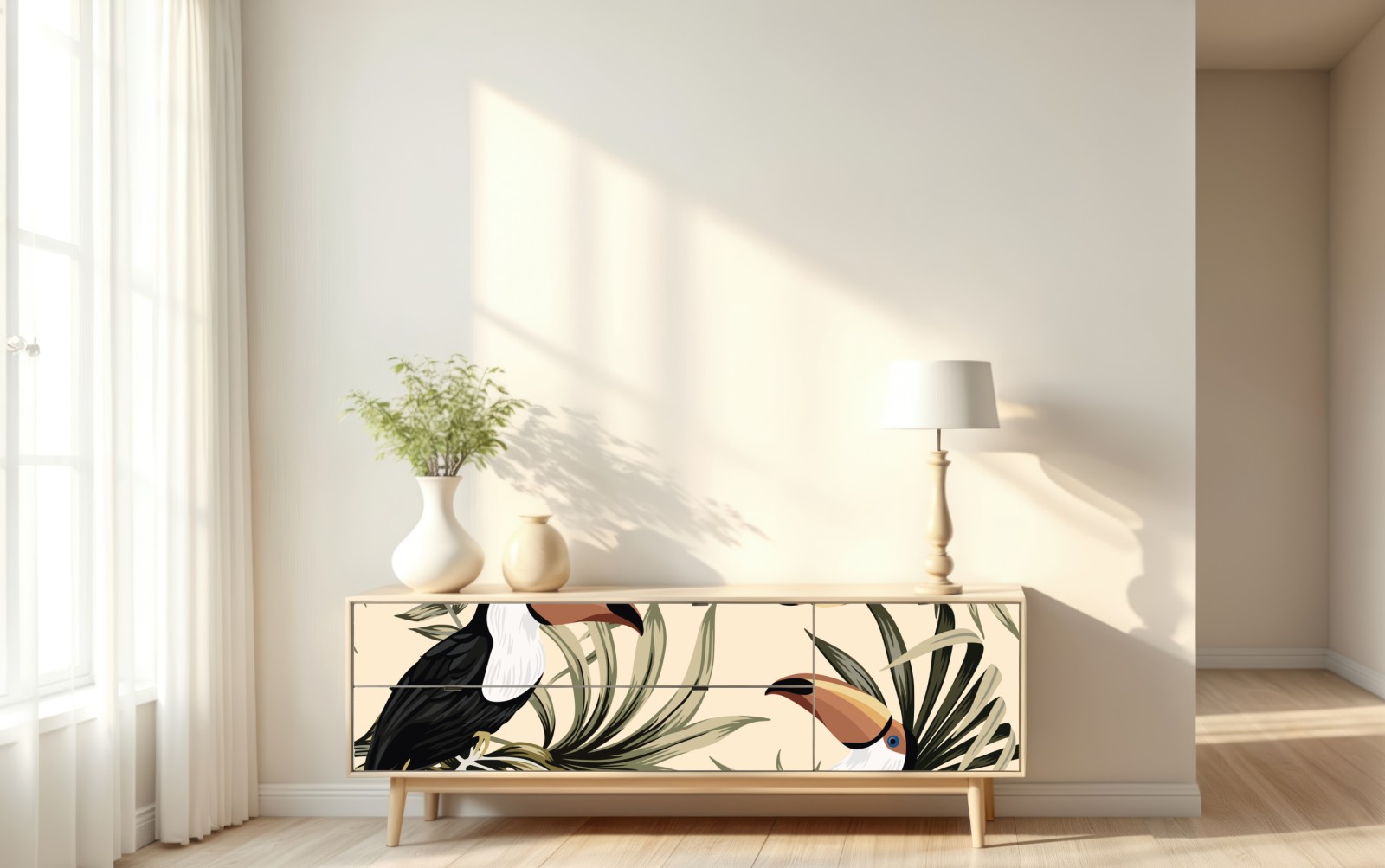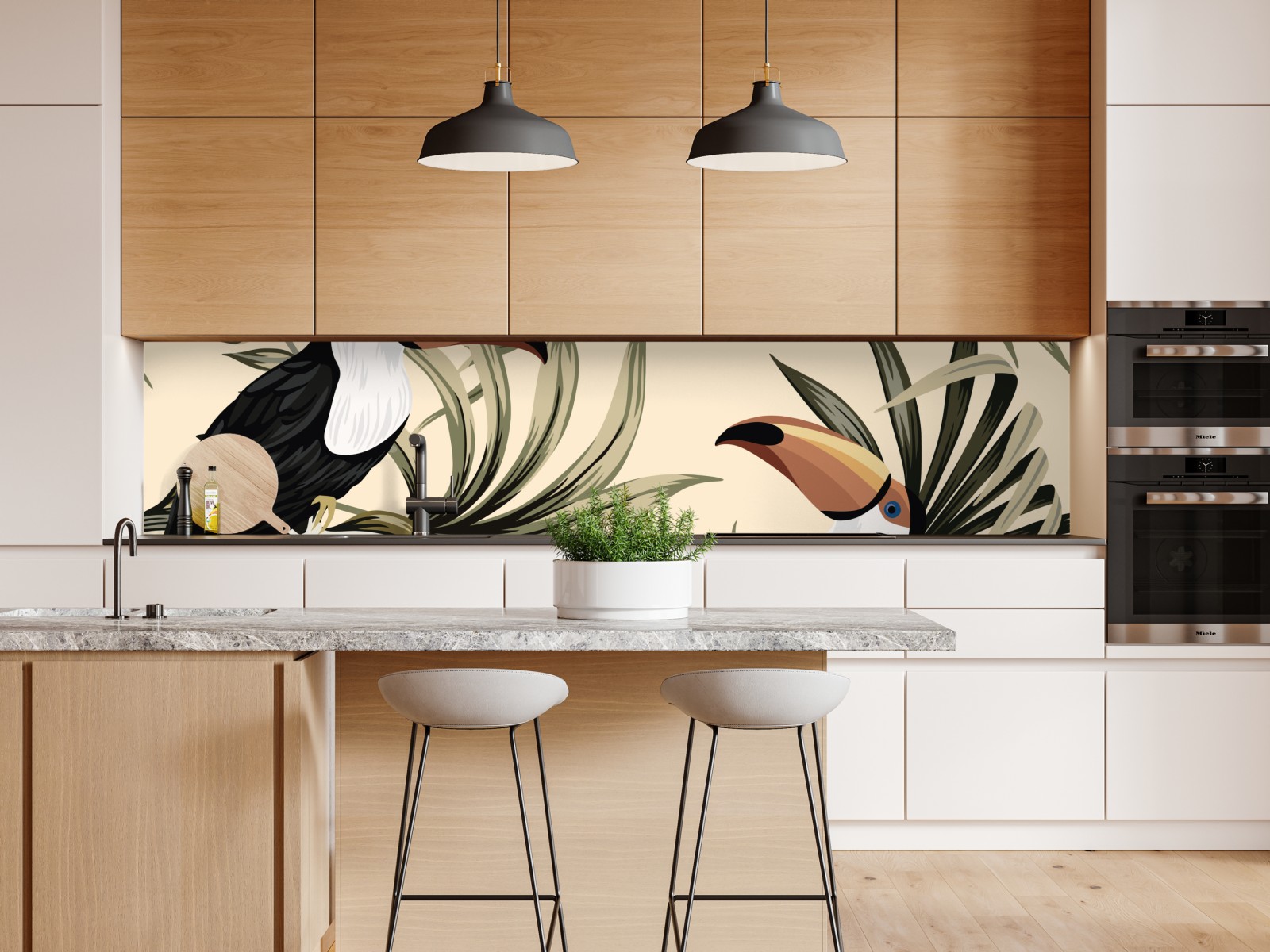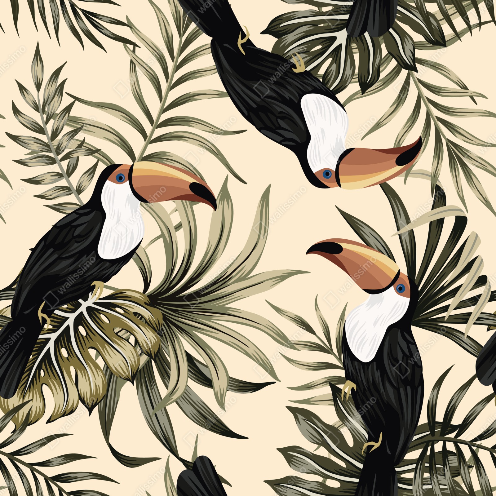 Lebhaftes tropisches Motiv mit Tukans und üppigem Blattwerk auf einem sanften beigen Hintergrund, perfekt, um Räumen Wärme und Dschungelcharme zu verleihen.