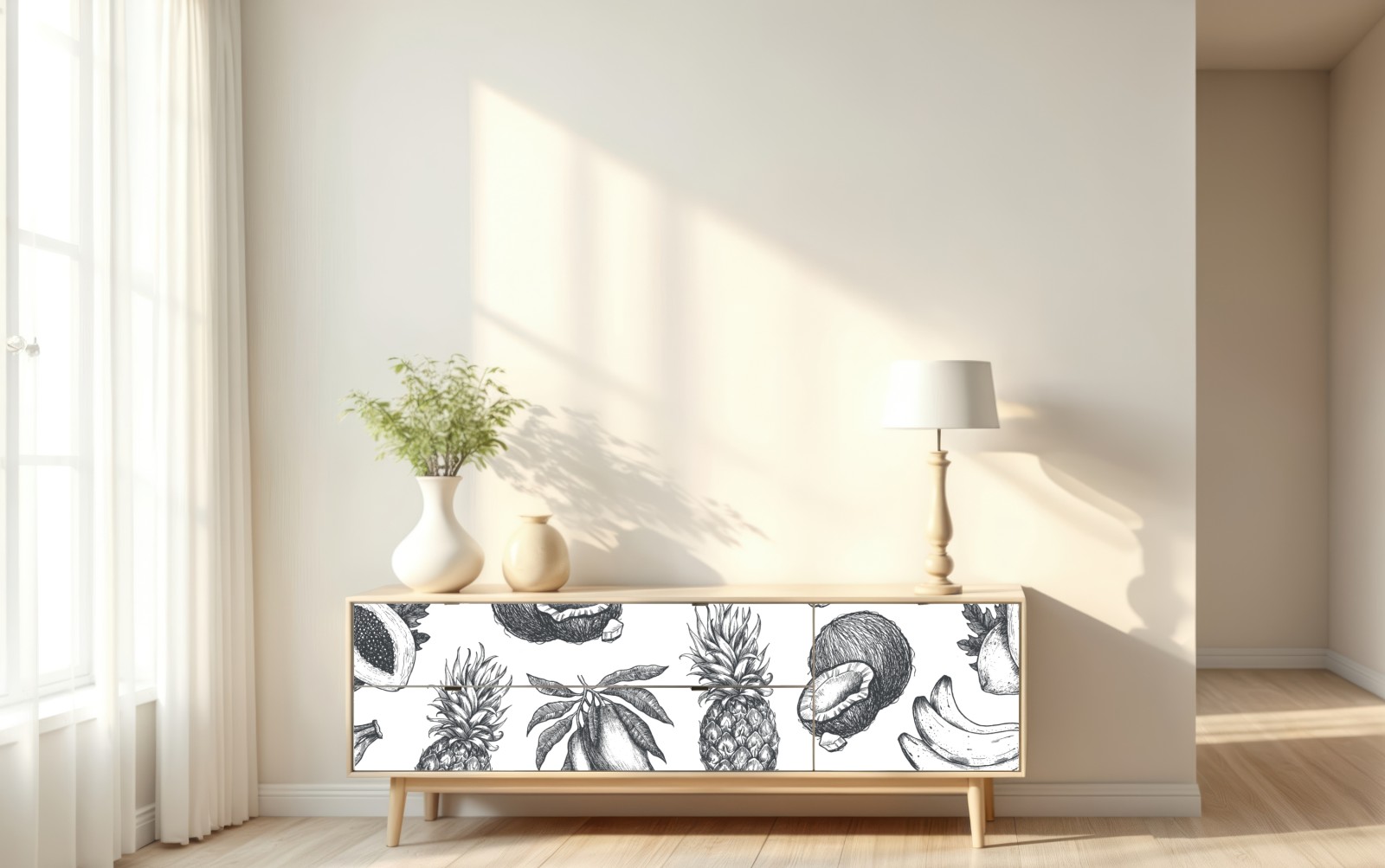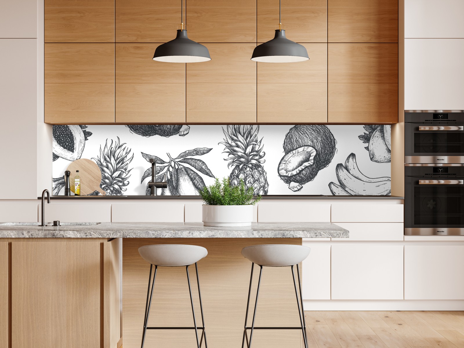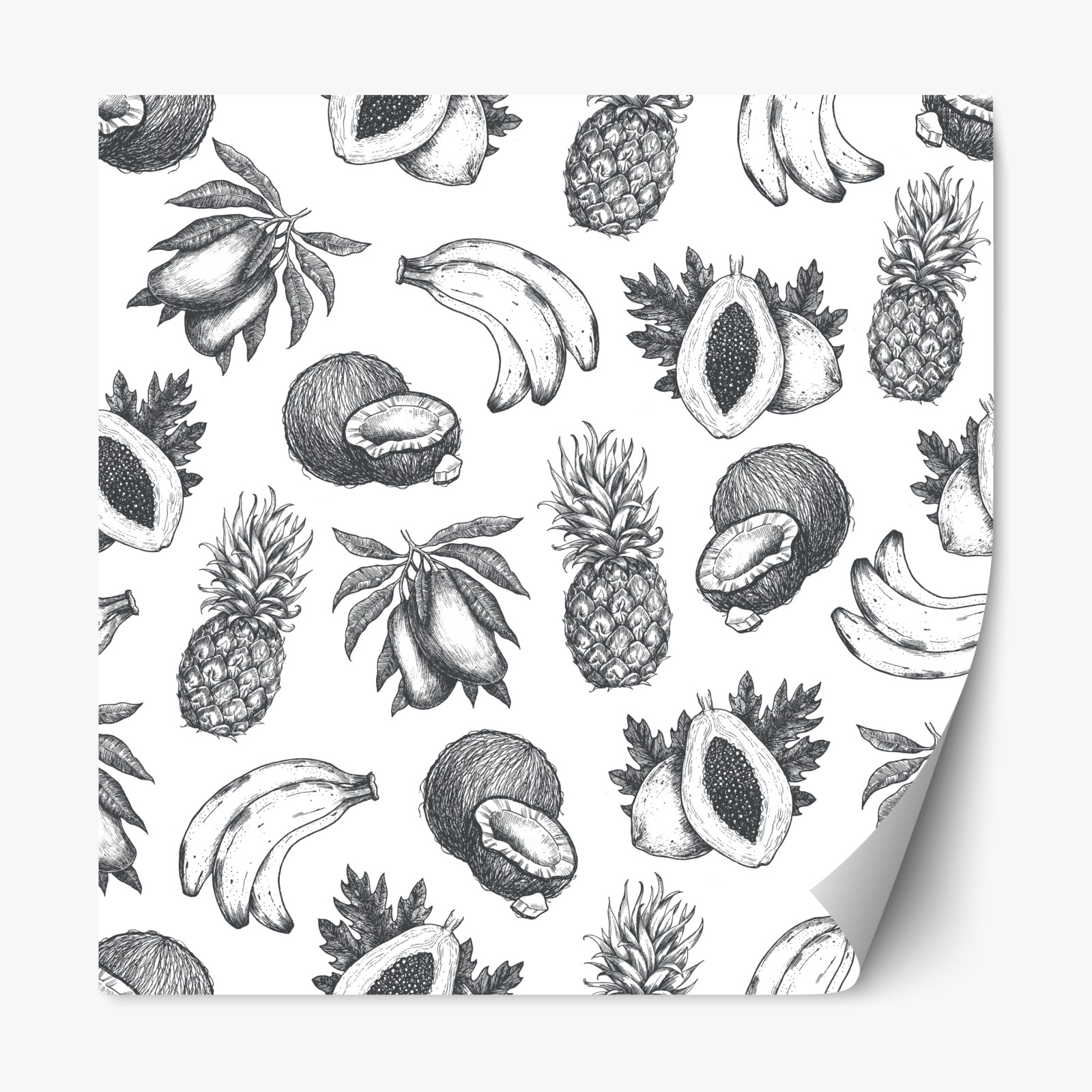 Elegantes handgezeichnetes Muster tropischer Früchte in monochromem Stil, perfekt für moderne Küche und Esszimmer.