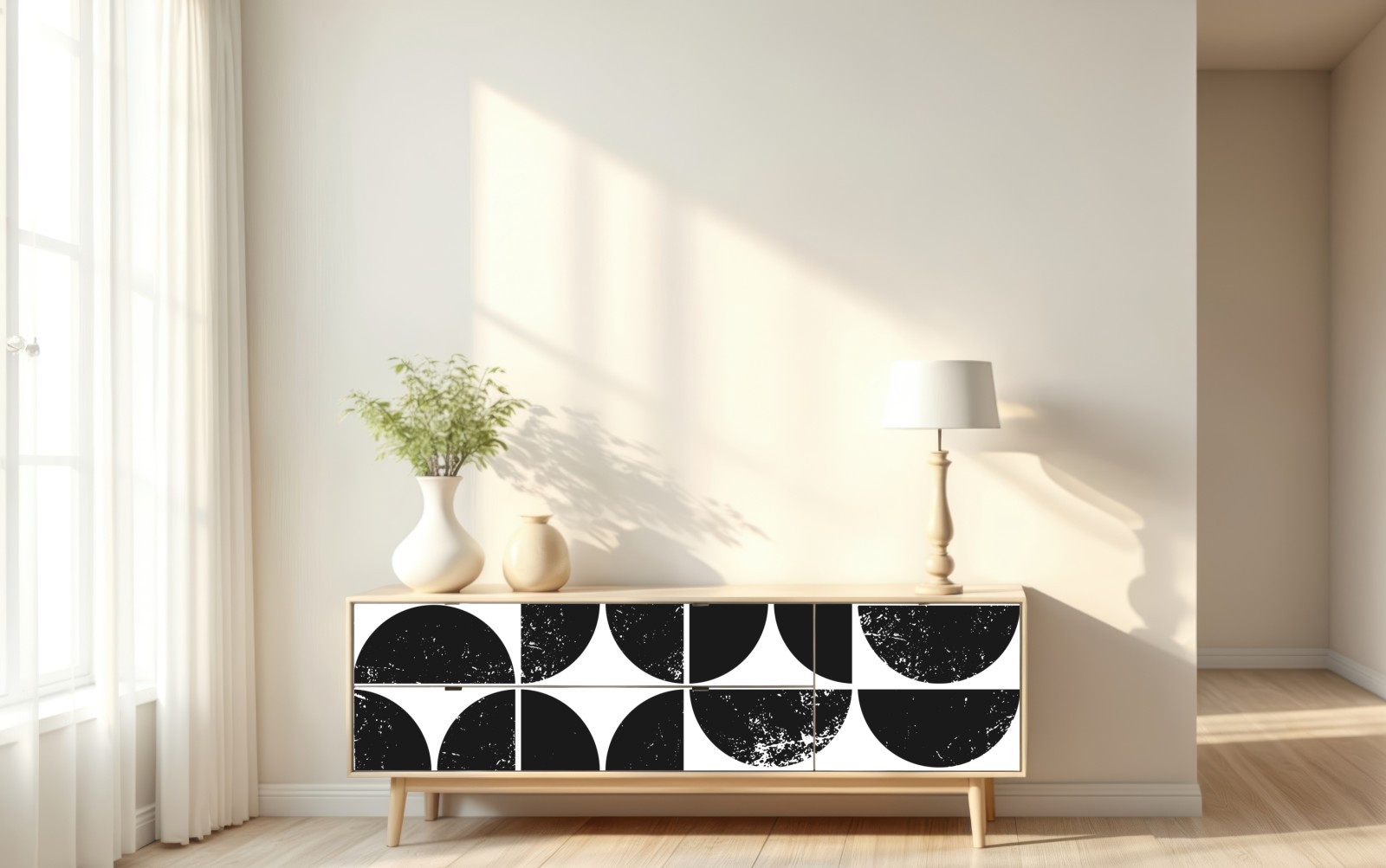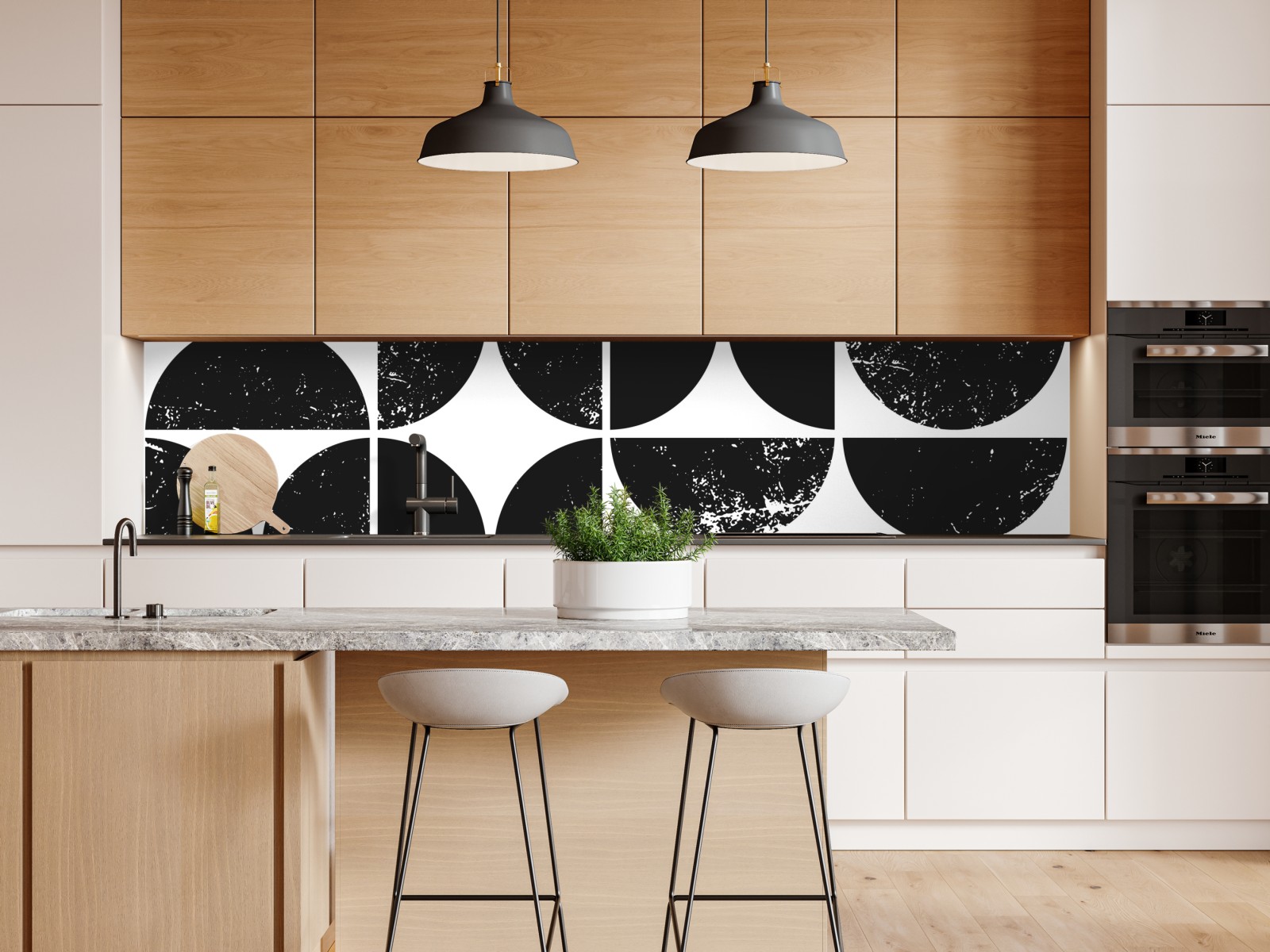 Kräftige schwarze Kreise mit verwitterter Textur schaffen ein modernes, minimalistisches Wandmotiv.