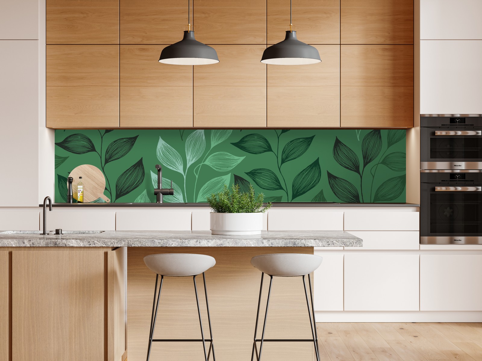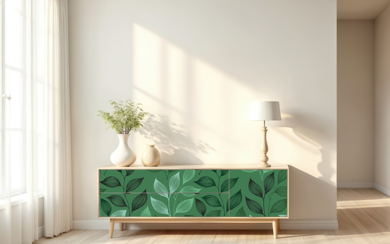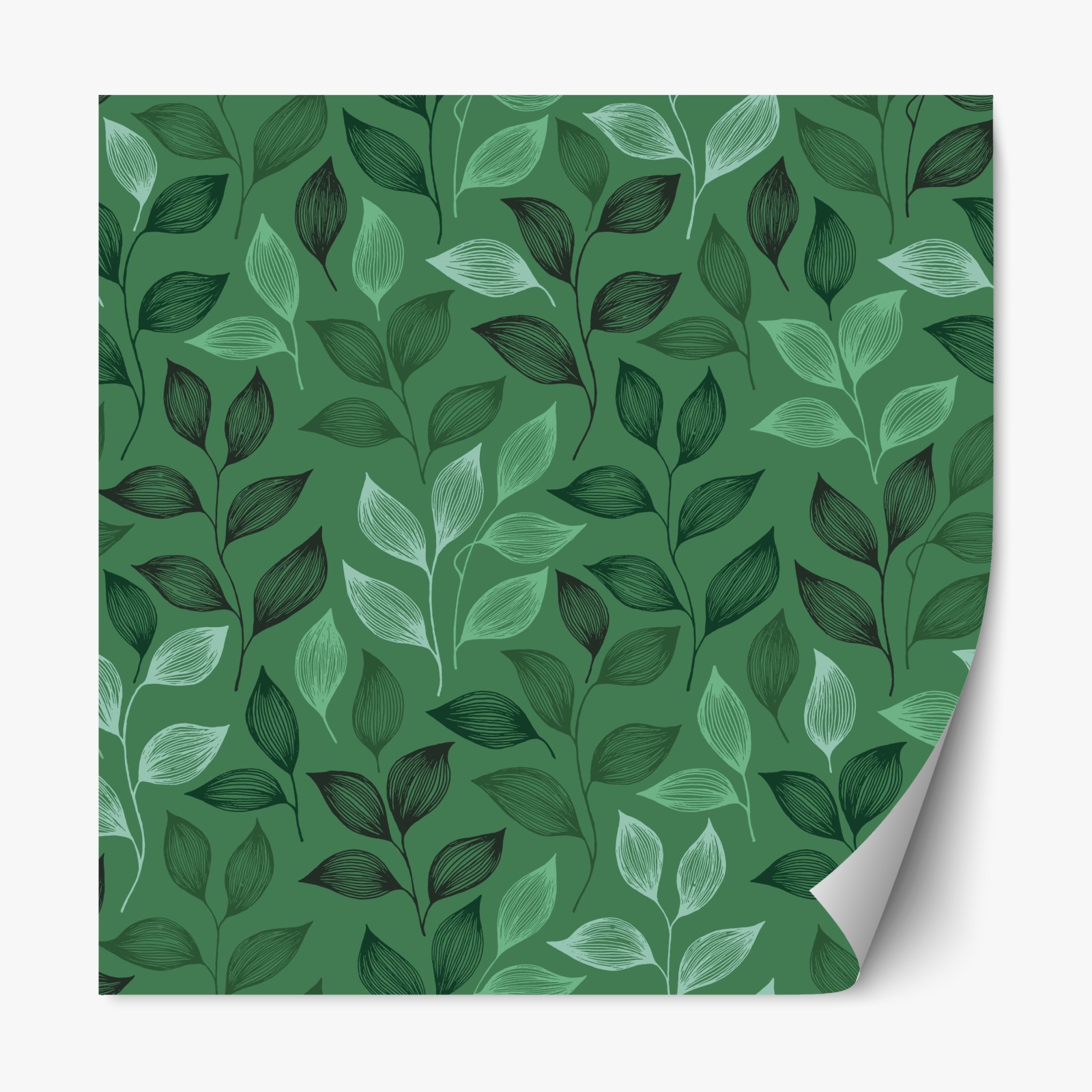 Elegantes grünes botanisches Muster mit handgezeichneten Blättern in verschiedenen Grüntönen, ideal um natürliche Ruhe in jedes Interieur zu bringen.