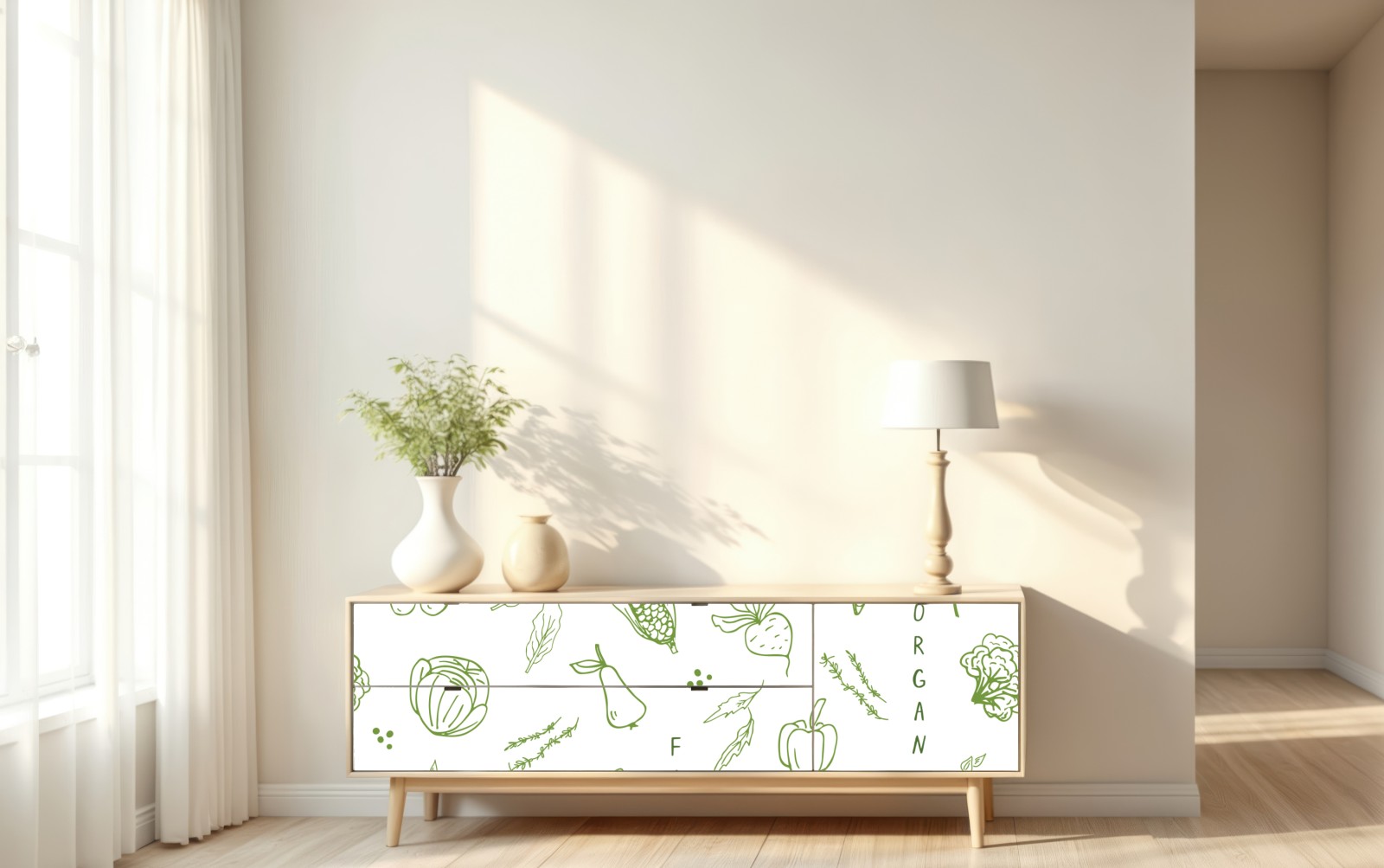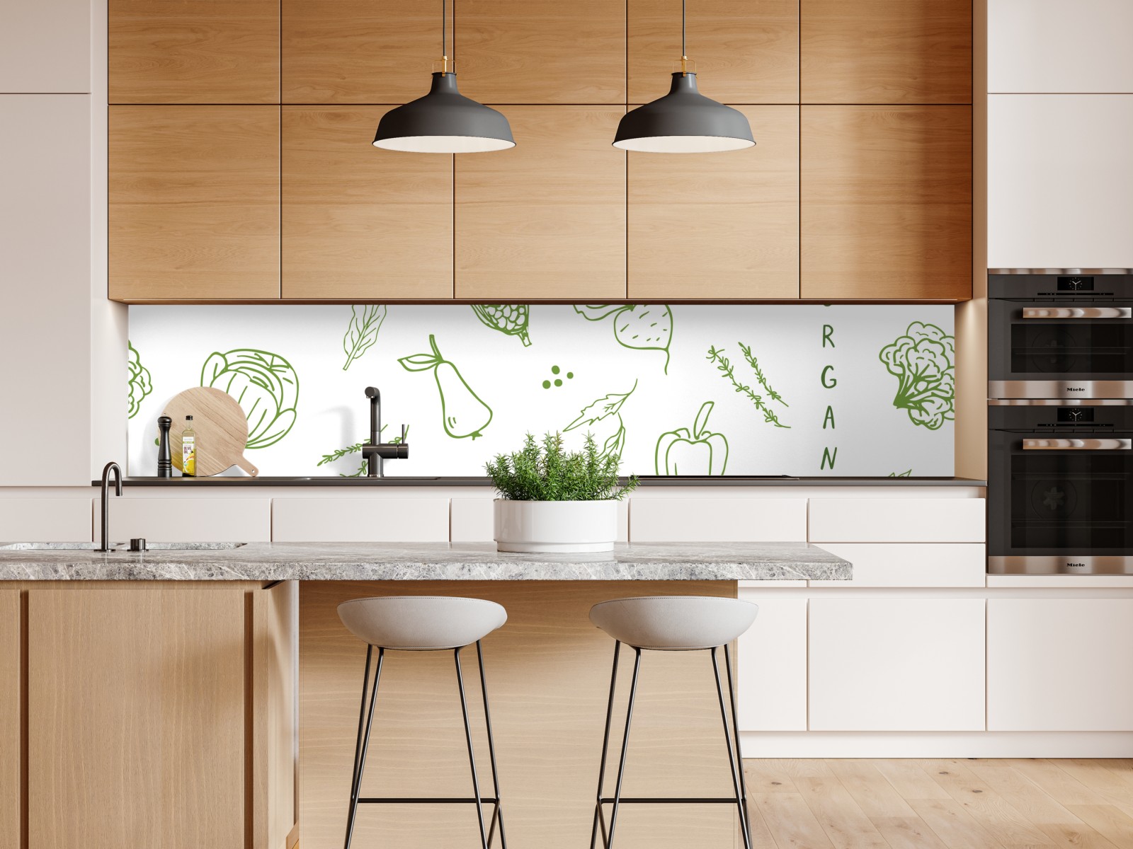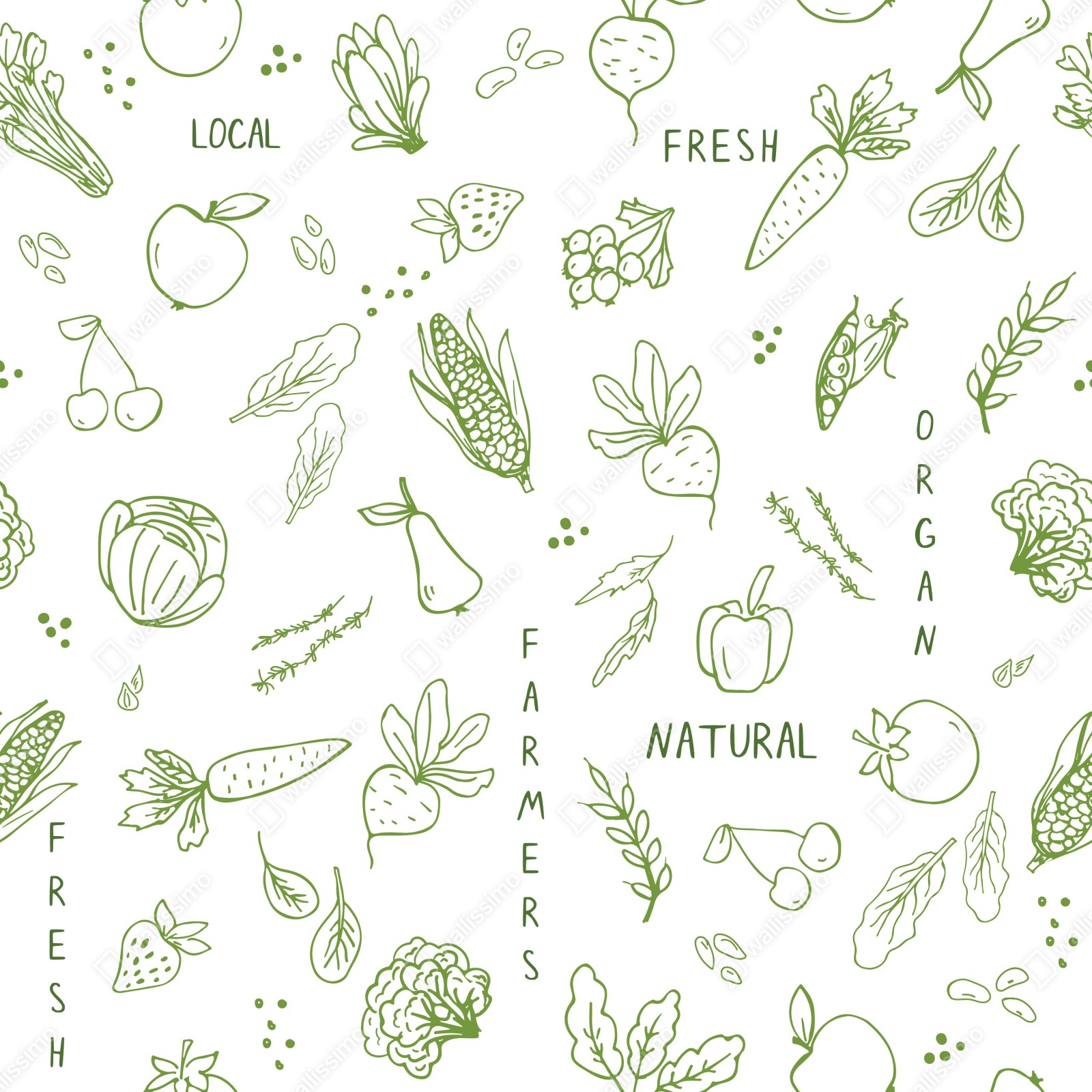 Frische grüne Linienzeichnungen von Gemüse und Obst auf weißem Hintergrund, ideal für Küchendekor und gesundheitsorientierte Motive.