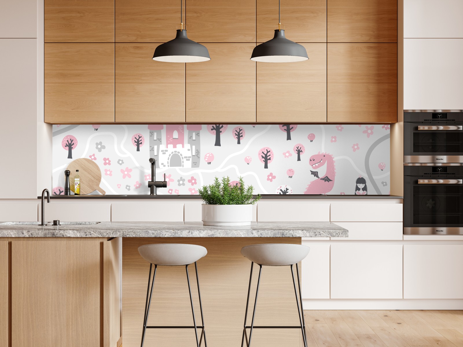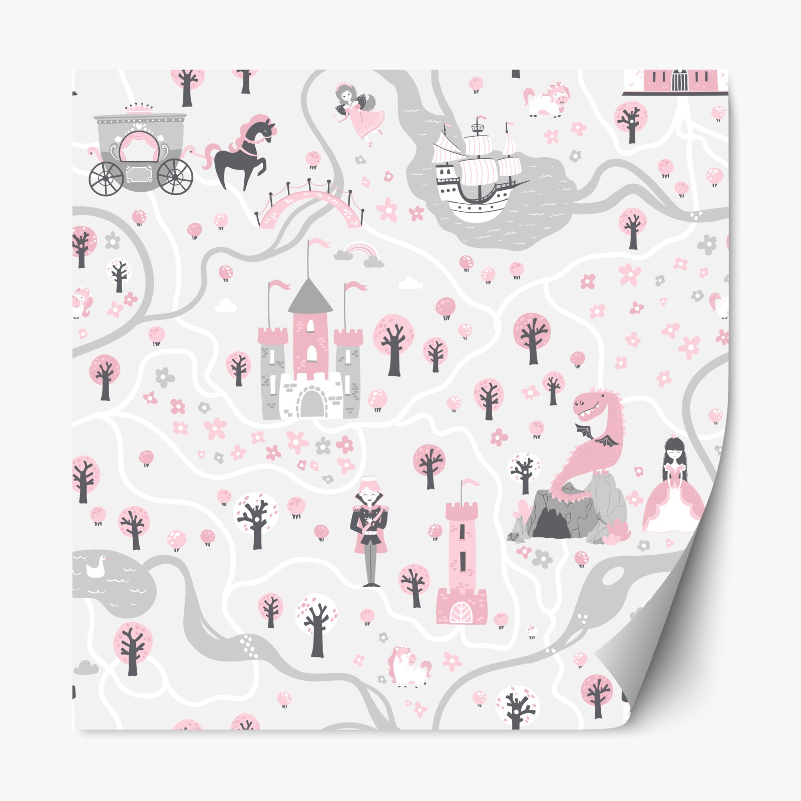 zauberhafte pastell-märchenkarte mit schlössern, drachen und prinzessinnen, perfekt fürs kinderzimmer.